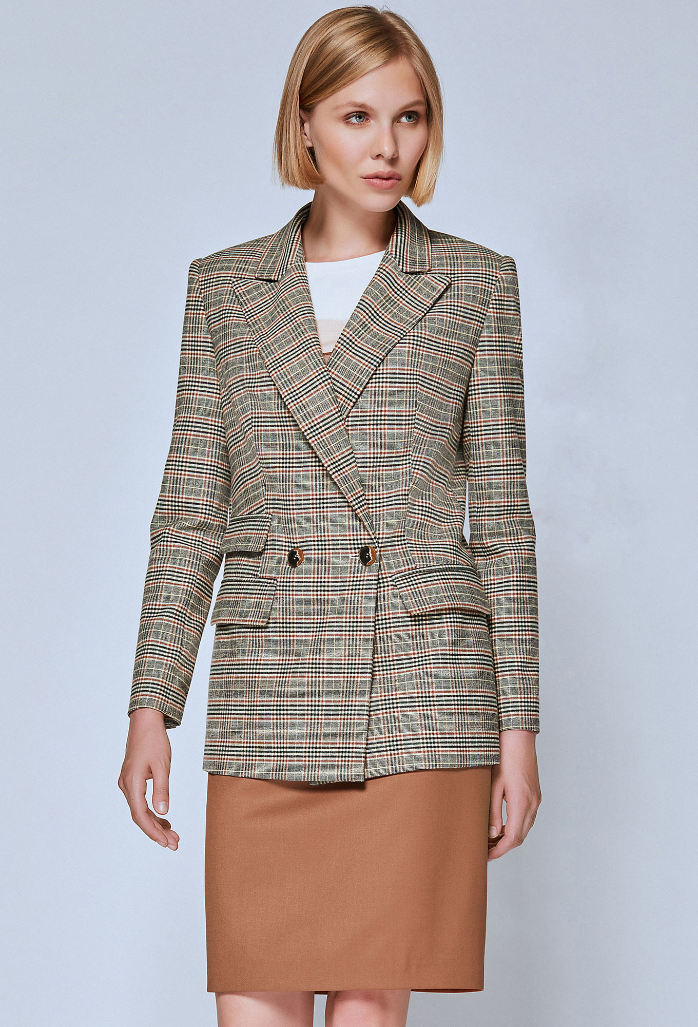 - комфортный двубортный жакет с застежкой на петли и пуговицы, перед с двумя горизонтальными карманами с рамками и клапанами и одним карманом-обманкой и рамками и клапаном, рукава втачные одношовные, воротник отложной с лацканами, на подкладке.