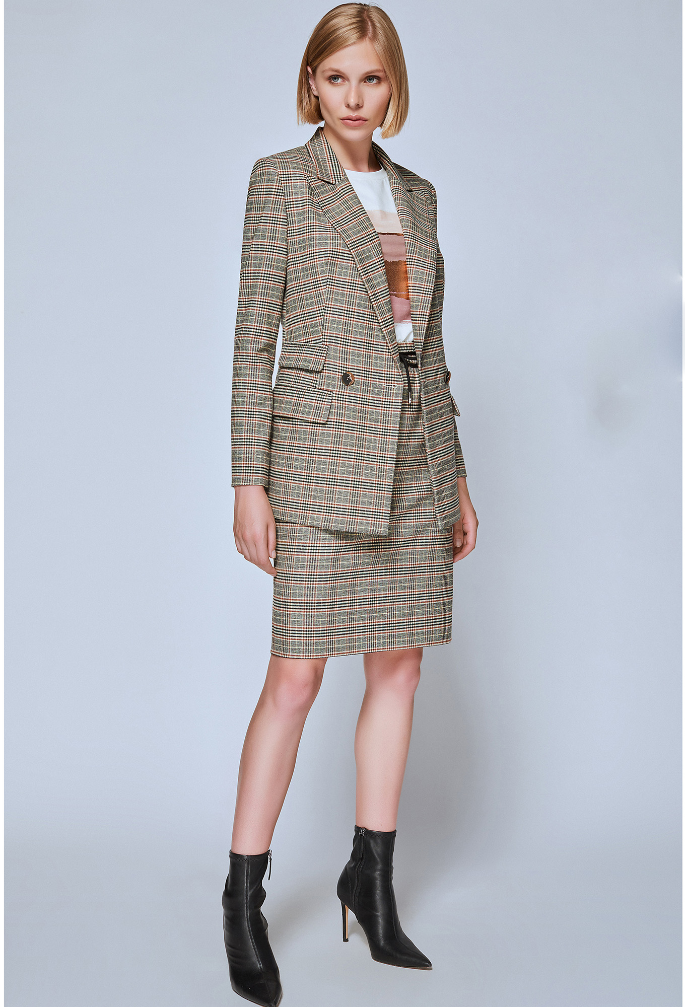 - юбка на эластичном поясе с кулисой, передняя половинка с косыми карманами, средний шов задней половинки заканчивается шлицей, на подкладке.