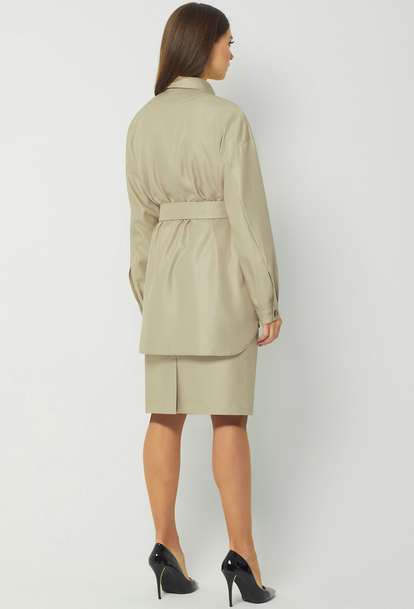 Модель: Базалини 4245/4319 песочный <..показатьli>Рост: 170 см (девушка на фото 170см) Сезон: Круглогодичный Тип ткани: Полиэстер- 65%, Вискоза- 32% , Эластан- 3%Жакет свободного кроя, со спущенной линией плеча и разным уровнем низа переда и спинки. Перед с центральной застежкой на петли и пуговицы и двумя накладными карманами с клапанами и декоративными пуговицами. Рукава рубашечного типа с манжетами и застёжкой на петли-пуговицы. Воротник отложной с отрезной стойкой. Дополняется поясом с пряжкой из основной ткани.Юбка на эластичном поясе с кулисой. Передняя половинка с косыми карманами. Средний шов задней половинки заканчивается шлицей. На подкладке.