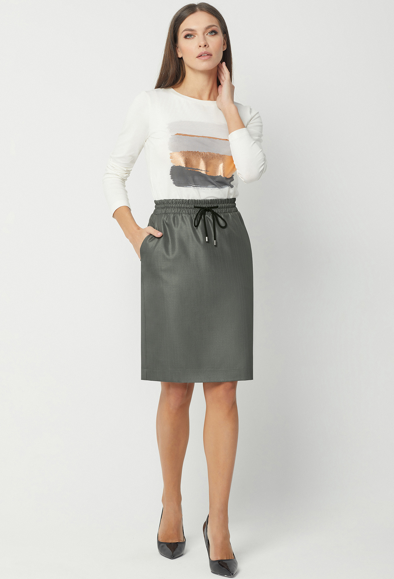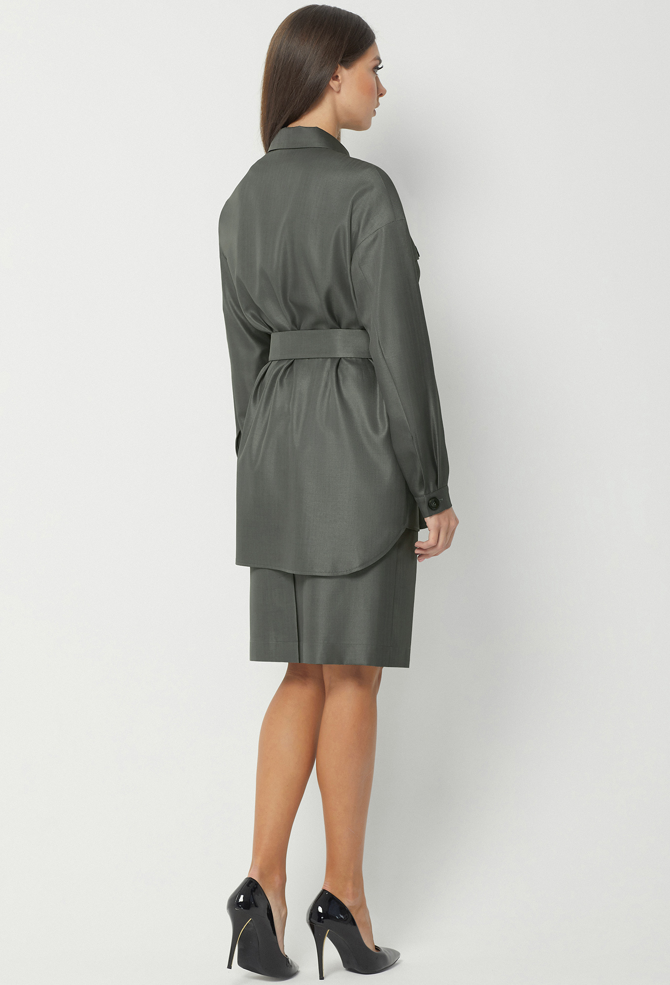Модель: Базалини 4245/4319 серый-хаки..показать Рост: 170 см (девушка на фото 170см) Сезон: Круглогодичный Тип ткани: Полиэстер- 65%, Вискоза- 32% , Эластан- 3%Жакет свободного кроя, со спущенной линией плеча и разным уровнем низа переда и спинки. Перед с центральной застежкой на петли и пуговицы и двумя накладными карманами с клапанами и декоративными пуговицами. Рукава рубашечного типа с манжетами и застёжкой на петли-пуговицы. Воротник отложной с отрезной стойкой. Дополняется поясом с пряжкой из основной ткани.Юбка на эластичном поясе с кулисой. Передняя половинка с косыми карманами. Средний шов задней половинки заканчивается шлицей. На подкладке.