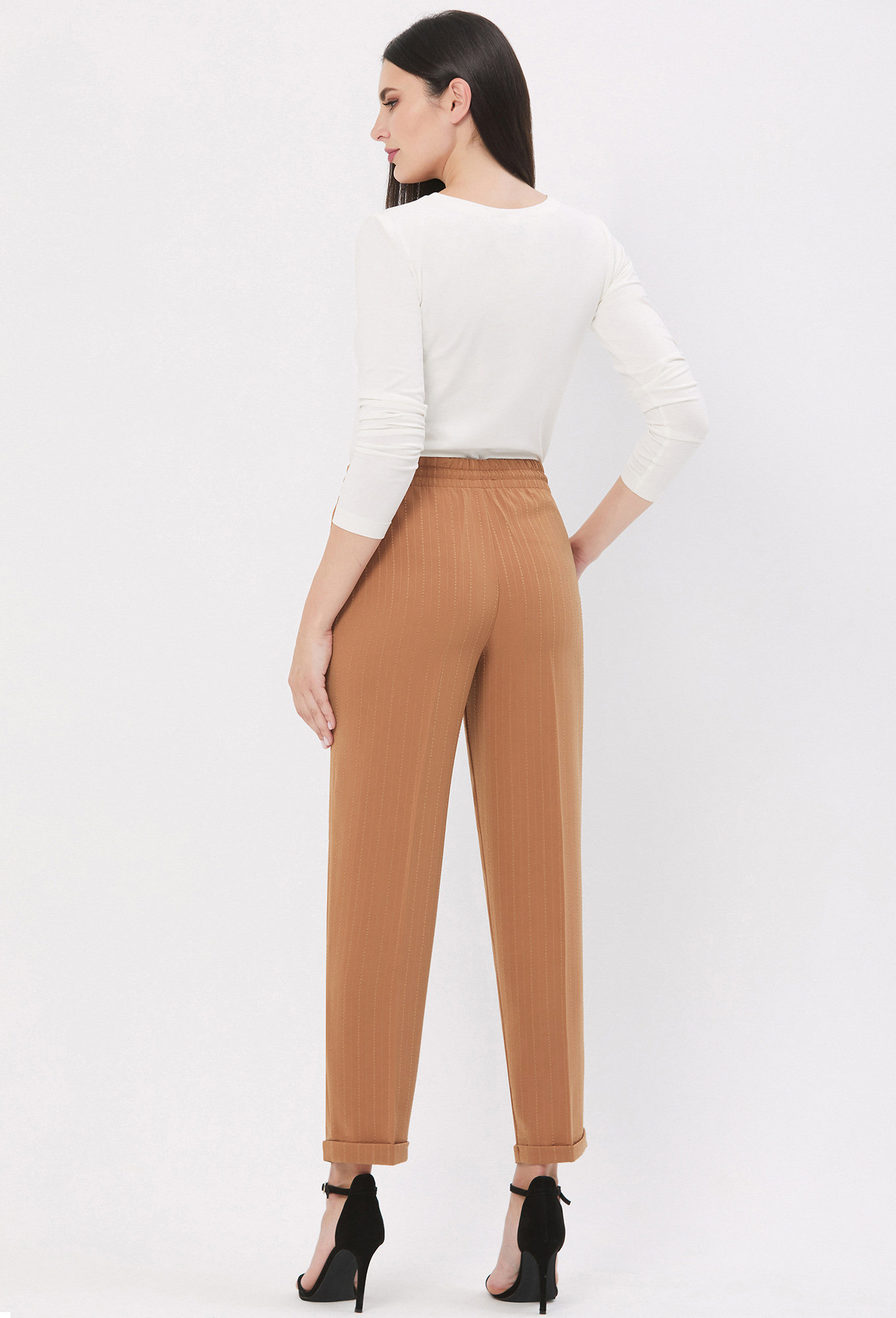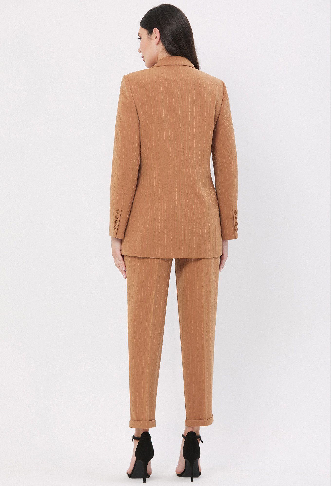 Модель: Базалини 4250/3695 коричнево-бежев..показатьый Рост: 170 см (девушка на фото ростом 170см) Сезон: Круглогодичный Тип ткани: 65% полиэстер, 32% вискоза, 3% эластанЖакет - комфортный двубортный жакет с застежкой на петли и пуговицы. Перед с карманами с рамками. Рукава втачные двушовные со шлицами и отделочными пуговицами. Воротник отложной с лацканами,на подкладке. Свободные брюки со стрелками на поясе, сосборенном на резинке, кулисой, манжетами, по передним частям два вертикальных прорезных кармана с листочками.