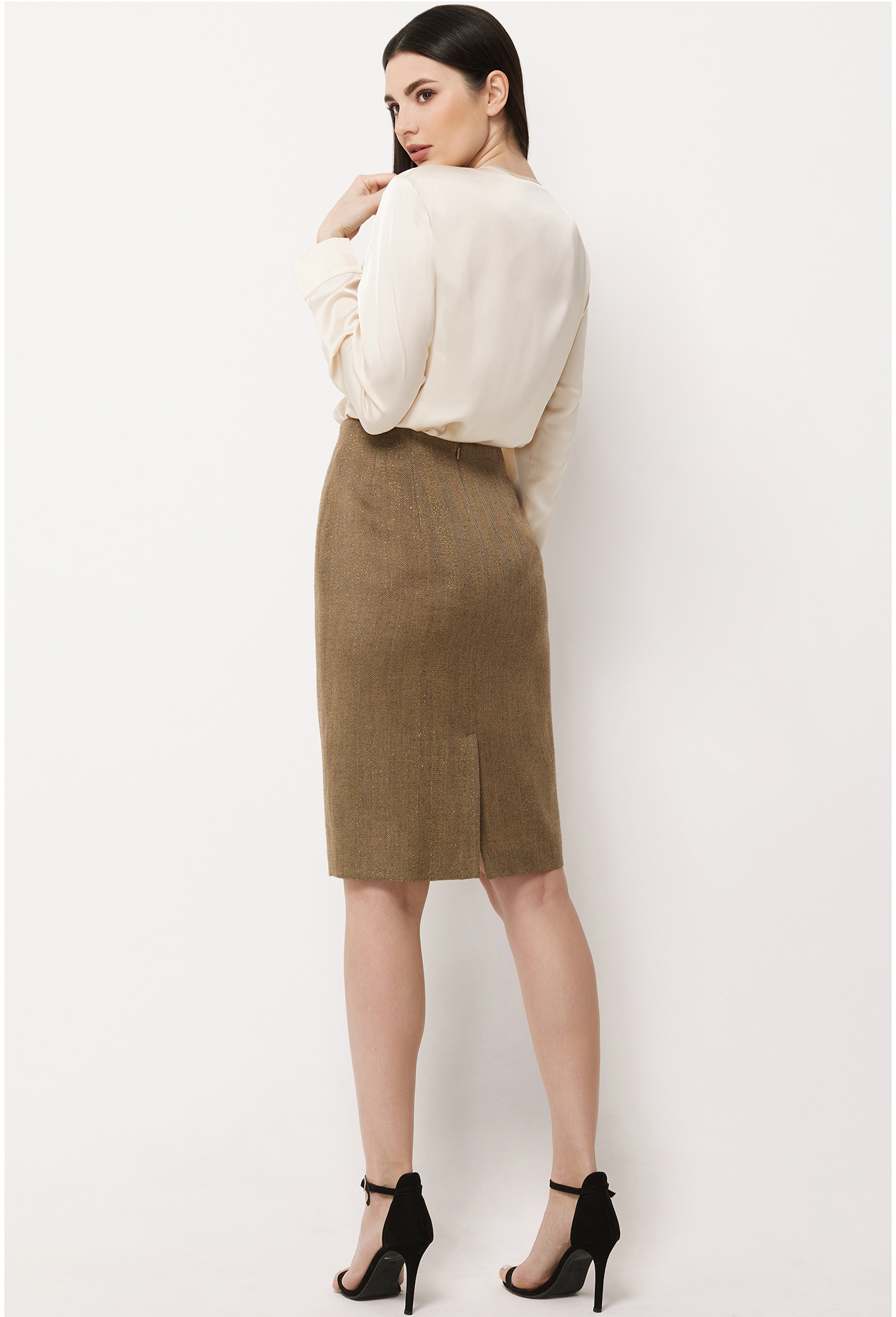 Юбка карандаш на обтачке, в среднем шве спинки обработана потайная молния и шлица, на подкладке.