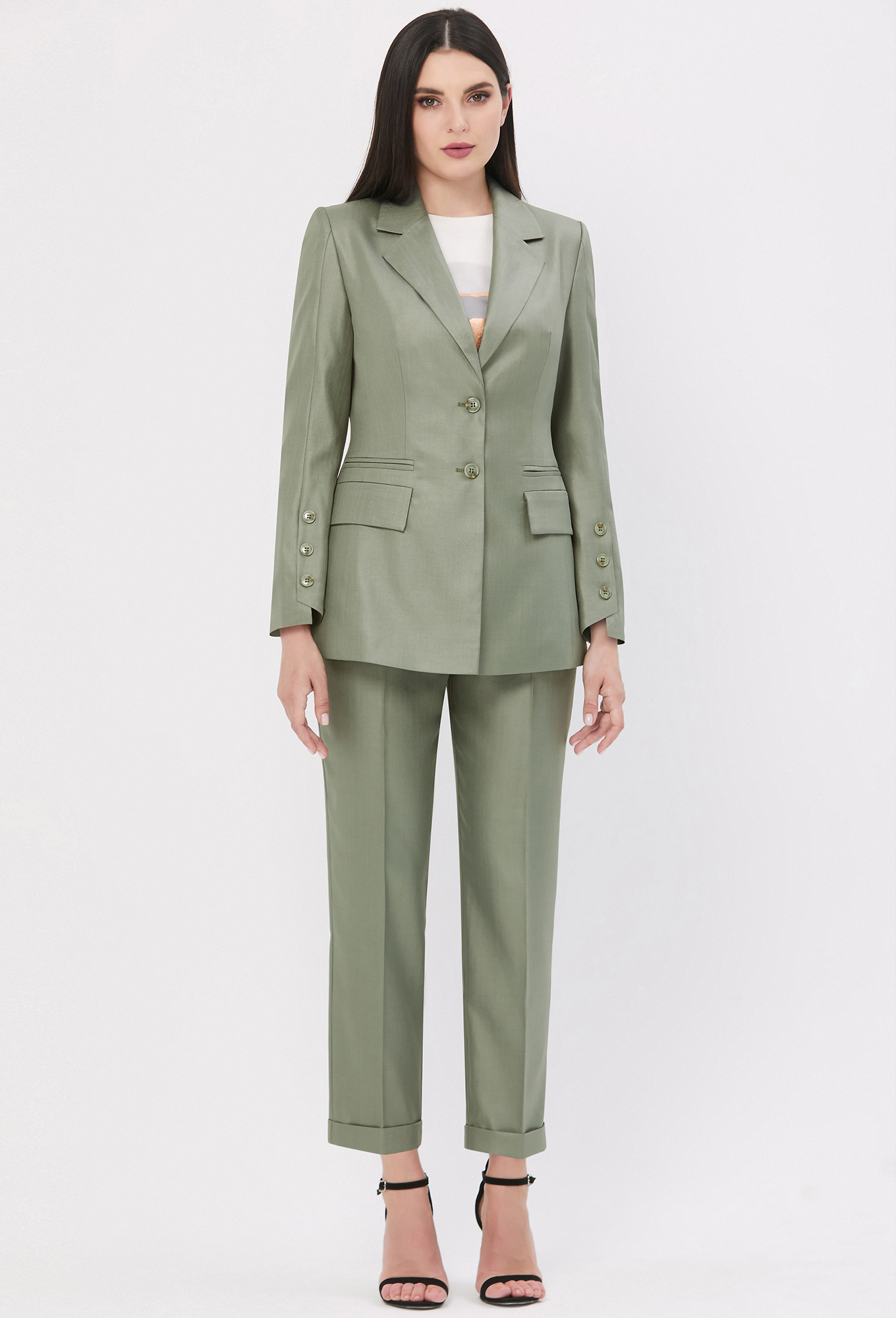 Модель: Базалини 4445/4365 хаки Р..показатьост: 170 см (девушка на фото ростом 170см) Сезон: Круглогодичный Тип ткани: 65% полиэстер, 32% вискоза, 3% эластанИнтересный однобортный жакет полуприлегающего силуэта. Более женственной данную модель делают округлые лацканы, а новое звучание придают смещенные вперед шлицы с отделочными пуговицами и фигурная форма низа рукавов. Жакет с застежкой на петли-пуговицы, с двумя функциональными карманами с клапанами и с двумя карманами обманками. На подкладке.