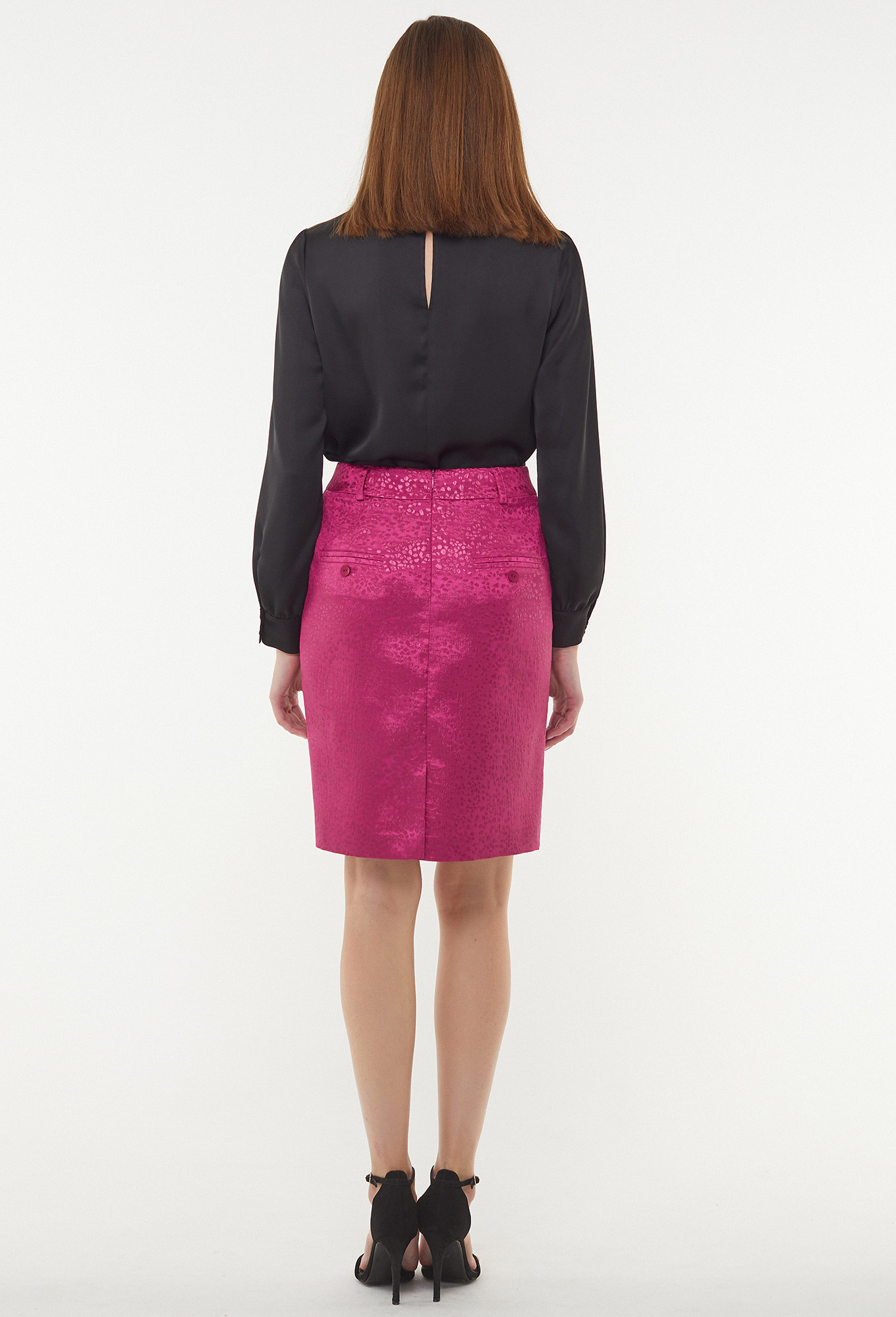 Юбка с притачным поясом со шлёвками. Передняя половинка с косыми карманами. Задняя половинка с двумя горизонтальными с рамками и двумя отделочными пуговицами со среднем швом, в котором обработаны потайная молния и шлица.