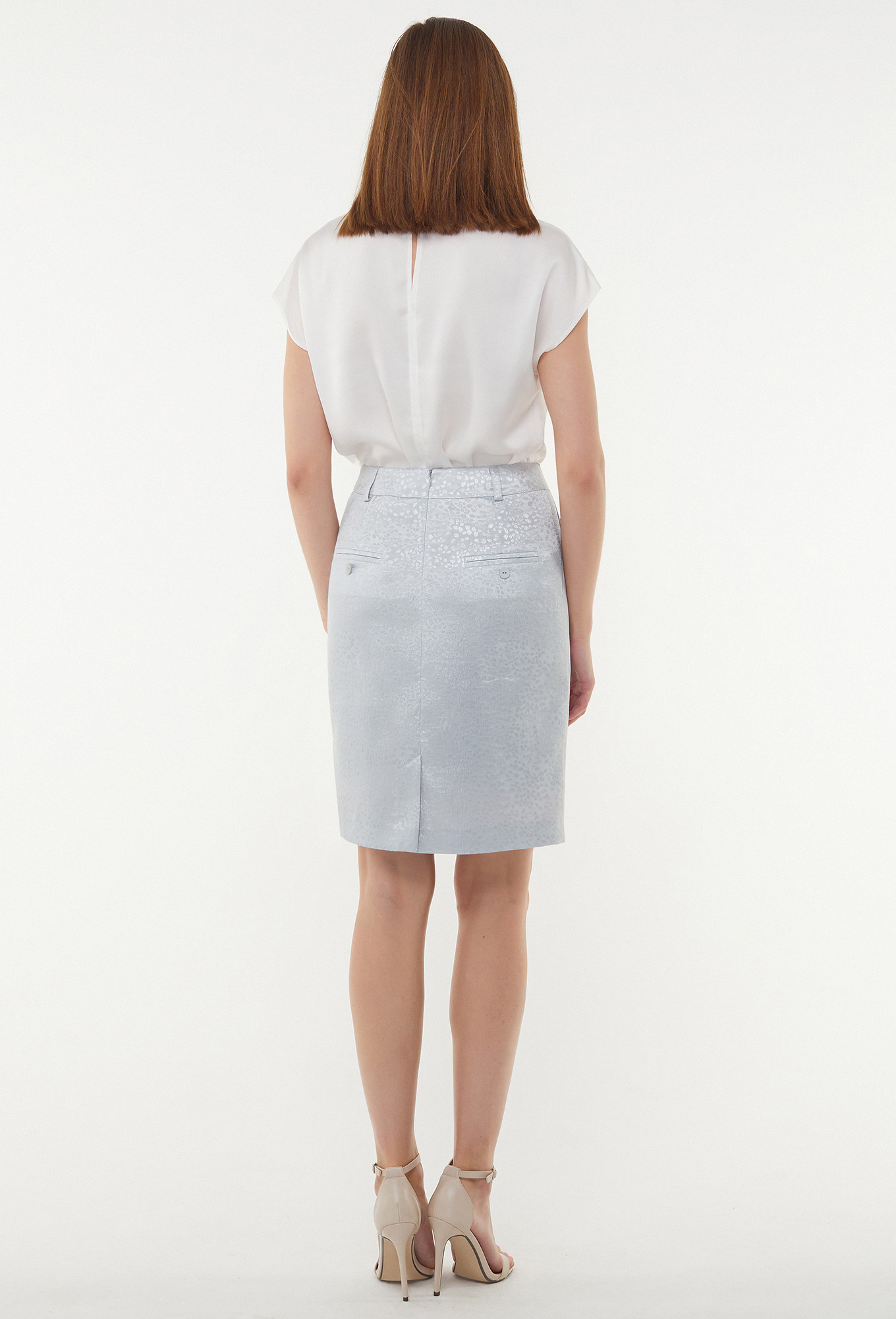 Юбка с притачным поясом со шлёвками. Передняя половинка с косыми карманами. Задняя половинка с двумя горизонтальными с рамками и двумя отделочными пуговицами со среднем швом, в котором обработаны потайная молния и шлица.
