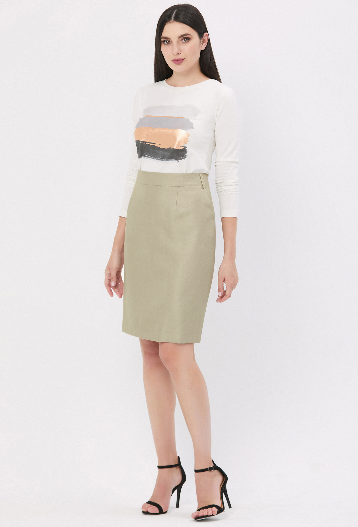 У юбки передняя половина с косыми карманами, в среднем шве задней половины юбки обработаны потайная молния и шлица. На подкладке.