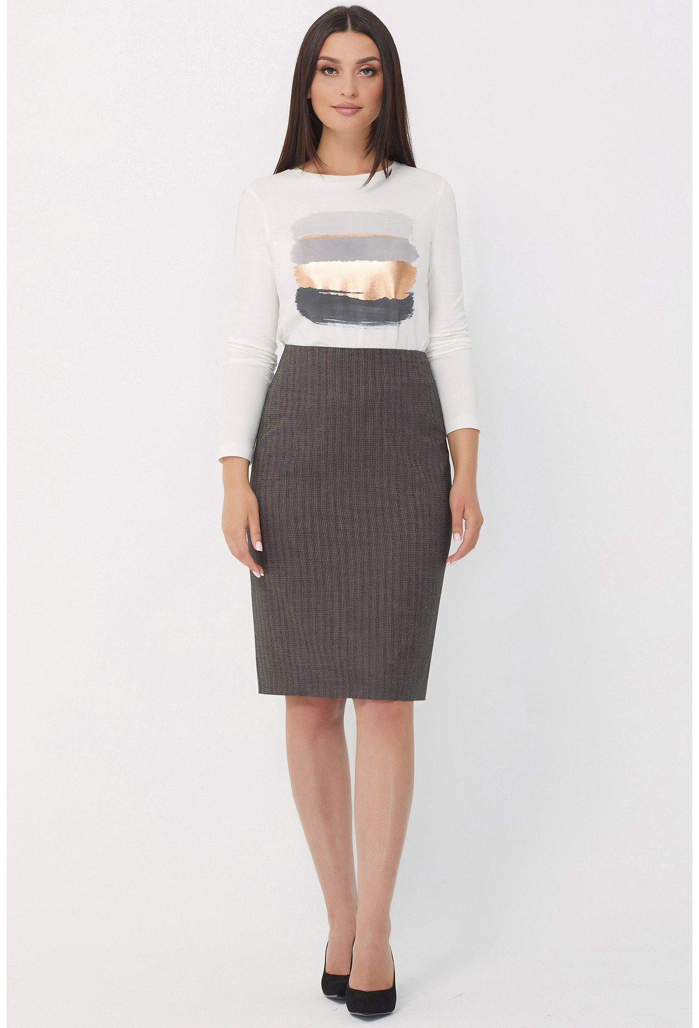 Юбка-крандаш на обтачке, в среднем шве спинки обработана потайная молния и шлица, на подкладке. Юбка-карандаш со слегка завышенной линией талии. На подкладе