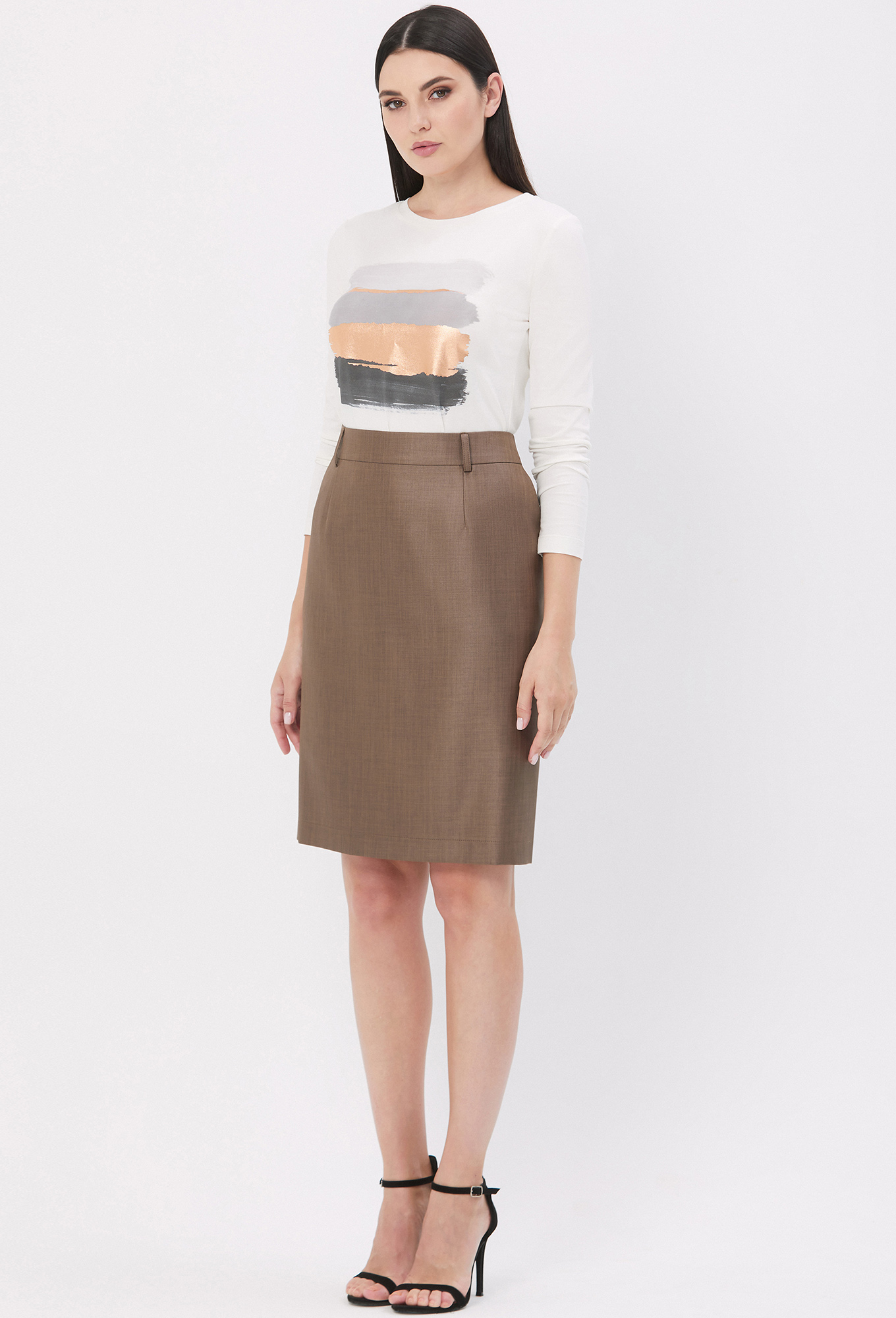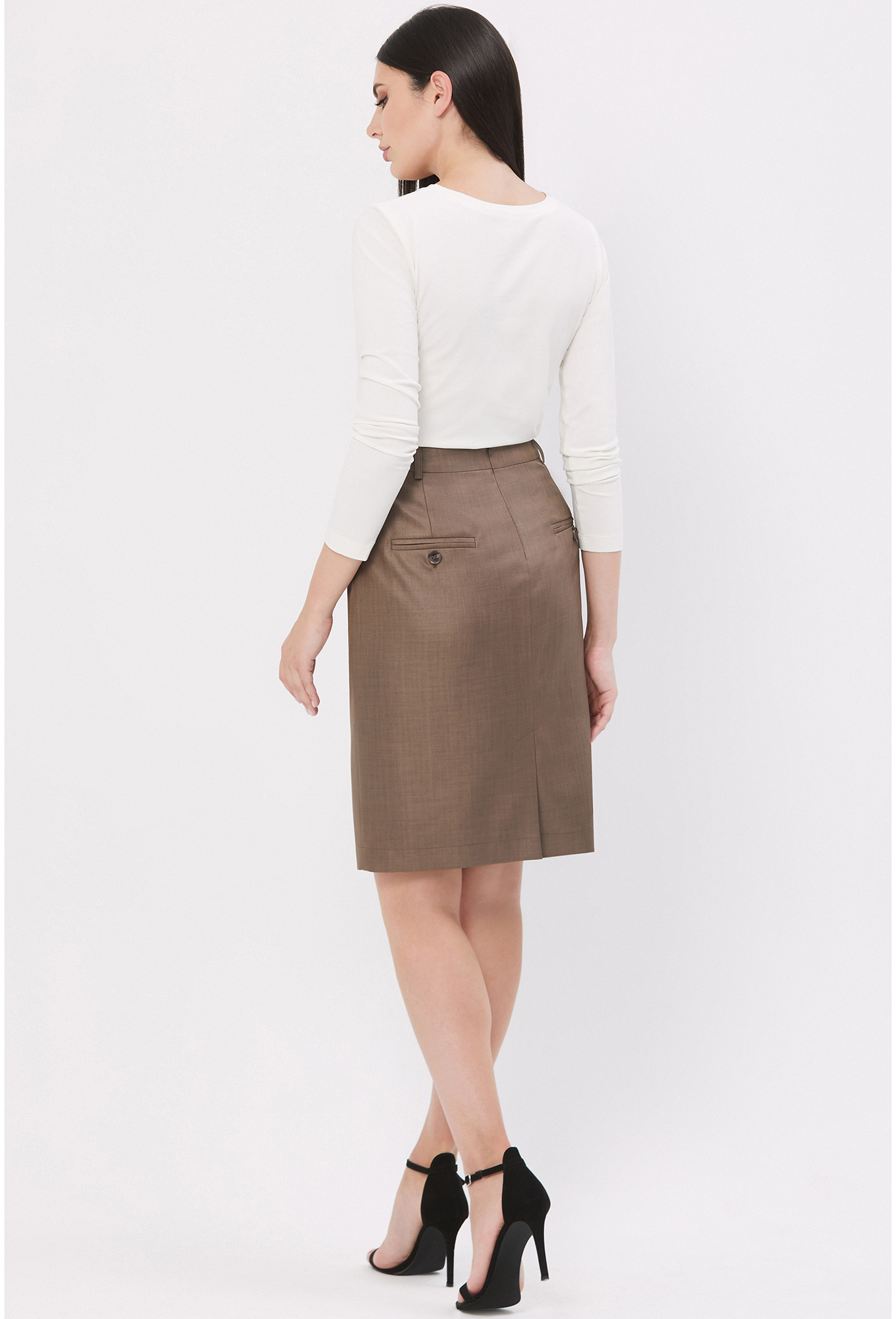 У юбки передняя половина с косыми карманами, в среднем шве задней половины юбки обработаны потайная молния и шлица. На подкладке.