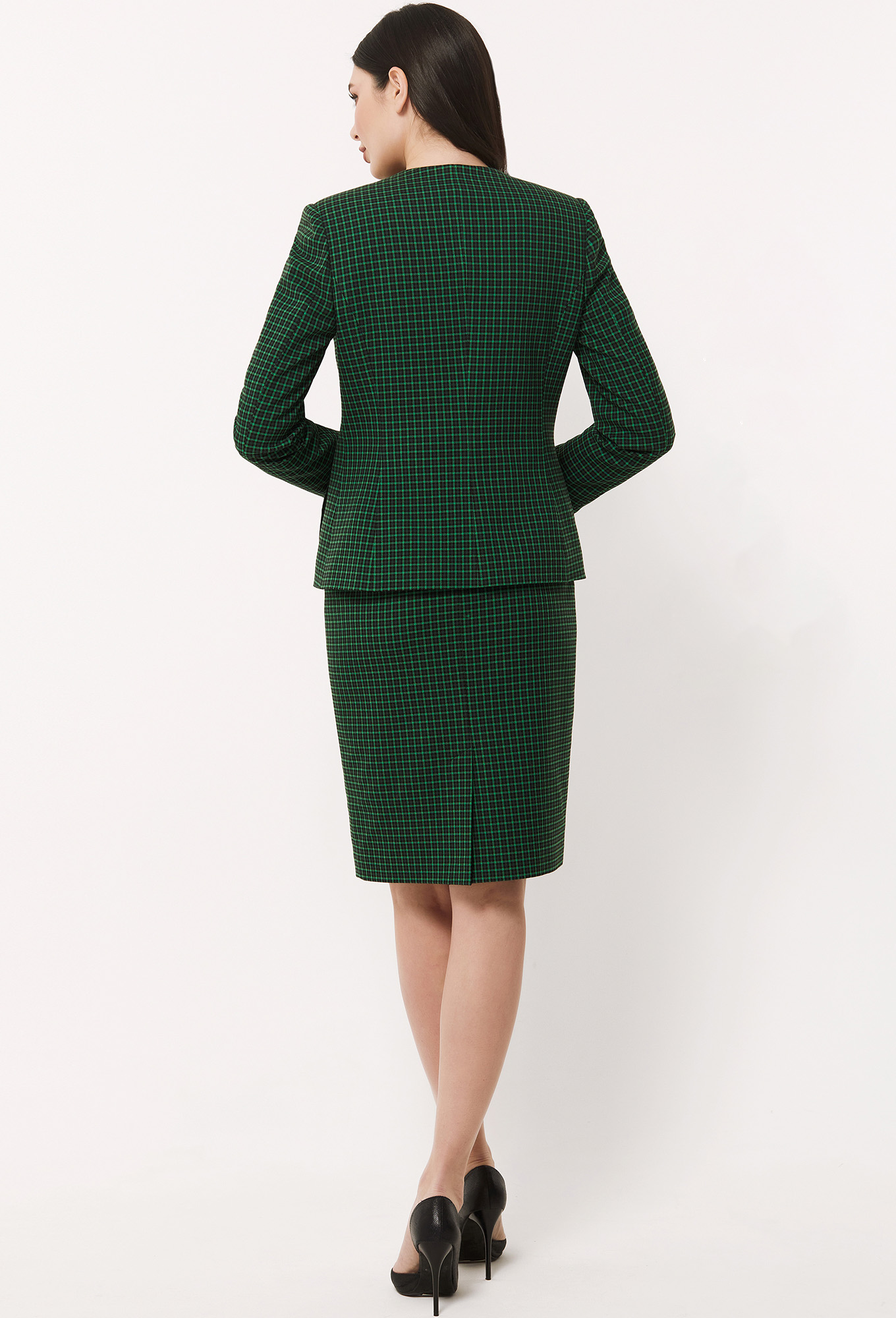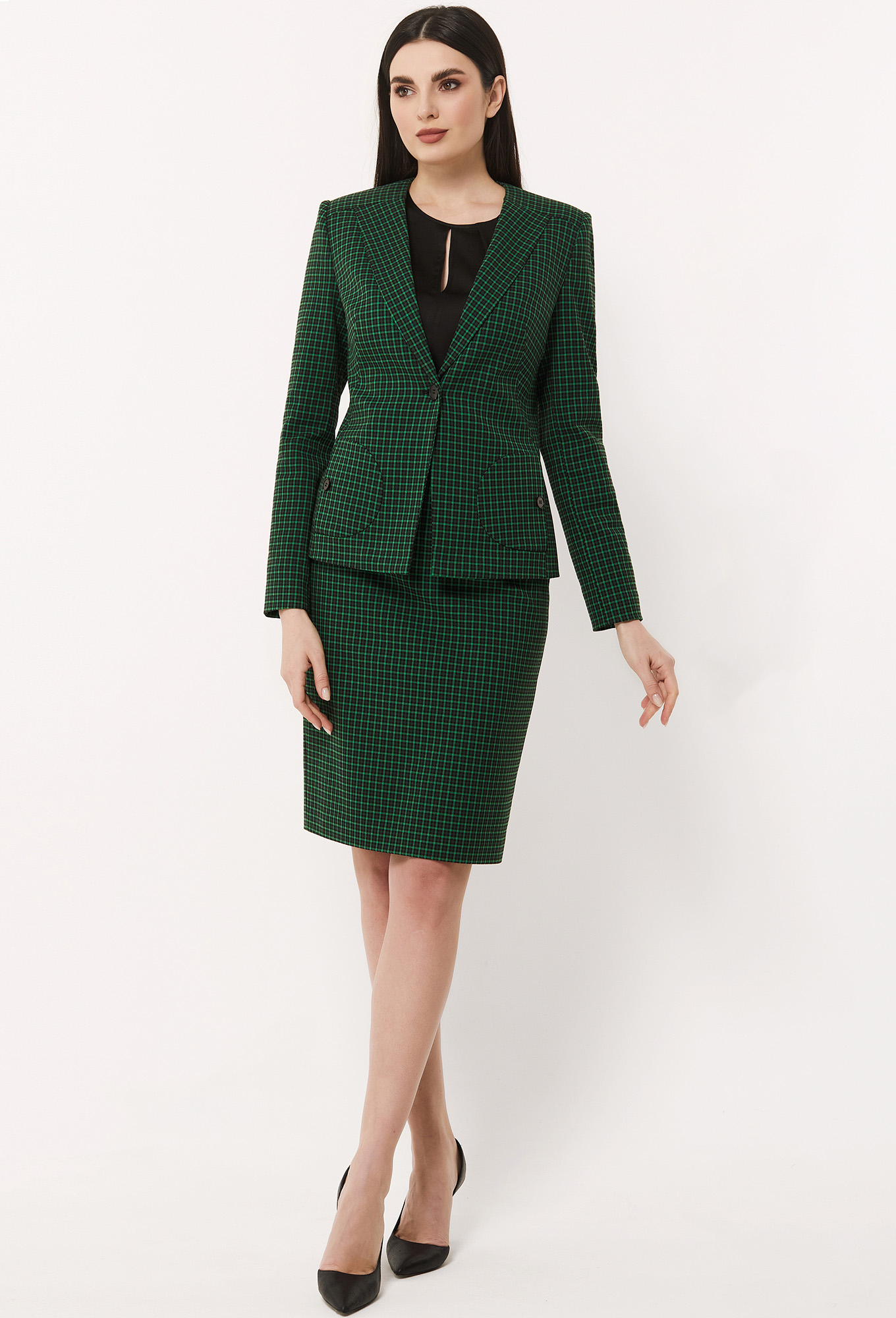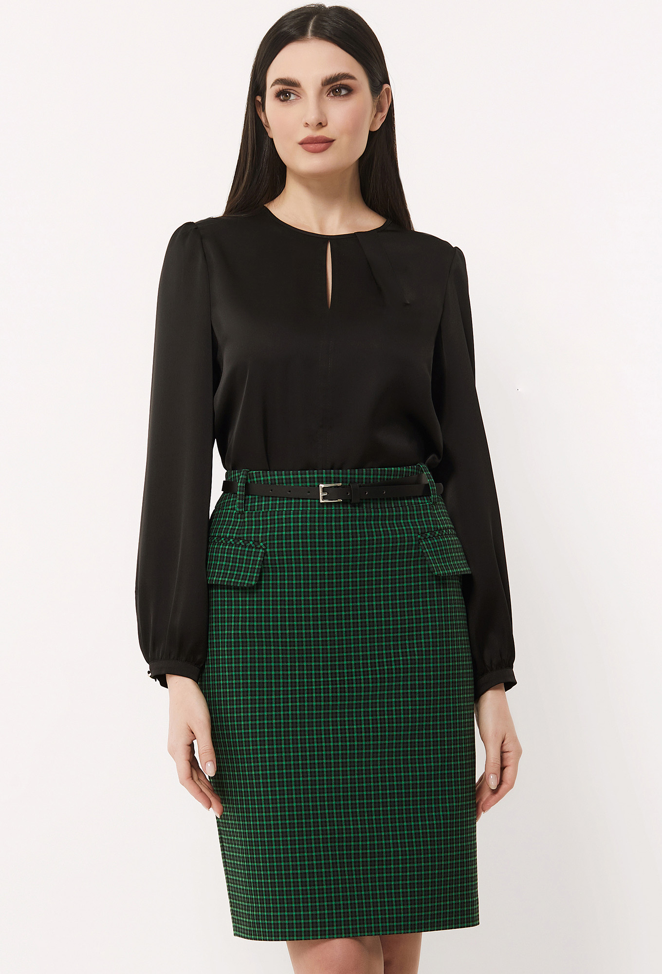 Юбку-карандаш на притачном поясе со шлёвками сшили из приятной итальянской ткани с добавлением вискозы с дизайном «мелкая клетка». Передняя половинка с горизонтальными карманами с клапанами, в среднем шве задней половинки обработаны застёжка на потайную молнию и шлица. На подкладке.