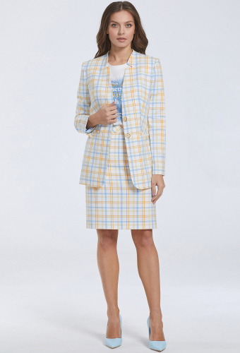 Модель: Базалини 4643/4680 молочный клетка..показать Рост: 170 см (девушка на фото ростом 170см) Сезон: Весна-Лето Тип ткани: 63% Полиэстер, 34% Вискоза, 3% ЭластанСтильный однобортный жакет полуприлегающего силуэта выполнен из мягкой приятной испанской ткани с добавлением вискозы с интересным сочетанием клетки. Перед с небольшой цельнокроеной стойкой, с глубоким фигурным вырезом, с застёжкой на две петли-пуговицы, с скругленными бортами, с горизонтальными карманами с листочками и отделочными пуговицами. Спинка с отрезной стойкой. Рукава втачные двухшовные со шлицами и отделочными пуговицами. На подкладке.