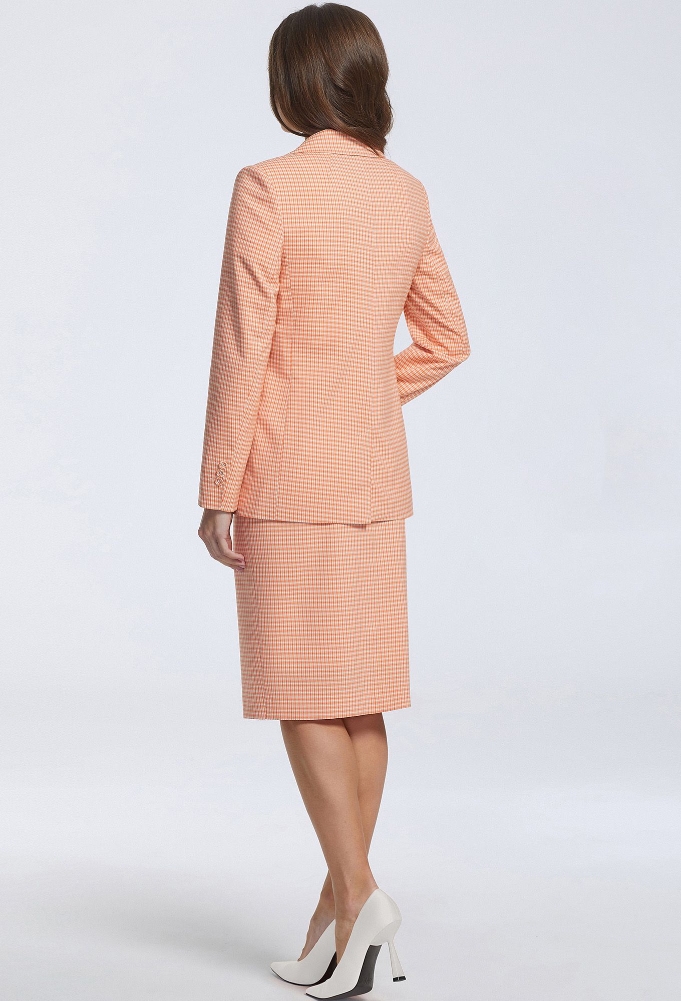 Классическая юбка карандаш – базовая модель гардероба. Её легко вписать как в стилистику спорт-шика, так и в офисный дресс-код. Модель с завышенной талией, на притачном поясе со шлёвками. Перед с горизонтальными карманами-обманками с рамками, застёжкой на молнию и петлю-пуговицу в среднем шве и шлицей. Изделие выполнено из испанской мягкой, приятной на ощупь ткани с добавлением вискозы, с дизайном яркая мелкая клетка мандаринового трендового цвета. Завершает модель тканевый пояс с обтяжной пряжкой в тон.
