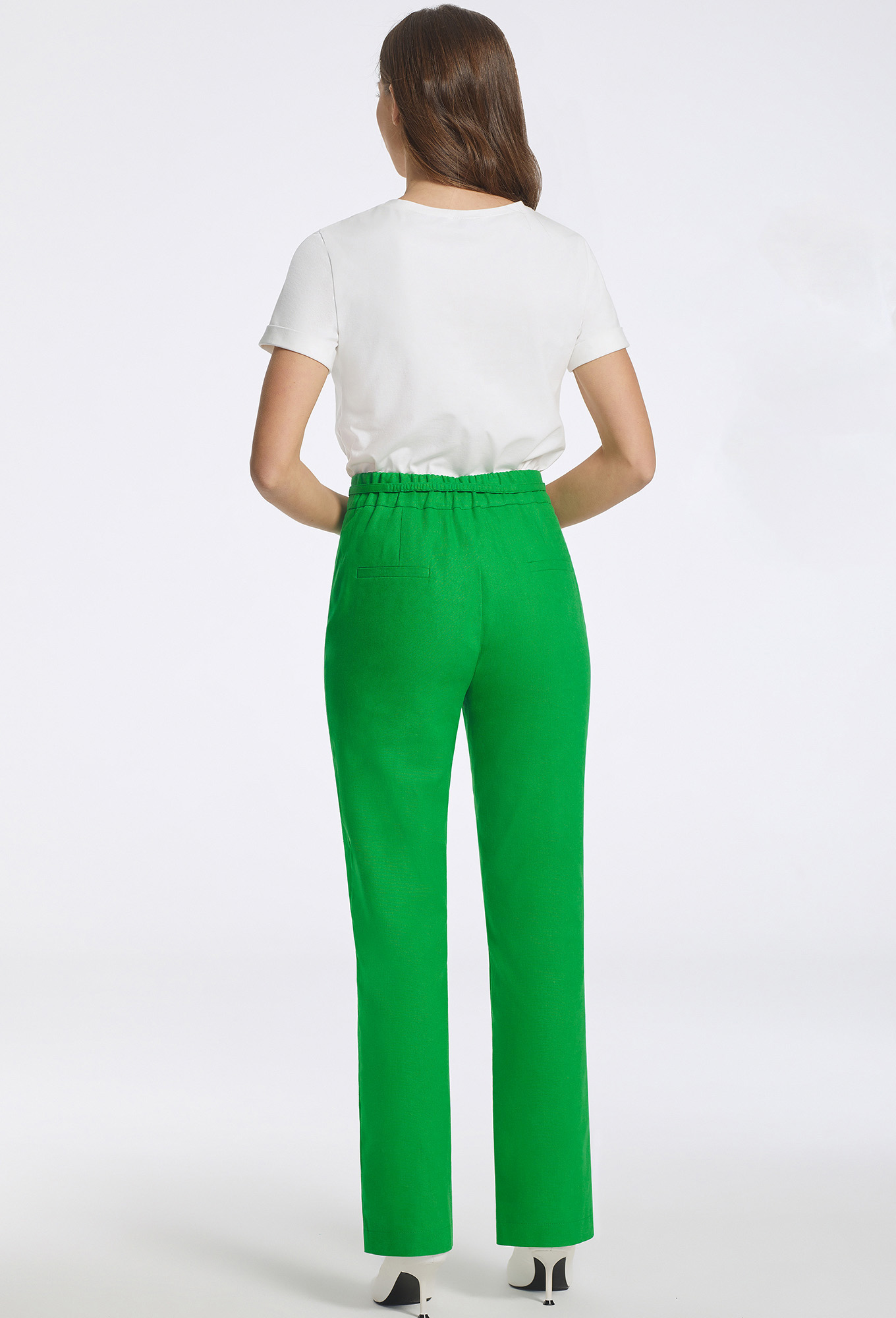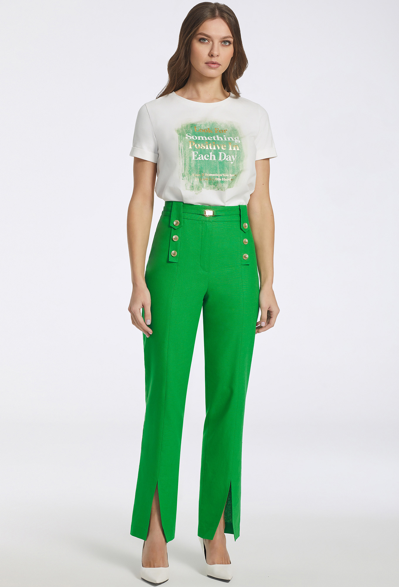 Брюки дополнены узким поясом в тон с металлической пряжкой. Дополните брюки футболкой и жакетом из нашей коллекции и Вы получите комфортный образ как для дня, так и для вечерней прогулки.