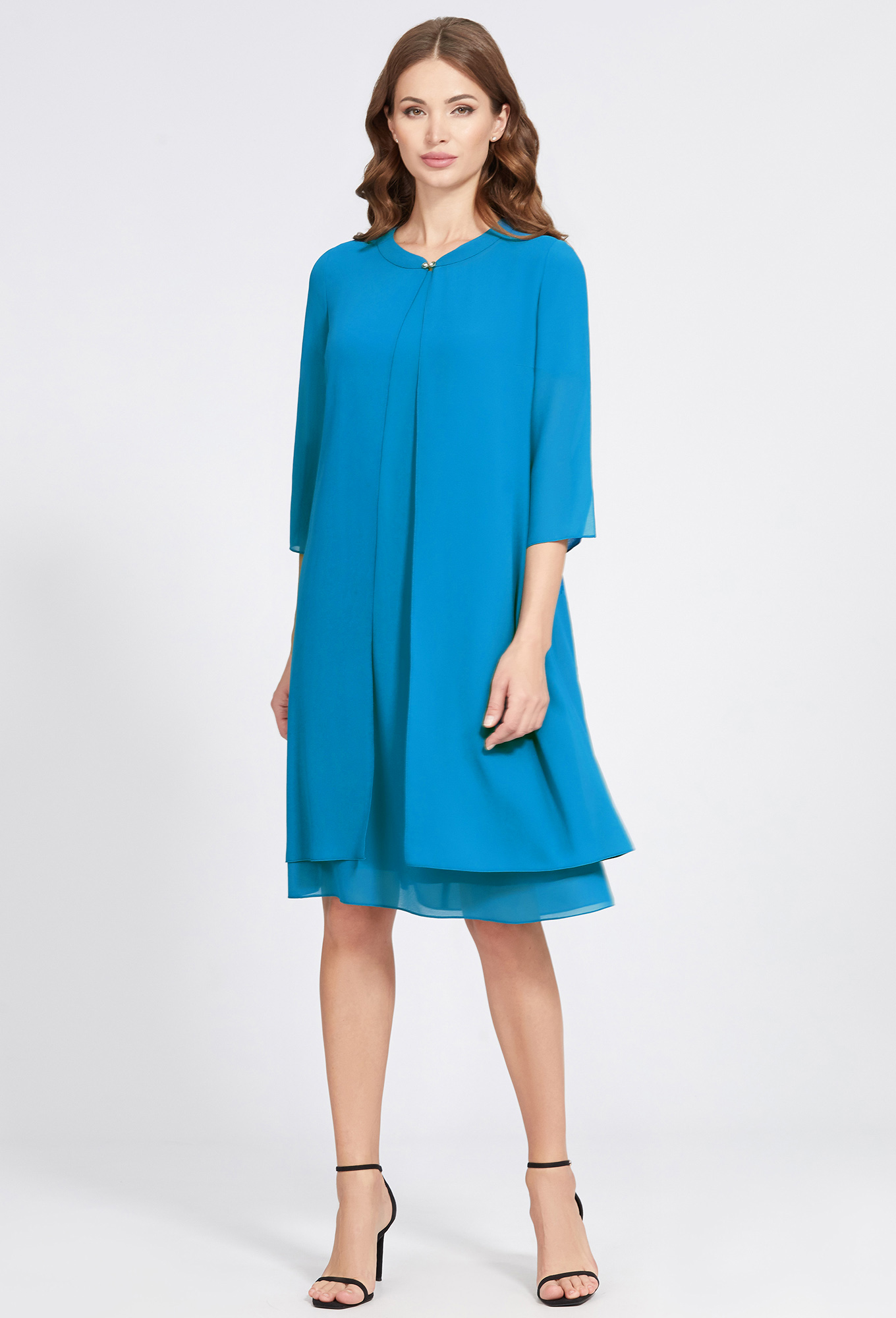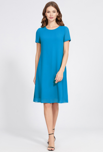 Модель: Базалини 4843 голубой Рос..показатьт: 170 см (девушка на фото ростом 170см) Сезон: Круглогодичный Тип ткани: 100% ПолиэстерПочувствуйте себя непринуждённо шикарно в этом многослойном комплекте, состоящем из платья и съёмной развивающейся накидки в тон. Модель выполнили из мягкого струящегося, однотонного шифона и 100 % вискозной ткани. Платье А- образного силуэта с округлой формой горловины, короткими втачными, полупрозрачными рукавами и застёжкой на потайную тесьму-молнию в среднем шве спинки. Накидка соответствующего силуэта, с привлекательным фигурным вырезом горловины, втачными полупрозрачными рукавами с разрезами в верхнем шве и застёжкой на декоративный крючок со стразами.