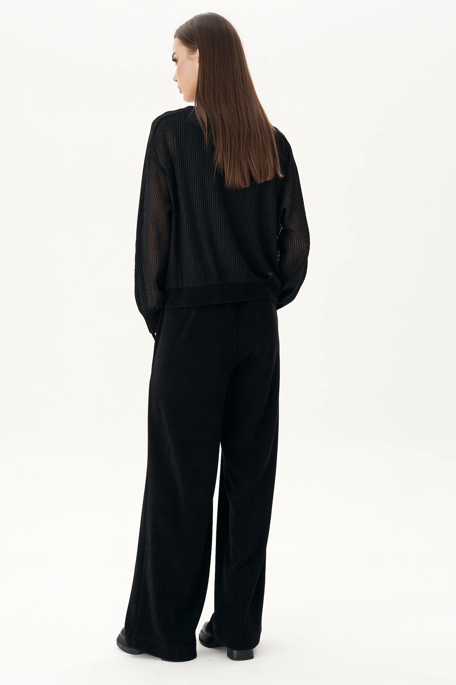 джемпер 20% хлопок, 80% ПЭ. Брюки 90% ПЭ, 6% вискоза, 4% спандекс. Топ: хлопок 95%, спандекс 5%. черный