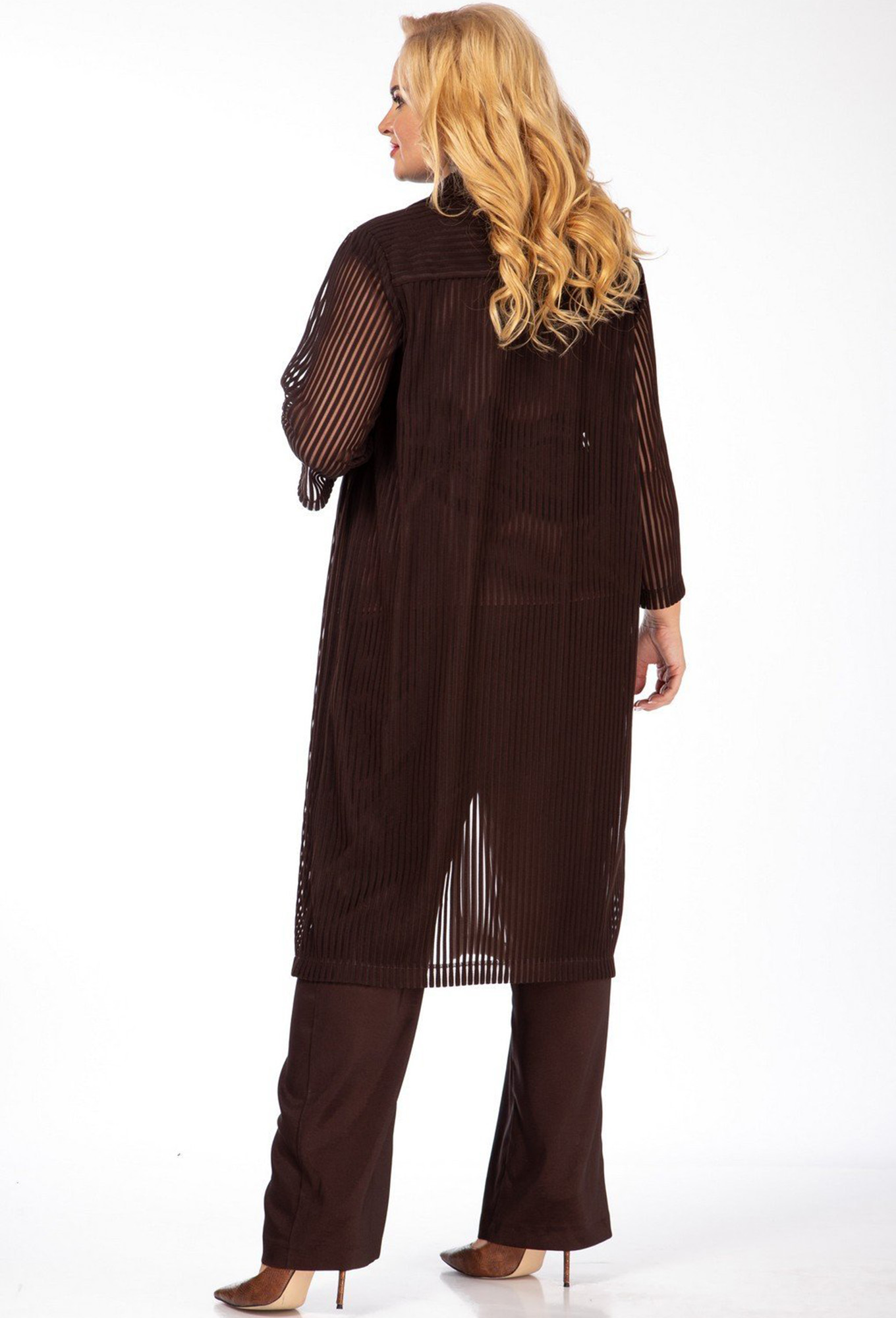 Модель: Диамант 1822 шоколад Рост..показать: 164 см (рост модели на фото 170см) Сезон: Весна-Лето Тип ткани: 5% эластан, 95 % ПЭКомплект брючный : рубашка ,блуза,брюки. Рубашка из отделочной ткани с центральной бортовой застёжкой на петли и пуговицы, с плечевой кокеткой. Перед с нагрудными вытачками и накладными карманами. Рукав втачной одношовный длиной 7/8. Воротник рубашечный с прямыми уголками. Блуза: перед с нагрудными вытачками. Горловина округлой формы по боковым швам обработаны разрезы. Брюки прямой формы свободного кроя. Пояс притачной на резинке.