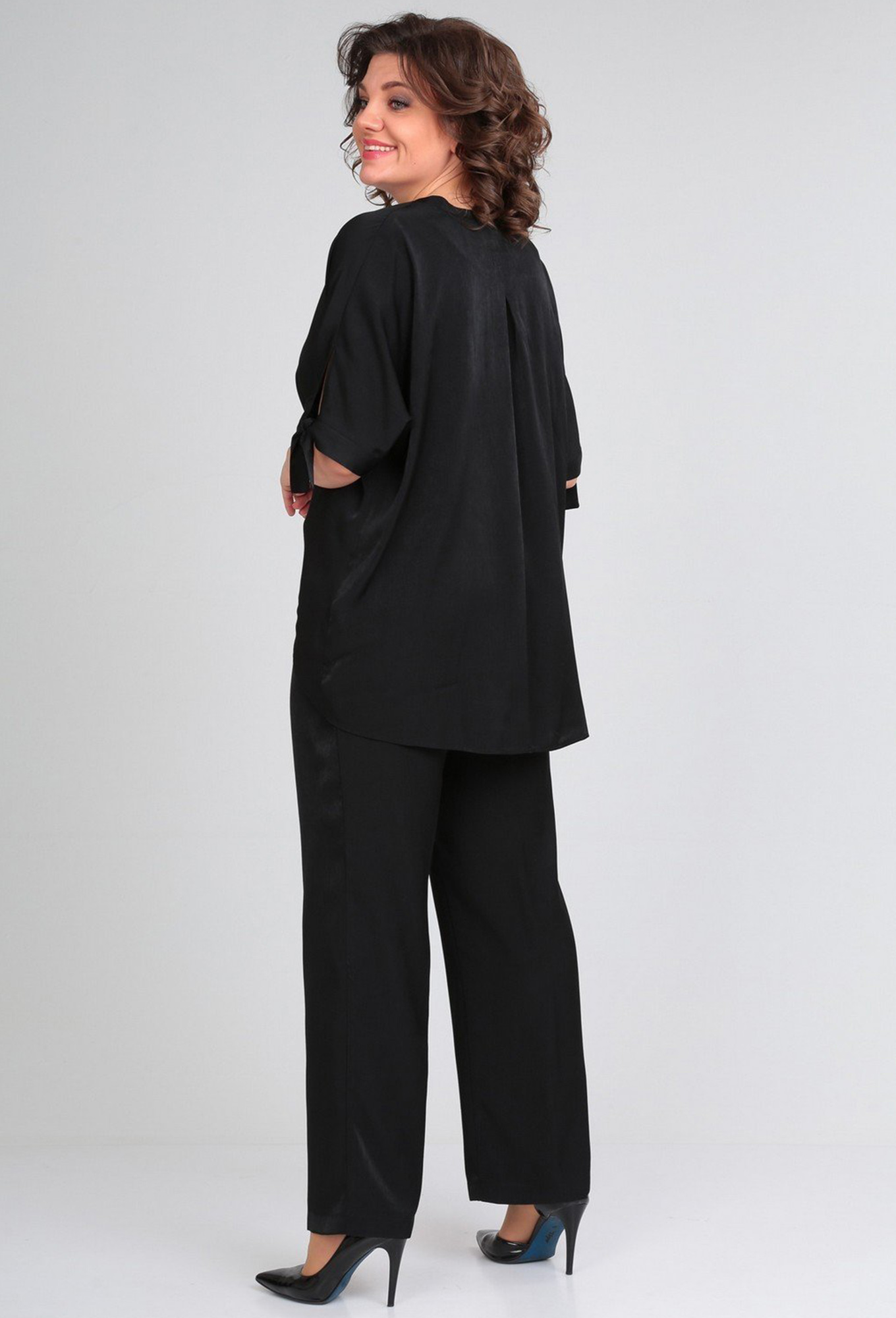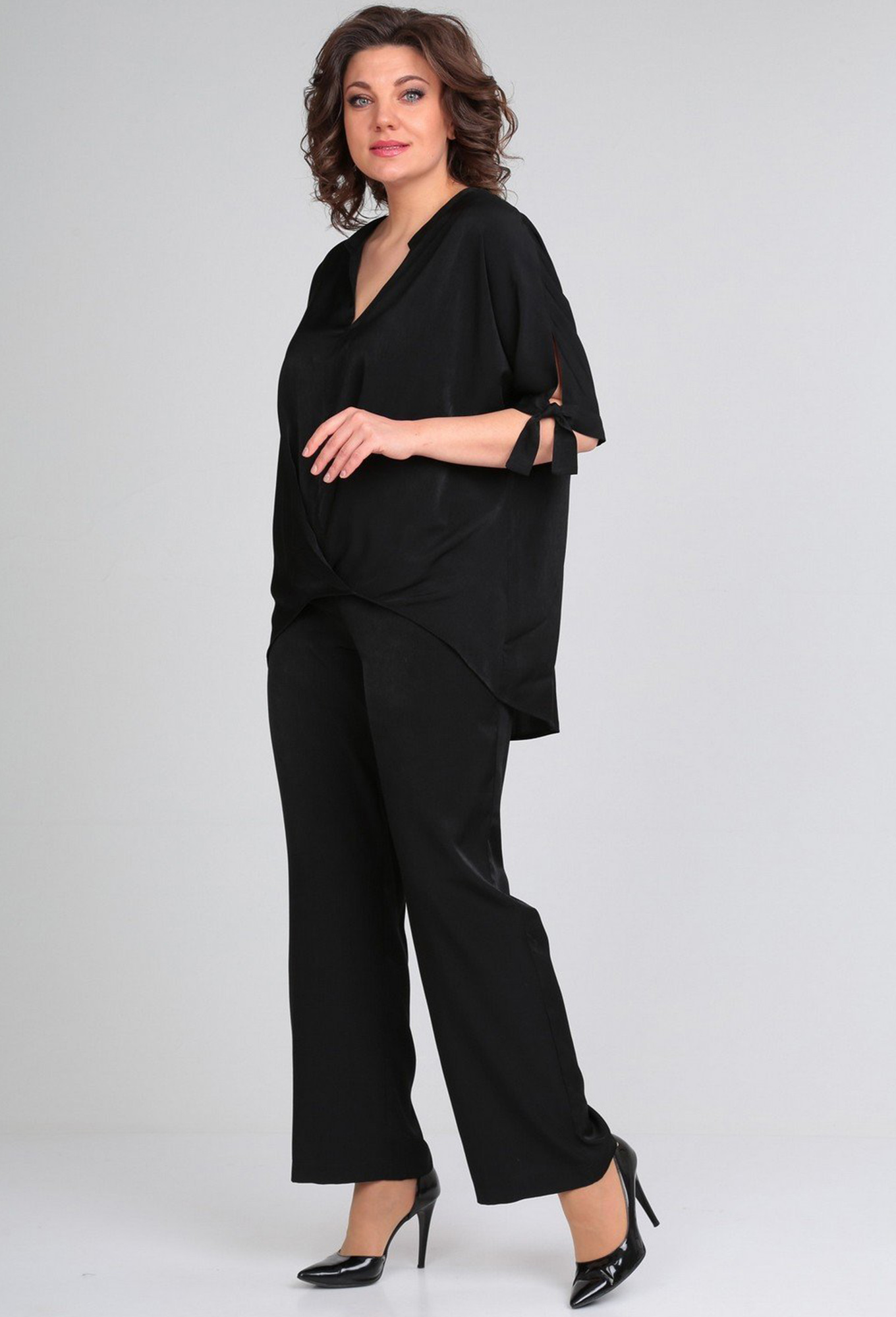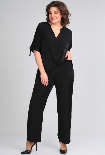 Модель: Диамант 1854 черный Рост:..показать 164 см (рост модели на фото 170см) Сезон: Весна-Лето Тип ткани: 50% вискоза, 50 % хлопокКомплект брючный : блуза + брюки . Блуза свободного кроя с цельнокроеным рукавом. Низ рукава с разрезами и манжетами-завязками. Перед со средним швом и мягкими складками по низу. Спинка с застроченной встречной складкой вверху. Горловина V-образной формы со стойкой. По разрезам и завязкам отделочная строчка. Брюки прямые с резинкой по поясу. длина по спинке 75 см , длина рукава+плечо 37 см. длина брюк 107 см. 164 см (рост модели на фото 170см)