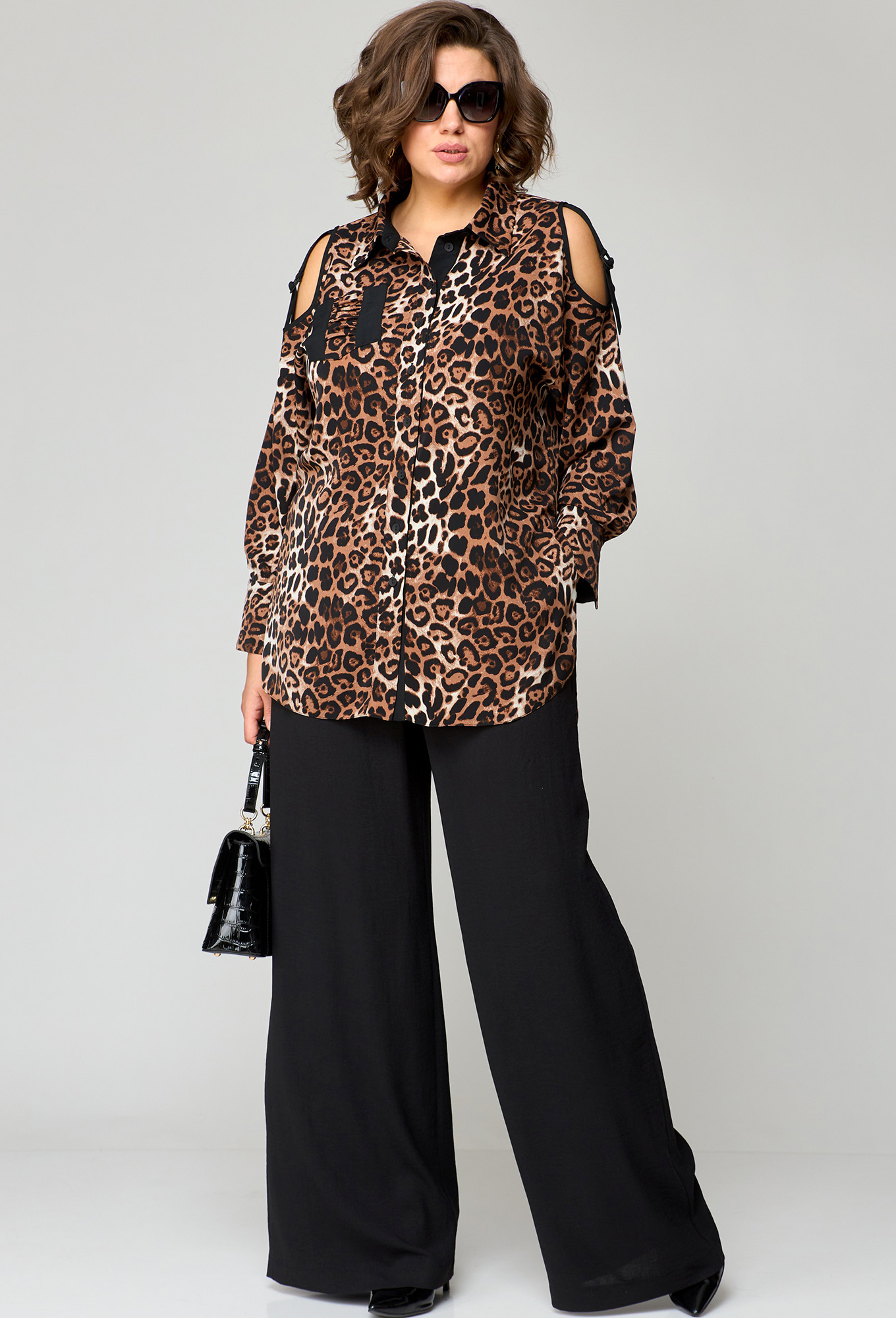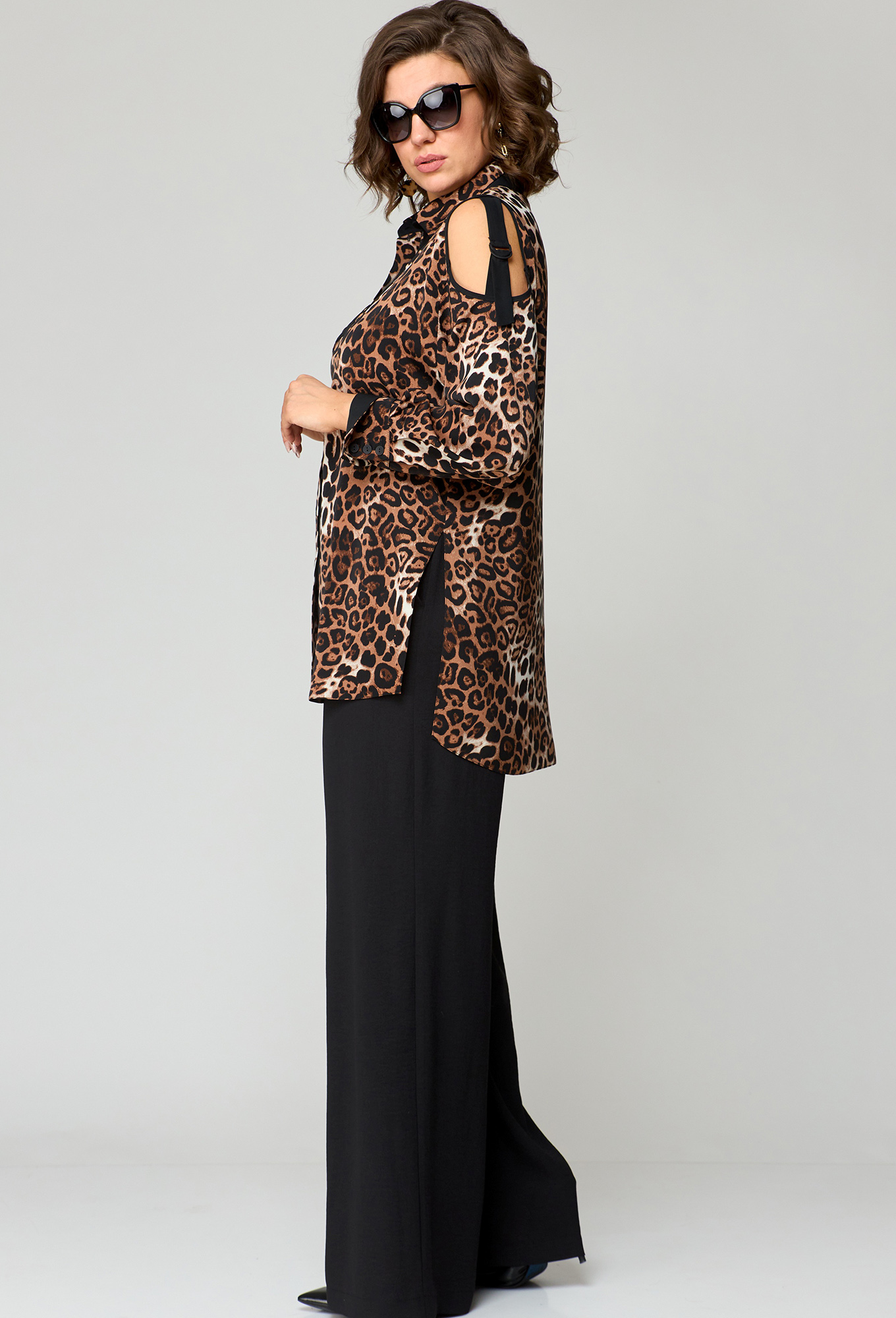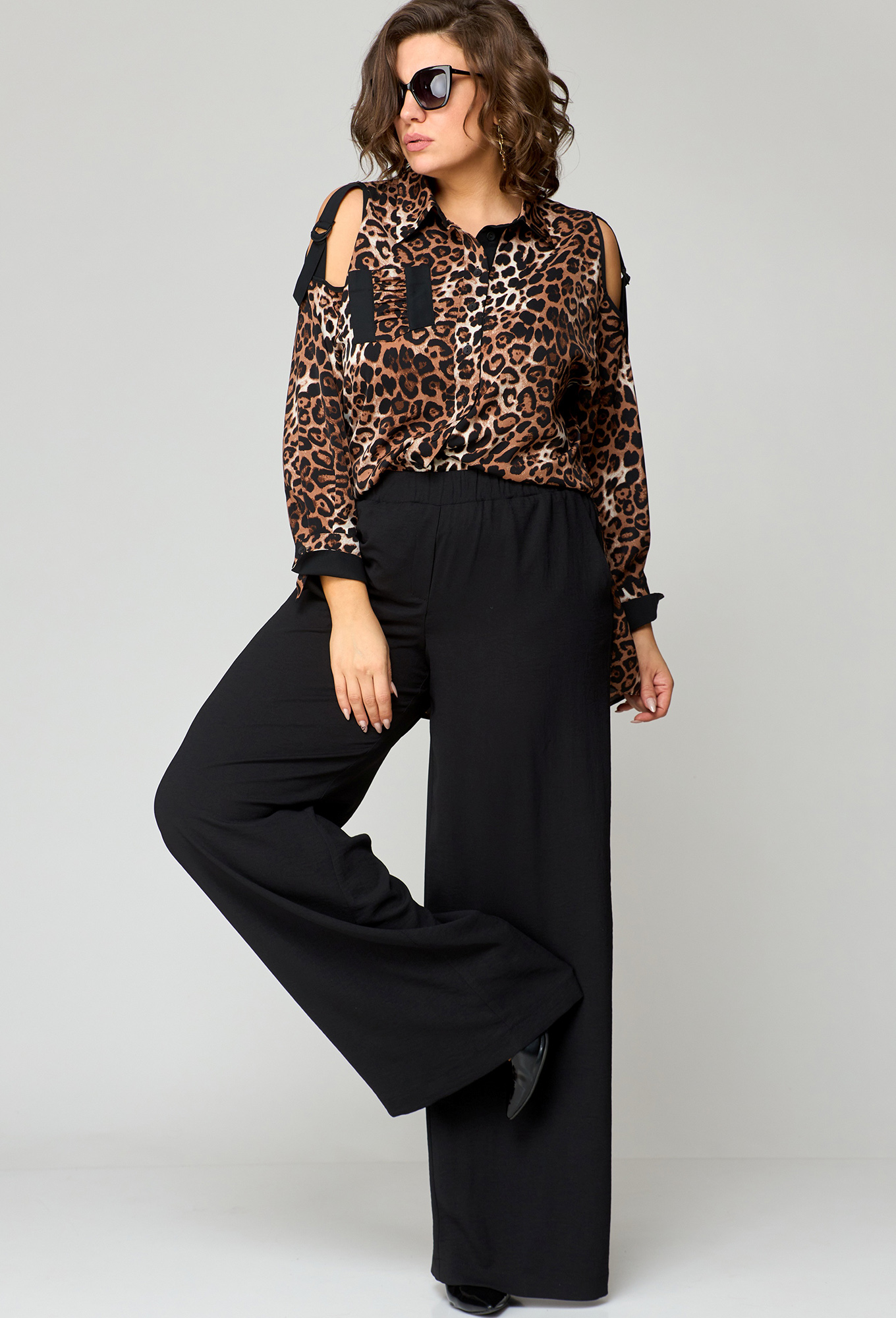 Модель: ЕВА ГРАНТ 211 леопард Рос..показатьт: 170 см (рост модели на фото 170см) Сезон: Весна-Лето Тип ткани: Полиэстер 74%, вискоза 21%, спандекс 5%Комплект женский 2-х предметный состоящий из блузы и брюк. Блуза нарядно-повседневная прямого силуэта выполнена из блузочной ткани в сочетании с отделкой. Вырез горловины воротник на стойке рубашечного типа, застежка доверху на обметанные петли и пуговицы. Рукав втачной с открытым плечом. По правой стороне блузы накладной карман, в боковых швах обработаны карманы разрезы. Низ фигурный. Декором блузы служат отделочные элементы из ткани с пряжкой по рукавам. Брюки прямого свободного кроя. Пояс брюк полностью на резинке. В боковых швах-карманы.