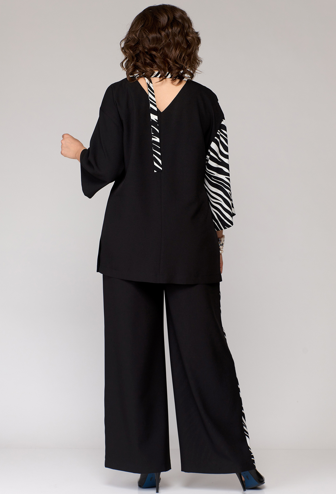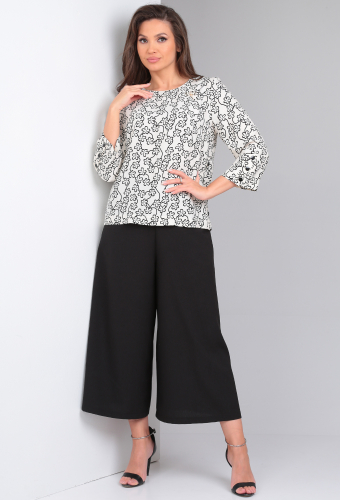 Модель: ЕВА ГРАНТ 7082 черно-белый ..показатьi>Рост: 170 см (рост модели на фото 170см) Сезон: Круглогодичный Тип ткани: Лен 60%, Вискоза 40%Комплект женский двухпредметный, состоящий из блузы и брюк, выполнен из двух видов ткани. Блуза свободного прямого силуэта, длиной ниже линии бедра. По переду средний шов, в боковых швах обработаны разрезы, по спинке V-образный вырез горловины, не глубокий, который фиксируется пряжкой и хлястиком из отделочной ткани. Брюки палаццо, пояс на резинке, в боковых швах карманы.