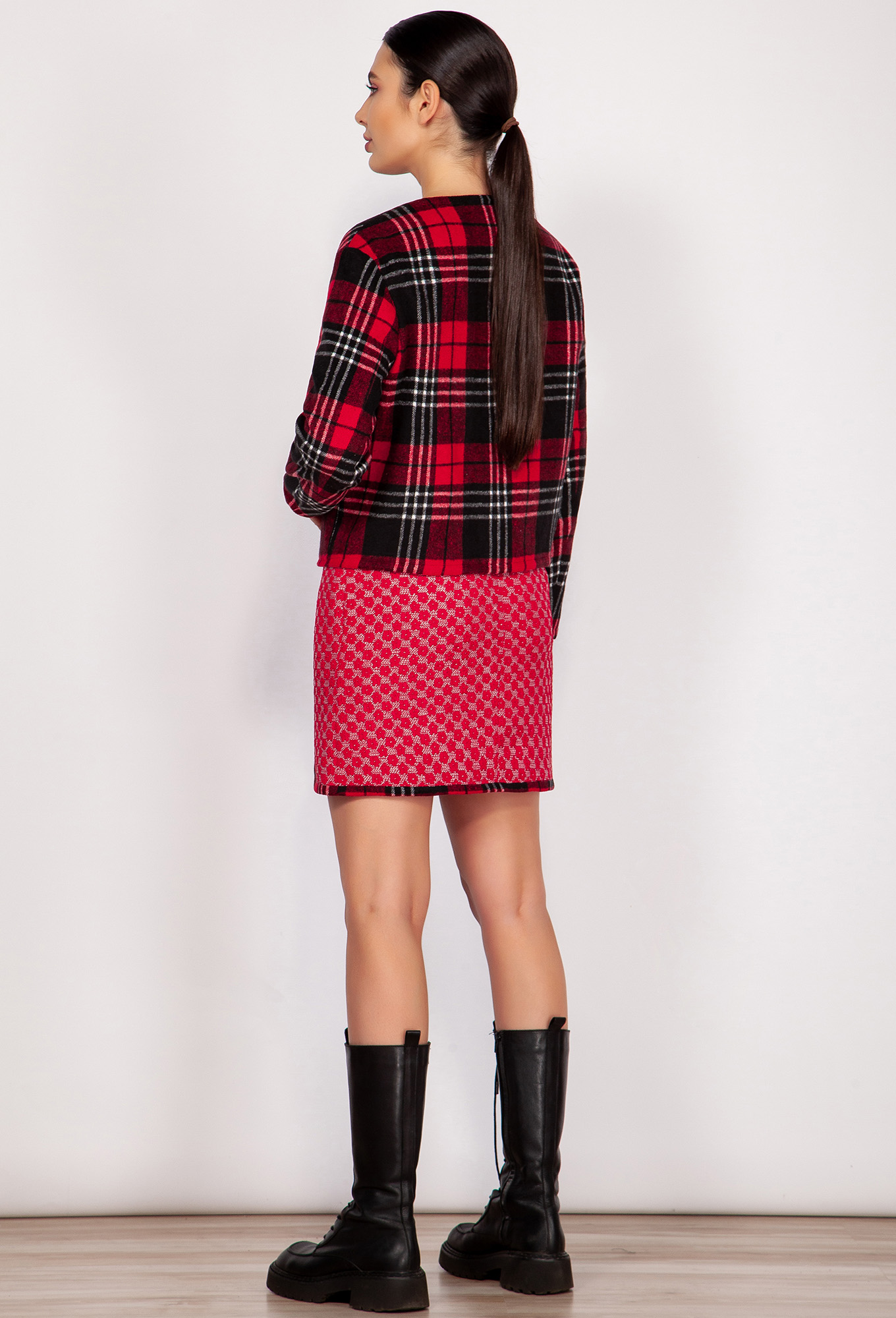 Модель: Гизарт 1121 красно-черный клетка..показатьli> Рост: 164 см (девушка на фото ростом 170см) Сезон: Осень-Зима Тип ткани: ПЭ-75%, вискоза-25%Стильный и теплый костюм. Жакет прямого силуэта с нагрудной вытачкой из бокового шва и спущенной линией плеча. Рукав втачной двухшовный. Застежка центральная с закругленными краями борта на 5 кнопок. Перед с настрочными карманами. Вдоль горловины, борта, низа изделия и рукава, и вдоль верхнего края кармана притачана планка из отделочной ткани.