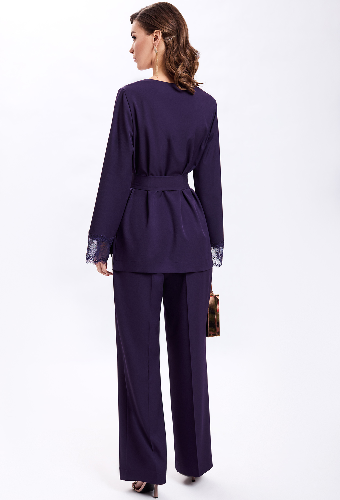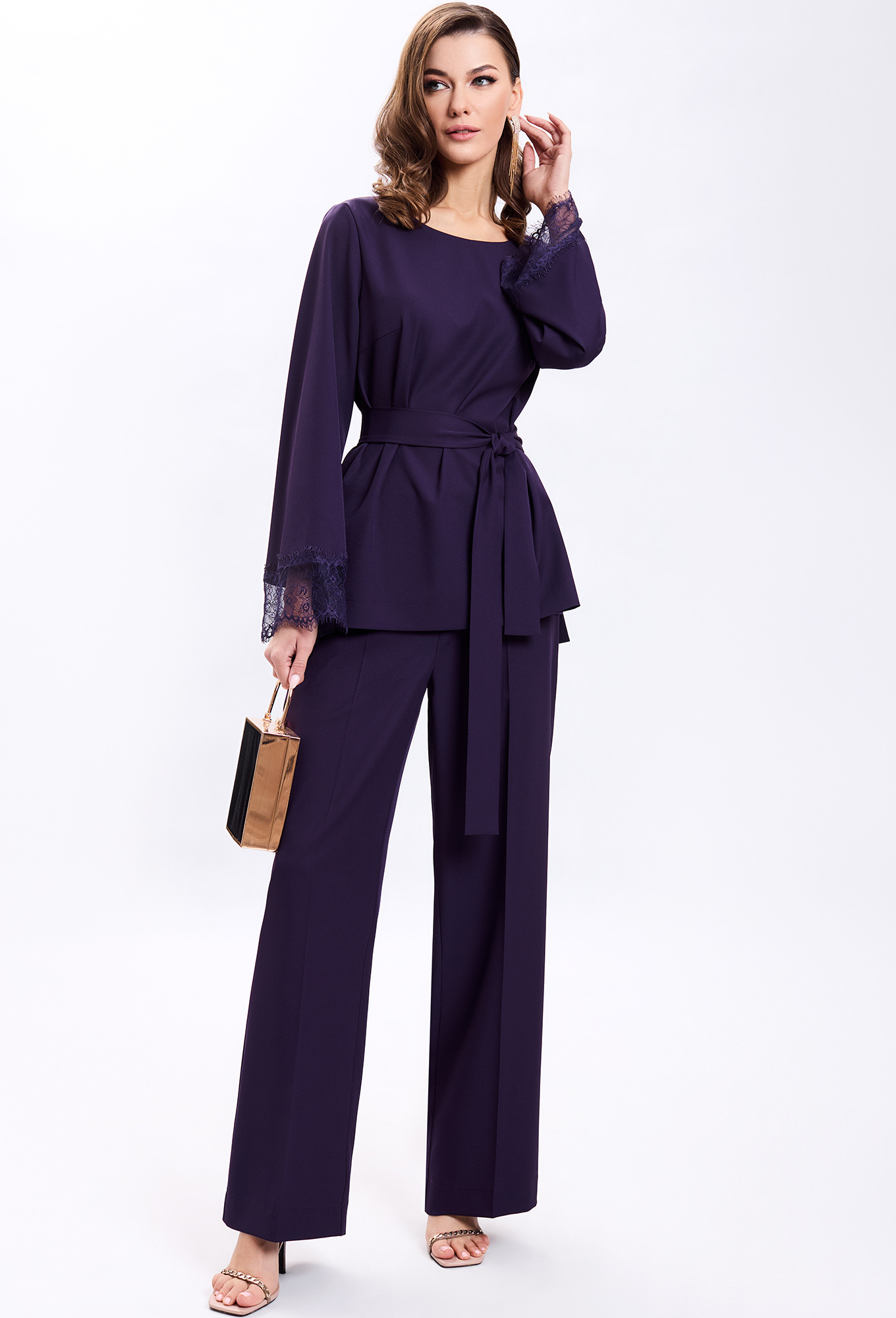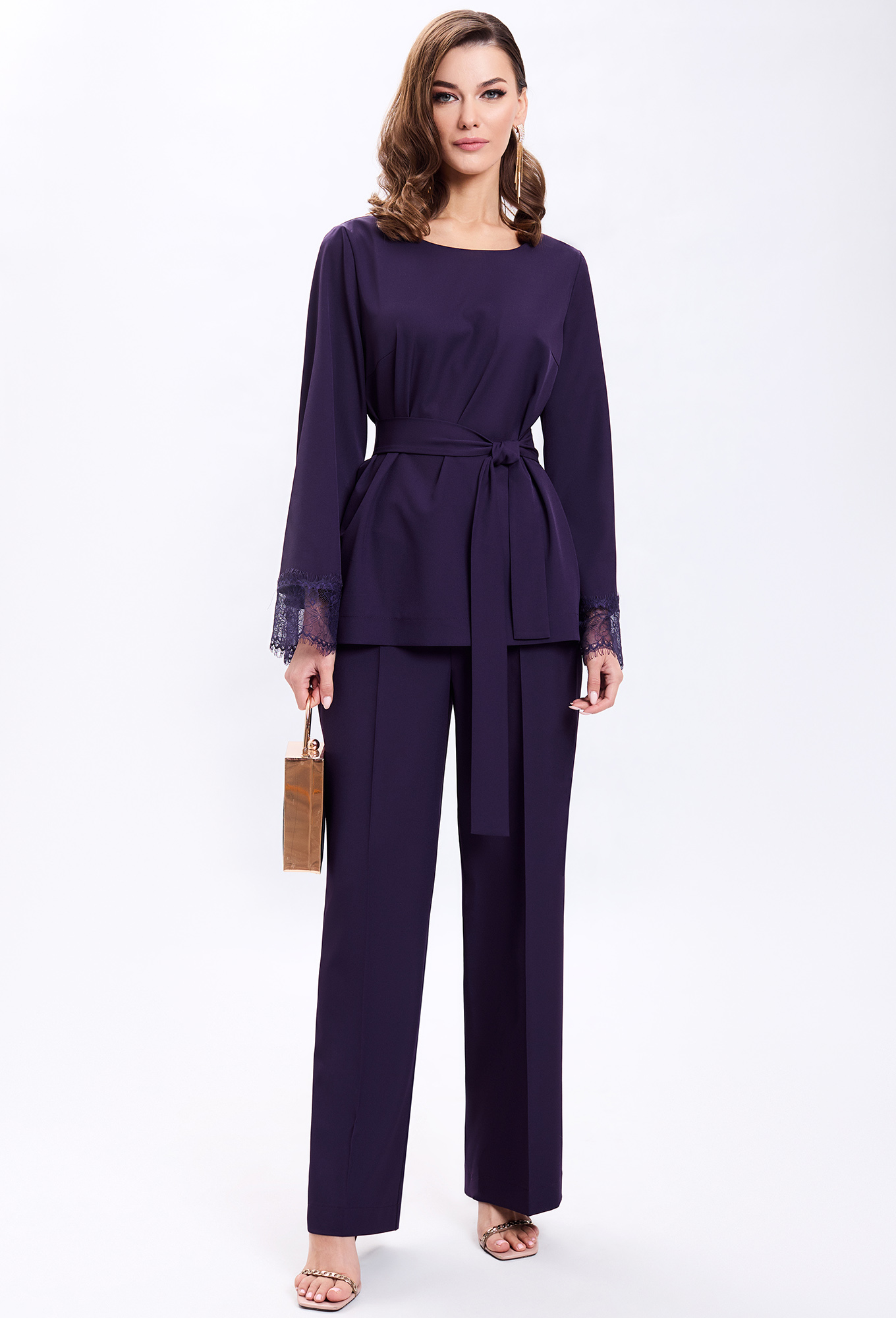 Модель: Гизарт 7578 баклажан Рост..показать: 164 см (девушка на фото ростом 170см) Сезон: Круглогодичный Тип ткани: ПЭ-71%, вискоза-23%, спандекс- 6%Костюм состоит из блузки и брюк. Блузка прямого силуэта. Рукав одношовный, втачной. По низу рукава притачено кружево. По переду блузки - нагрудная вытачка, выходящая из бокового шва. В боковых швах блузки обработаны разрезы. Спинка длиннее переда. К блузке прилагается пояс, выполненный из основной ткани. Брюки прямого силуэта, с притачным прямым поясом на одну пуговицу. Пояс со шлевками, по спинке на резинке. Передняя часть брюк с застежкой на молнию. Брюки с боковыми карманами с наклонным входом. По передним и задним частям - стрелки. Фурнитура может быть изменена, сохраняя целостность художественного замысла. Длина блузки по середине спинки-71см, длина рукава-60см, длина брюк с учетом пояса-105см.: 164 см (девушка на фото ростом 170см)