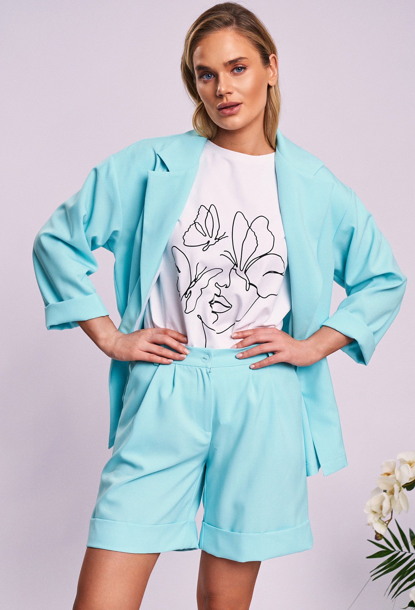 Жакет со съемным поясом, который завязывается на талии, длина до середины бёдра.Шорты женские, прямого силуэта, умеренного объема.