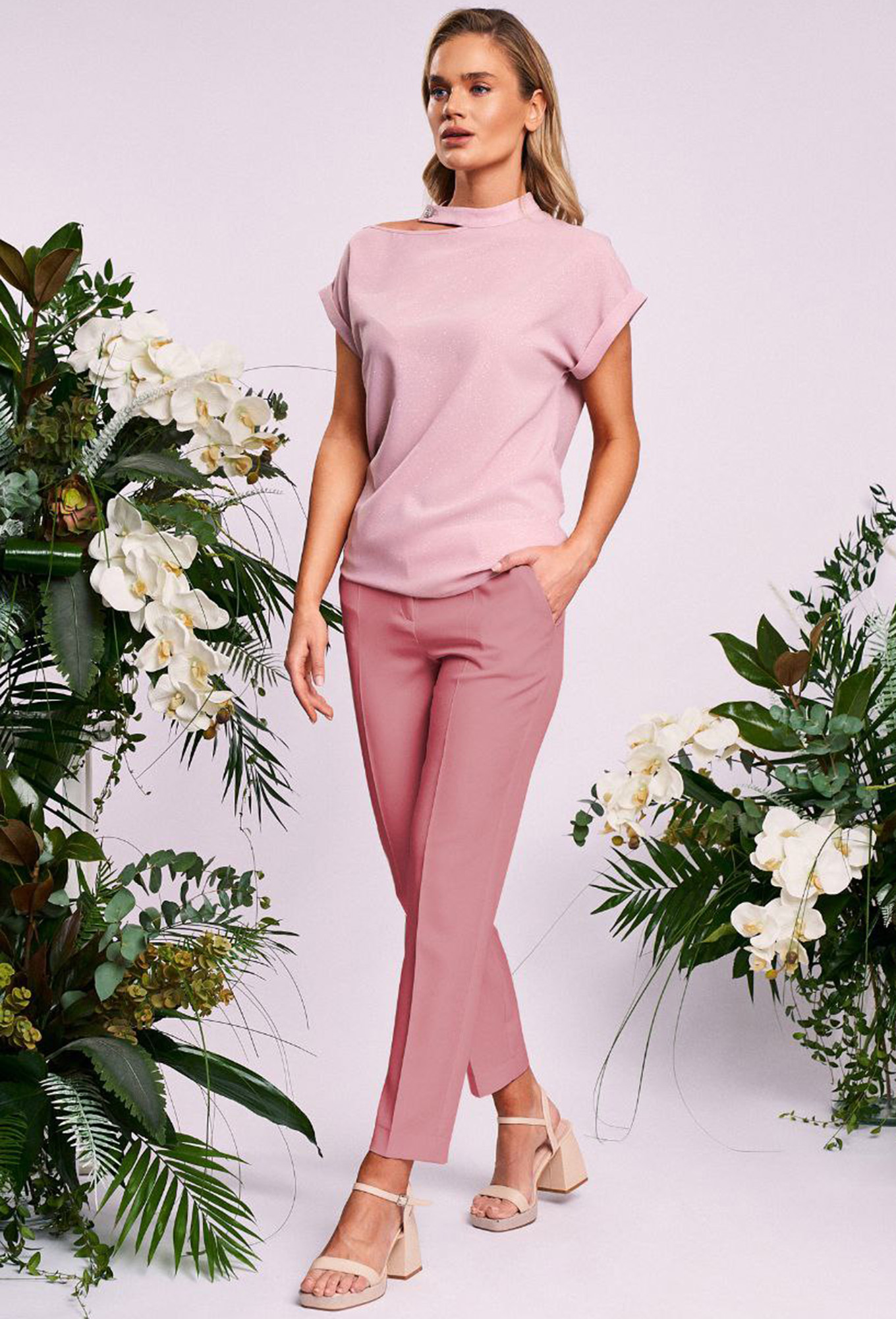 Модель: Кавари 8007 розовый Рост:..показать 170 см (девушка на фото ростом 170см) Сезон: Круглогодичный Тип ткани: Блуза - полиэстер 100%Брюки - полиэстер 65%; вискоза 32%; эластан 3%Женский комплект 2-х предметный состоит из блузы и брюк. Нарядная женская блуза свободного силуэта длиной до середины бедра. Воротник стойка с боковой застежкой на петлю и пуговицу. Рукав цельнокроеный с отложными манжетами. Верх блузы асимметричной формы - одно плечо открыто. Брюки базовые со стрелками. Изделие имеет комфортную среднюю посадку. Брюки на притачном поясе со шлёвками. Спереди боковые функциональные карманы, сзади имитация прорезных карманов с листочкой._x000D_