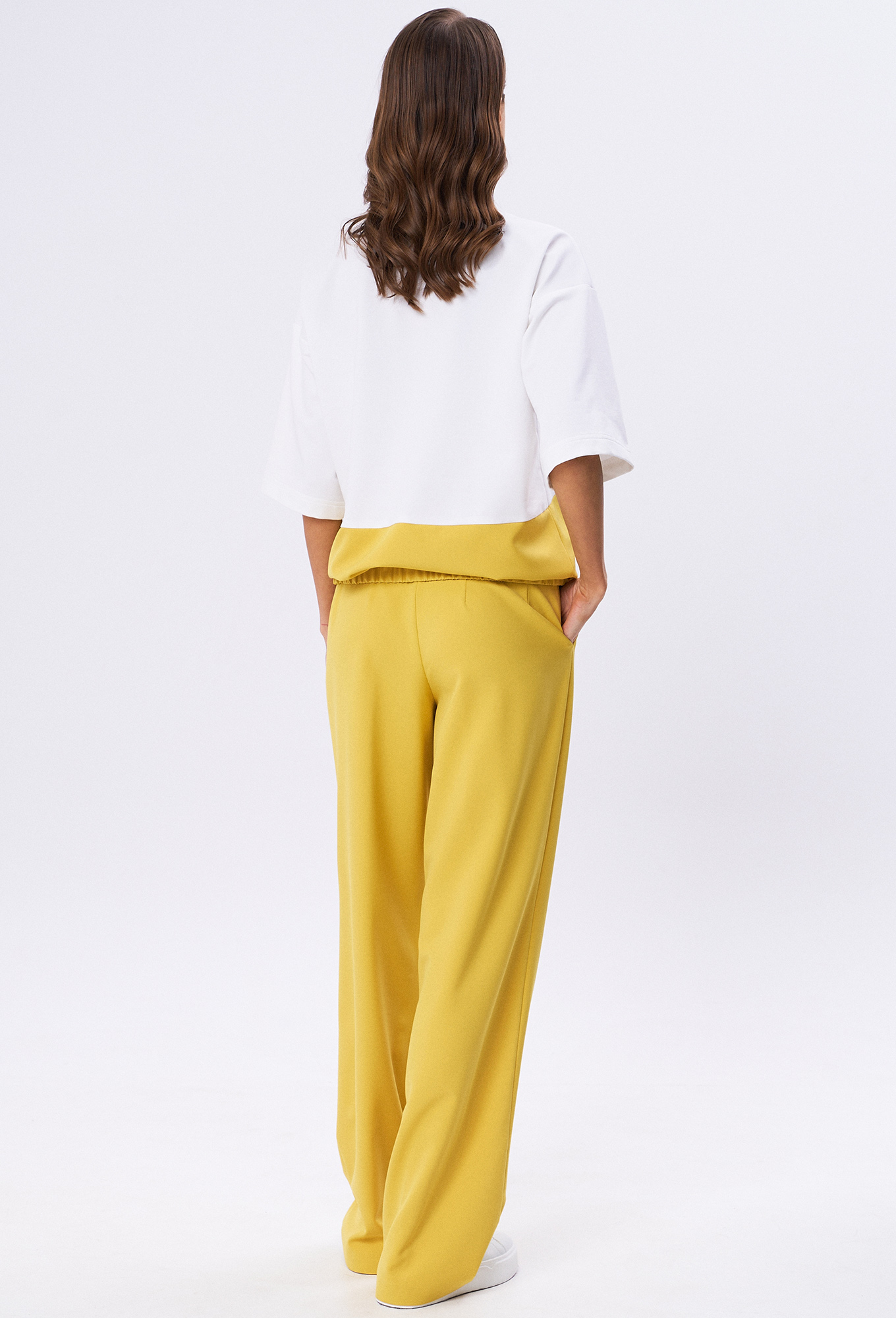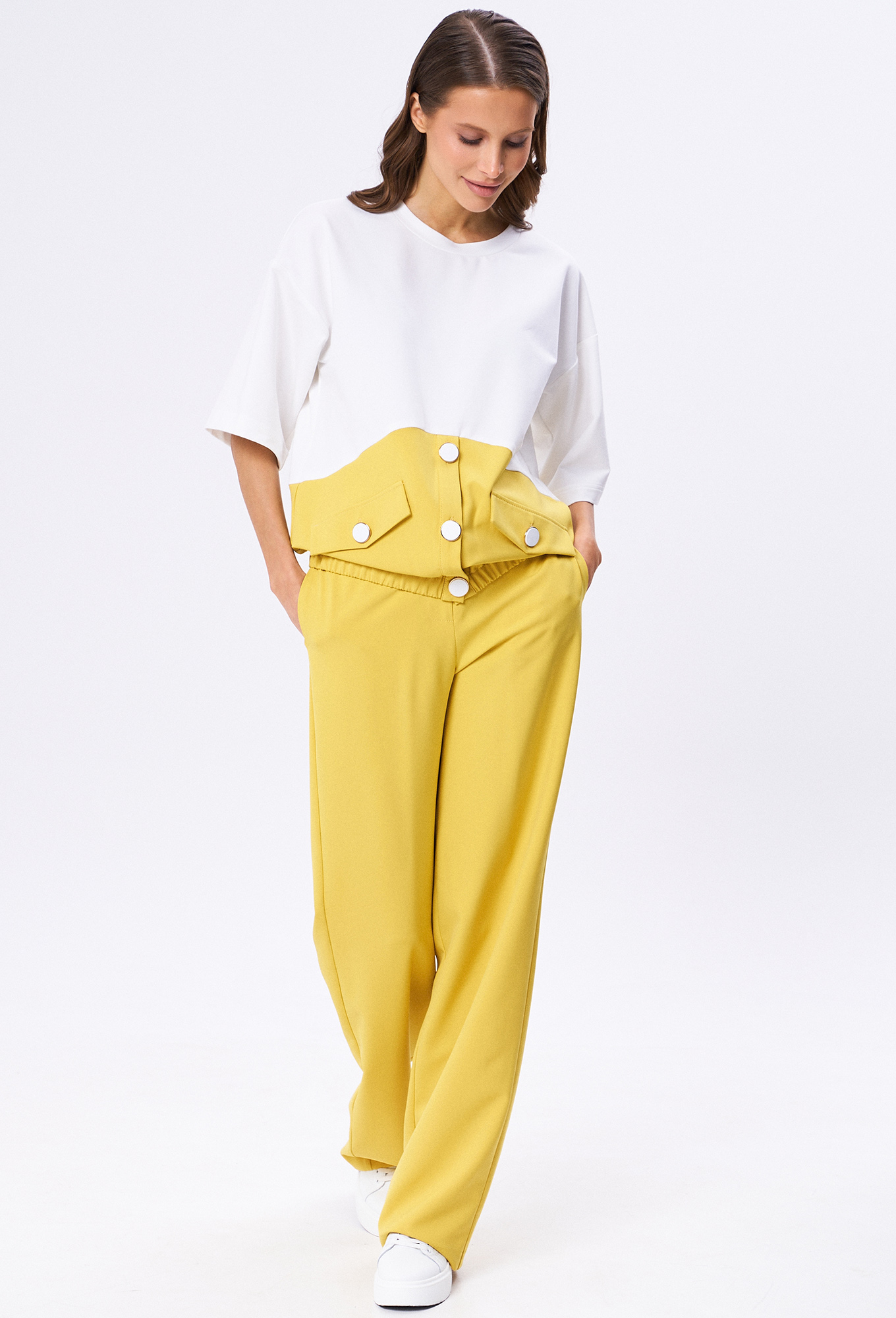 Модель: Кавари 8024 горчица Рост:..показать 170 см (девушка на фото ростом 170см) Сезон: Весна-Лето Тип ткани: Блузка - хлопок 40%, вискоза 30%, полиэстер 28%, спандекс 2%; Брюки - вискоза 60%, полиэстер 35%, спандекс 5%Комплект, состоящий из блузки и брюк. Объёмная блузка на резинке по низу выполнена из футера 2-х нитки в сочетании с костюмной тканью. Линия плеча спущена, рукав до локтя. По переду в качестве декора клапаны с пуговицами. Прямые брюки из костюмной ткани частично на резинке по поясу с застёжкой на гульфик с молнией и пуговицу. По бокам карманы.