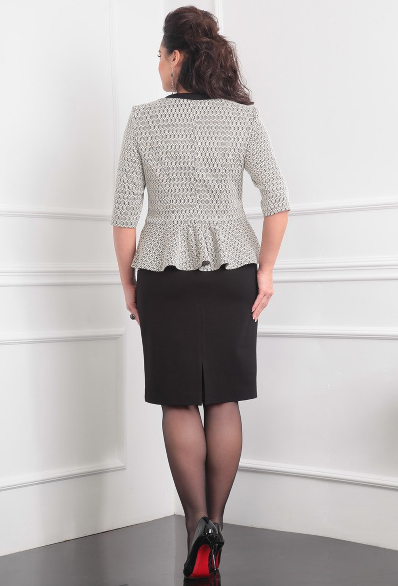 Модель: Леди Лайн 412 Рост: 164 с..показатьм (рост модели на фото 170см) Сезон: круглогодичный Тип ткани: юбка- вискоза 67%, нейлон 29%, спандекс 2% жакет- ПЭ 45%, хлопок 43%, люрекс 10%, спандекс 2%Комплект женский 2х предметный, состоит из жакета и юбки Жакет прилегающего силуэта из приятного плотного трикотажа с добавлением люрексовой нити.По линии талии жакета пришита баска по спинке по центру на баске сборка. По краю горлоины пришита планка. Застёжка на прорезные петли и пуговицы. Рукав 3/4. Юбка облегающего силуэта, к низу типа "карандаш", в рерху юбка на на обтачке, по задней половине юбки застёжка на потайную тесьму-молнию, по низу юбки открытая шлица. Юбка на трикотажной подкладке.