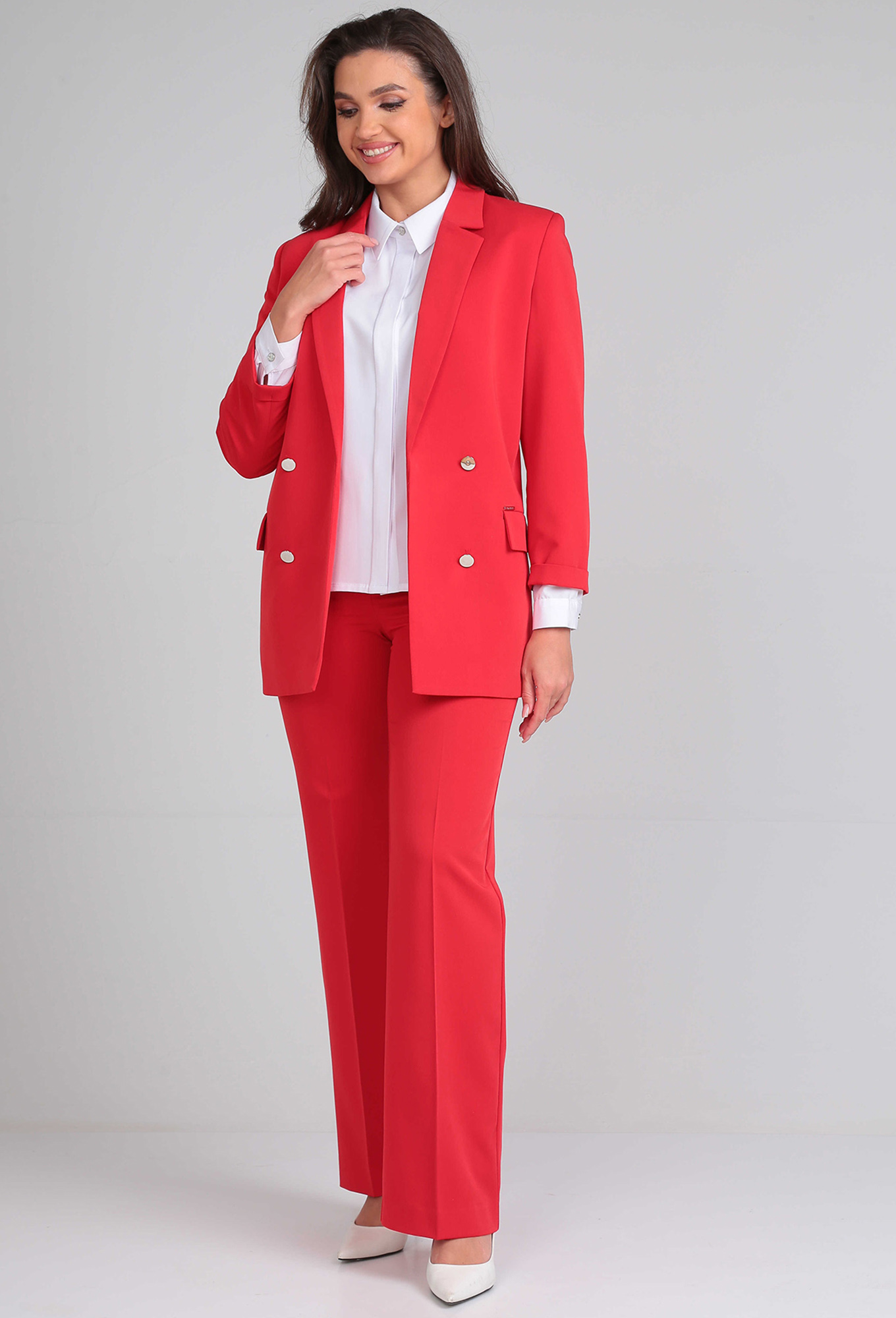 Модель: Леди Лайн 508 красный Рос..показатьт: 164 см (рост модели на фото 170см) Сезон: Круглогодичный Тип ткани: 49% полиэфир, 48% вискоза, 3% спандексКостюм 2х предметный, состоит из жакета свободного покроя и брюк._x000D_