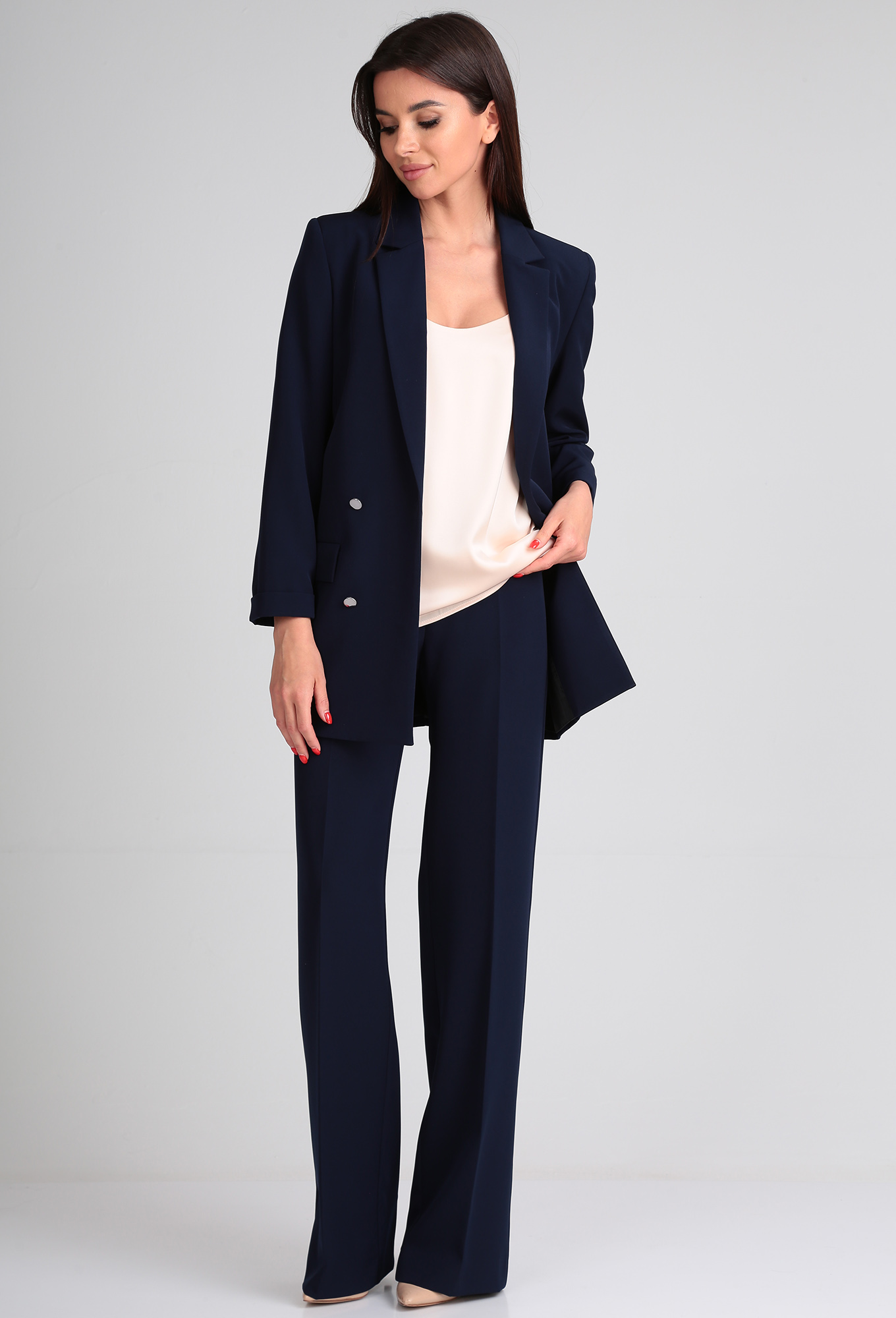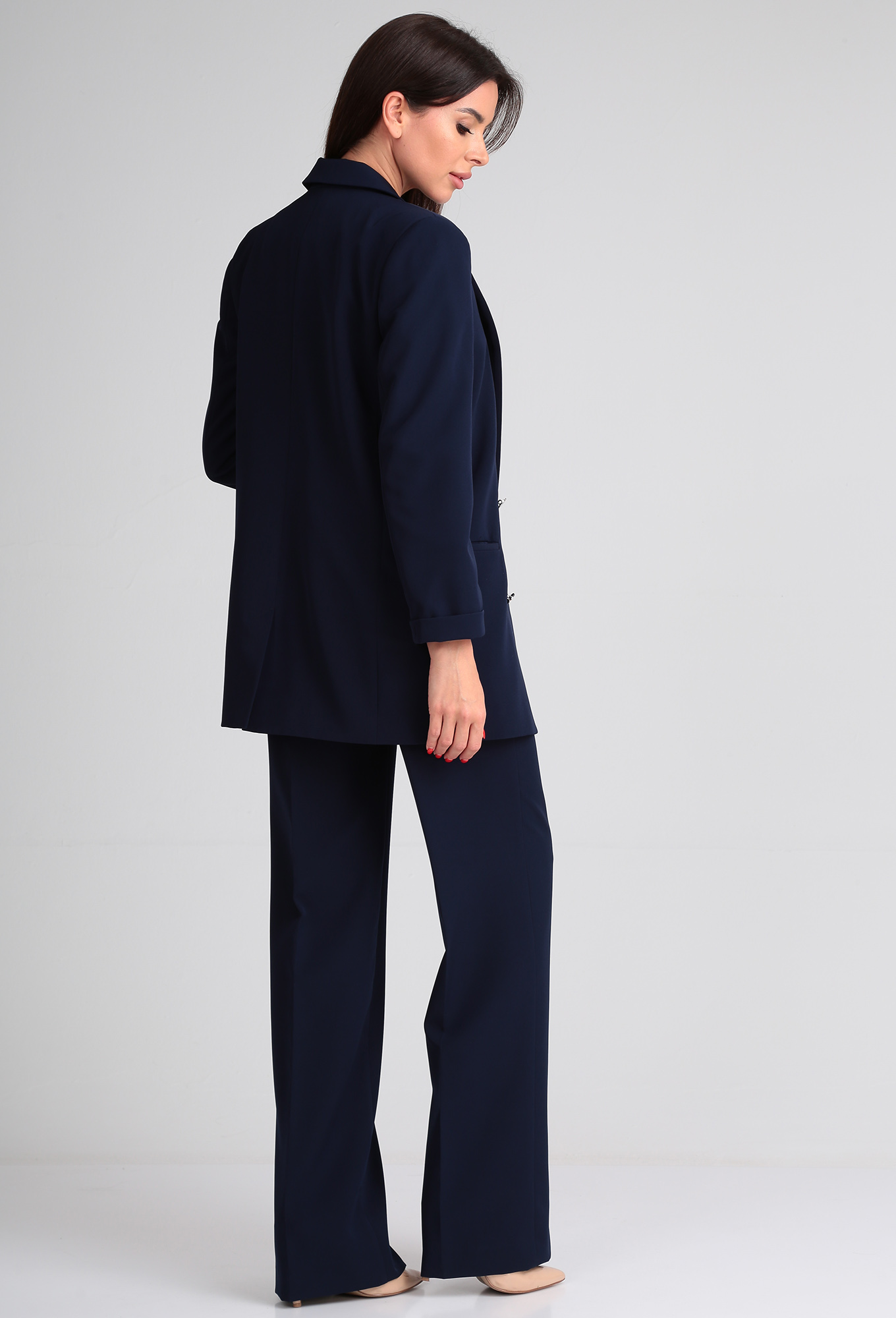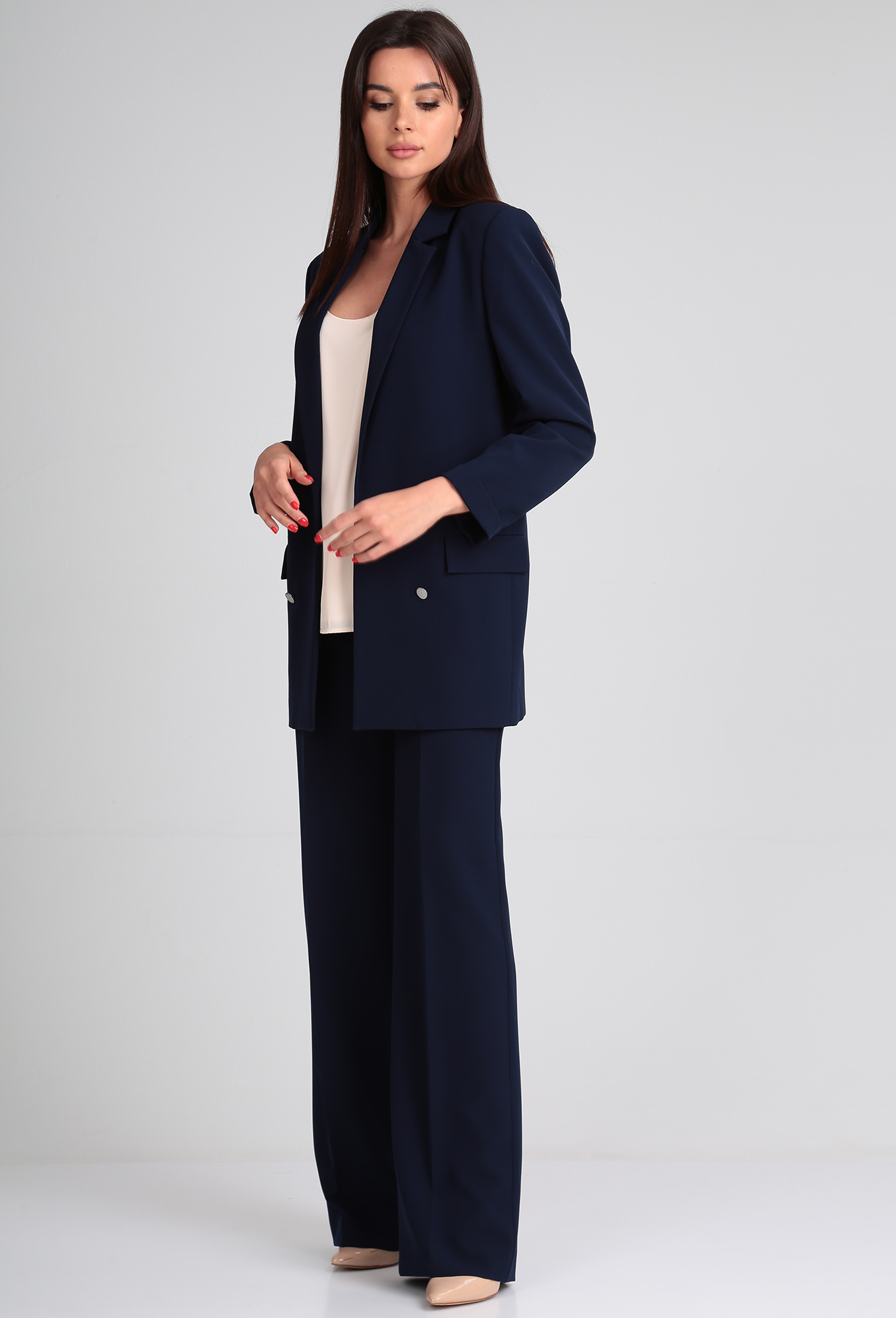 Модель: Леди Лайн 508 т.синий Рос..показатьт: 164 см (рост модели на фото 170см) Сезон: Круглогодичный Тип ткани: 49% полиэфир, 48% вискоза, 3% спандексКостюм 2х предметный, состоит из жакета свободного покроя и брюк._x000D_