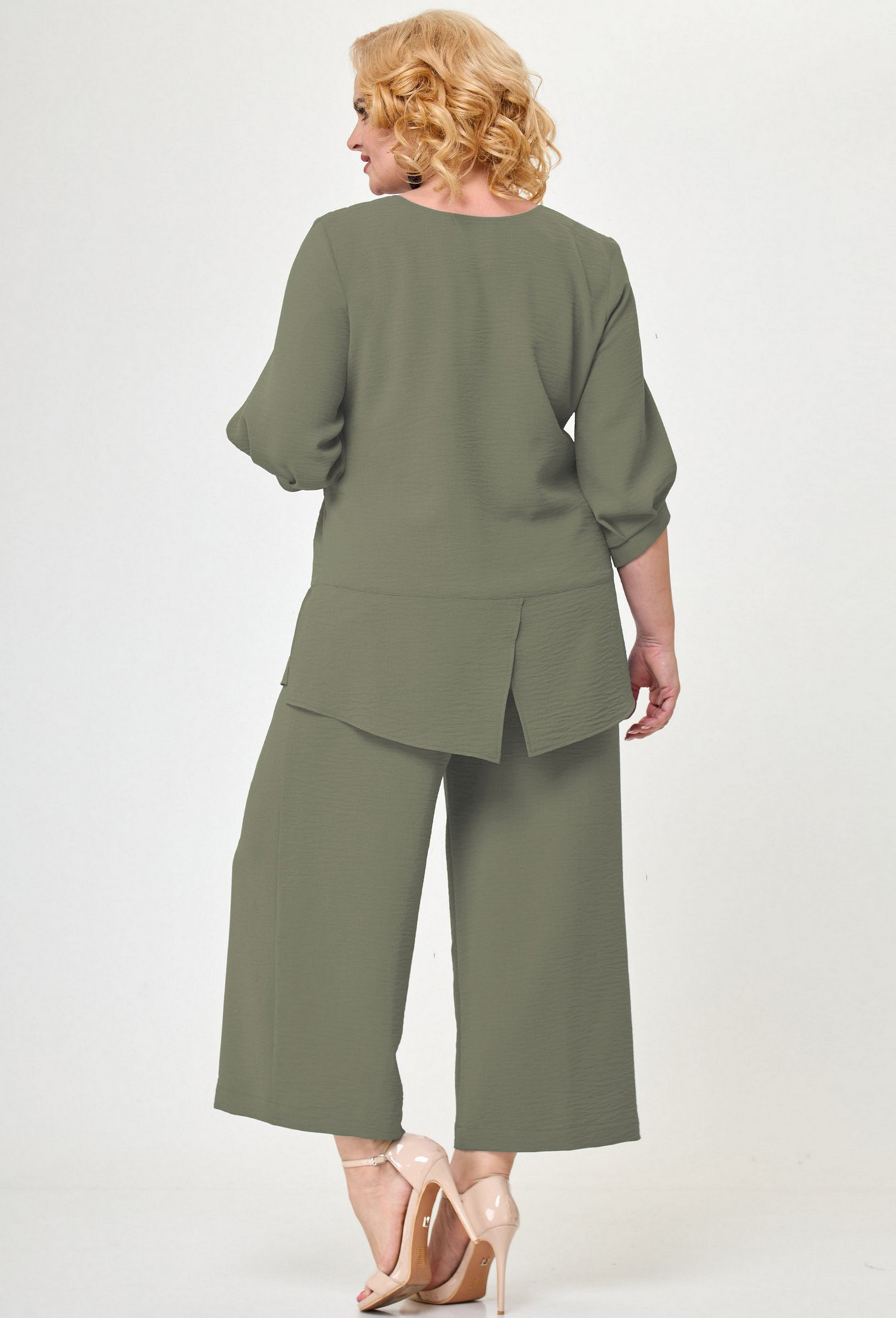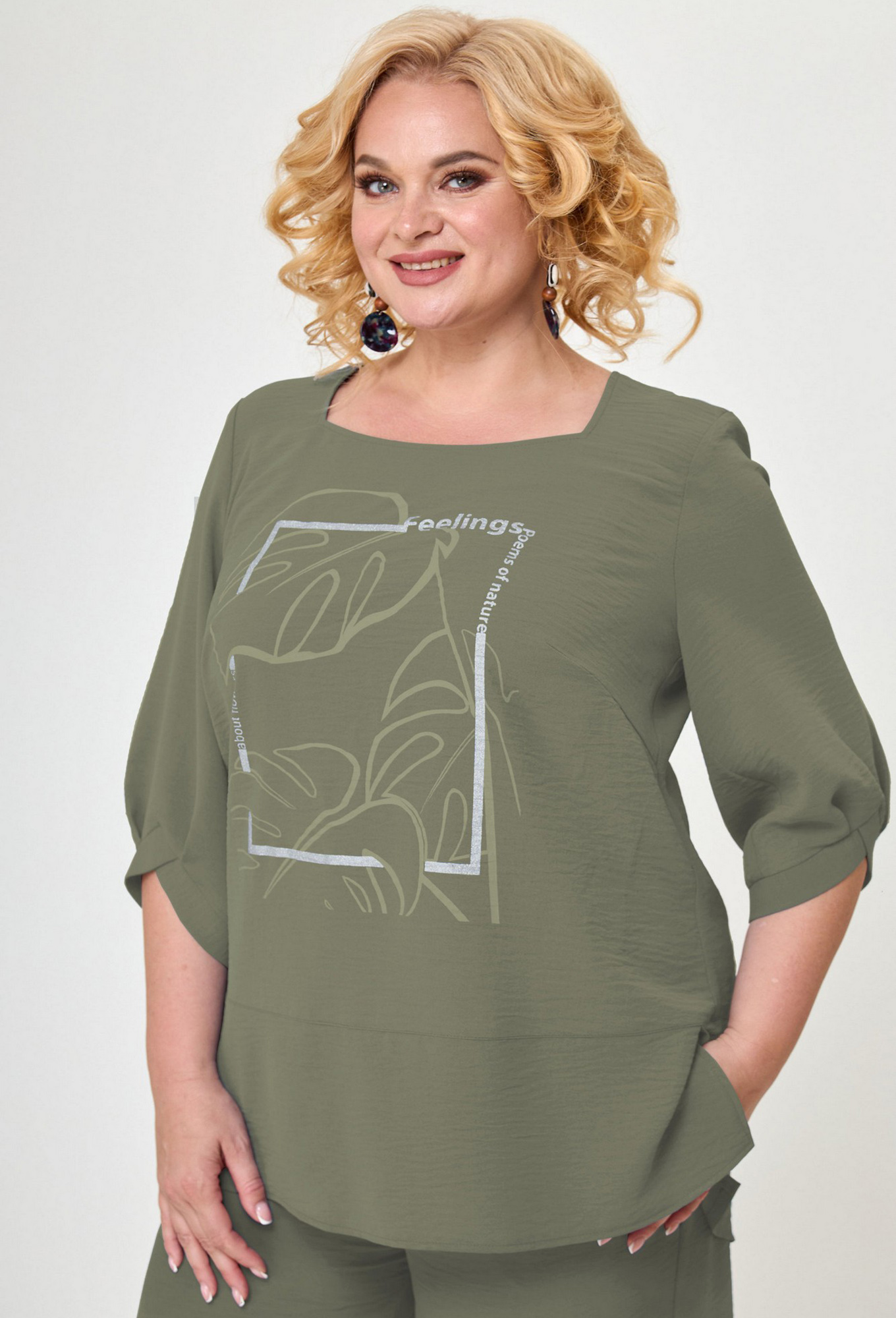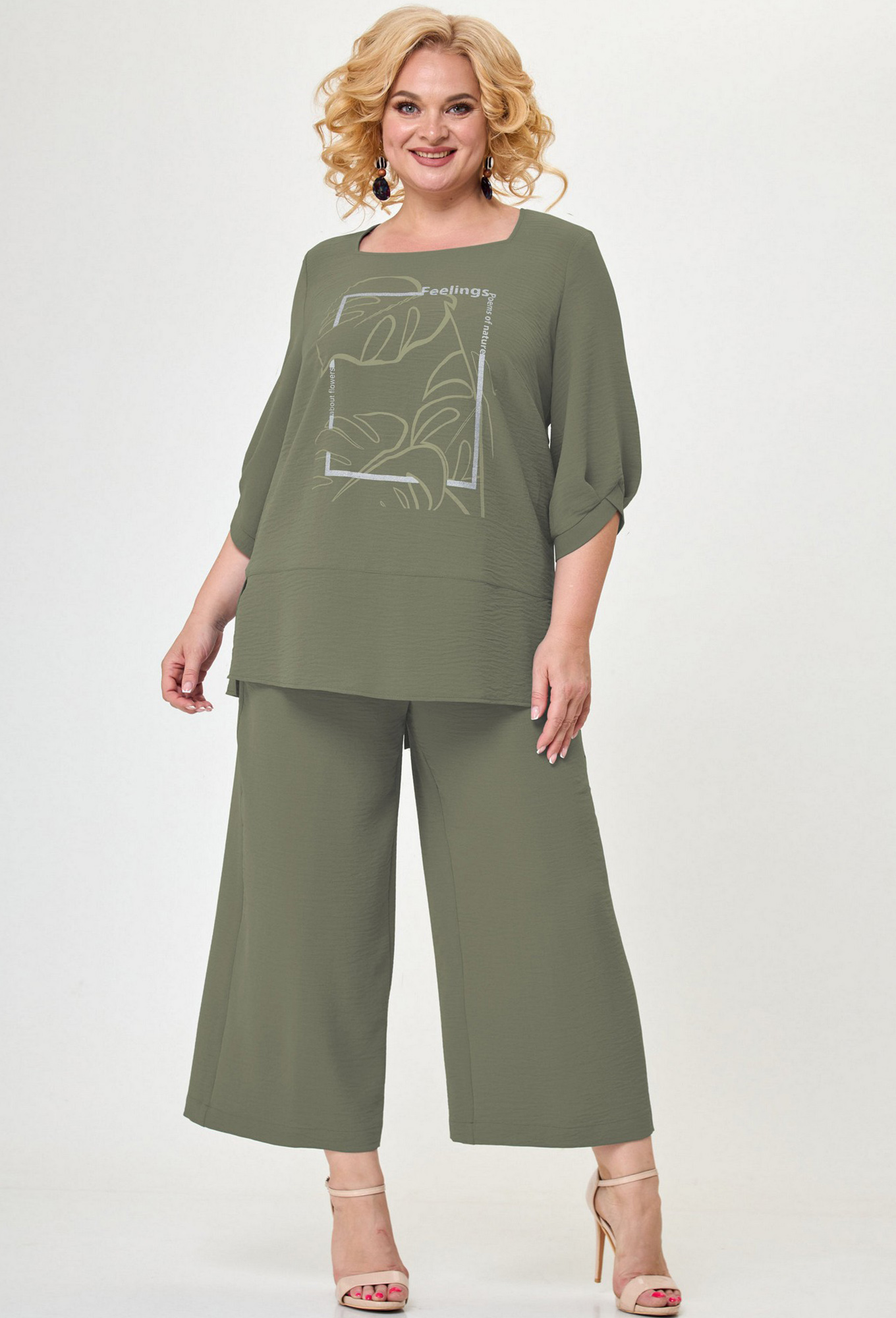 Модель: ЛТС 2221 хаки Рост: 164 с..показатьм (рост модели на фото 170см) Сезон: Весна-Лето Тип ткани: Вискоза 65%, полиэстер 35%, эластан 5%Стильный и практичный комплект, состоит из блузки и кюлот выполненных из комфортной к телу тонкой ткани с эффектом крэша. Блузка прямого силуэта с трапецевидным вырезом горловины, полочка декорирована дизайнерским принтом. По низу блузки притачная баска с перехлестами по бокам и на спинке. Рукав втачной, низ рукава на фигурной притачной манжете. Кюлоты с притачным поясом, присборенном на резинку по спинке и бокам, по переду имитация застежки в виде отделочной строчки, в боковых швах функциональные карманы.