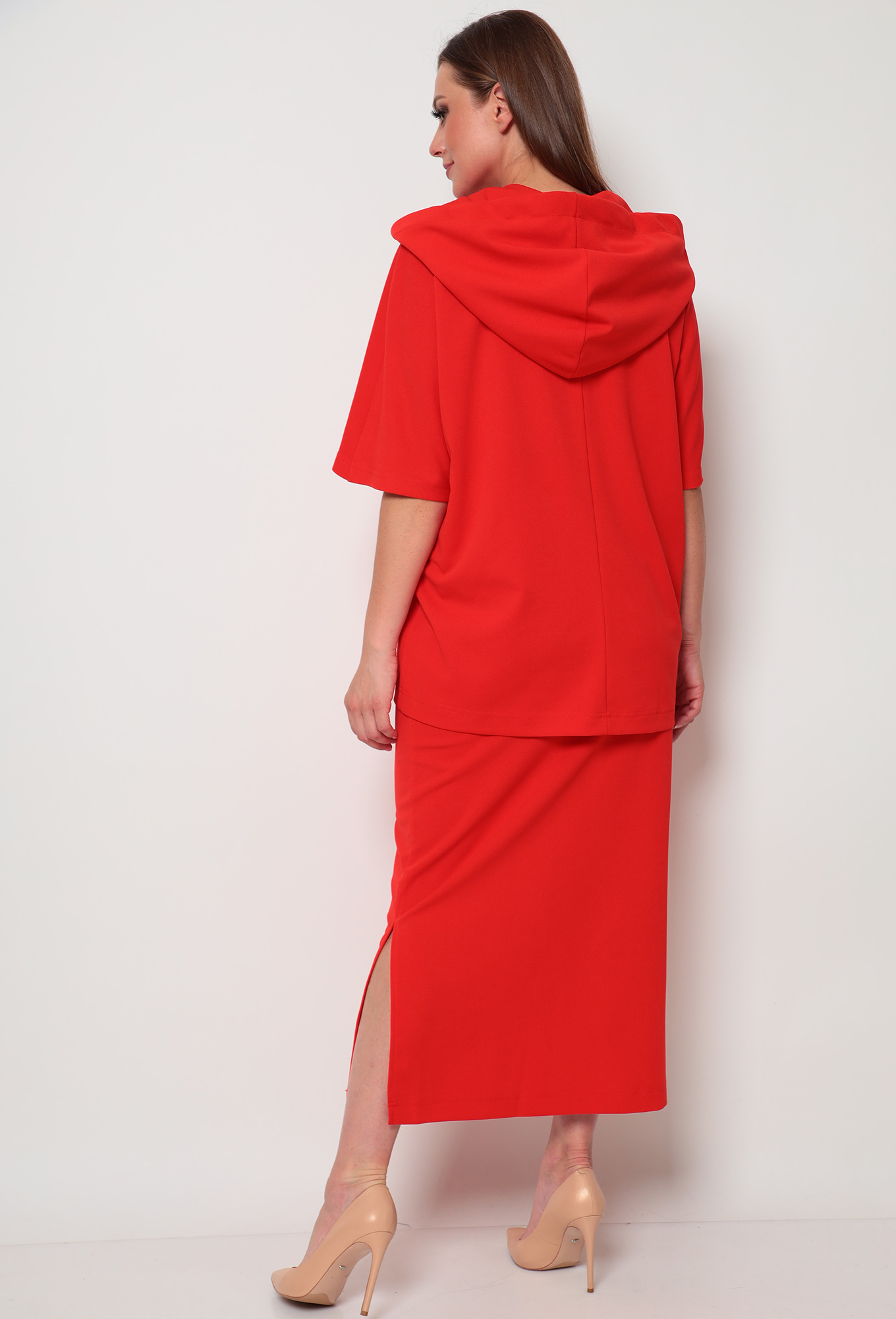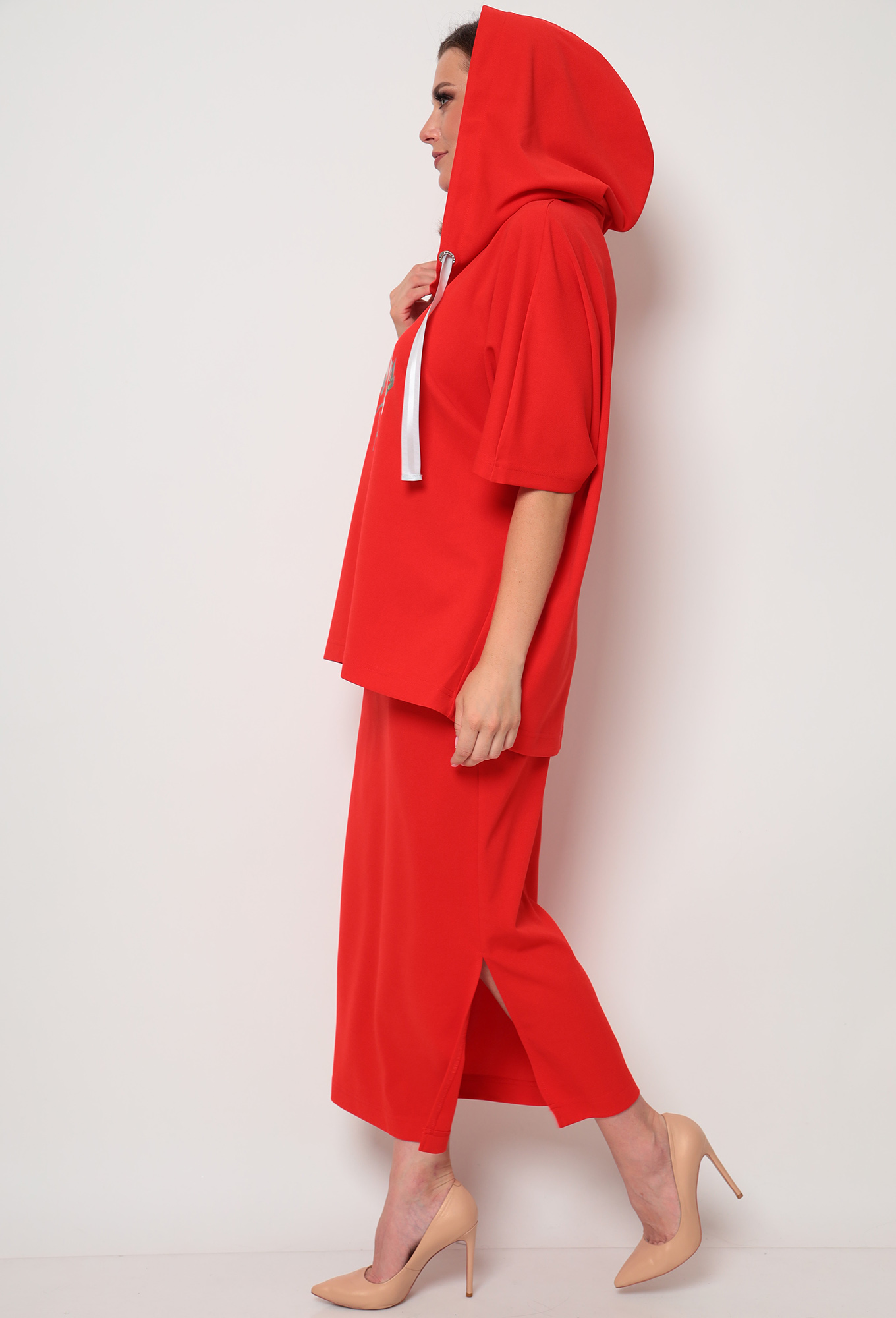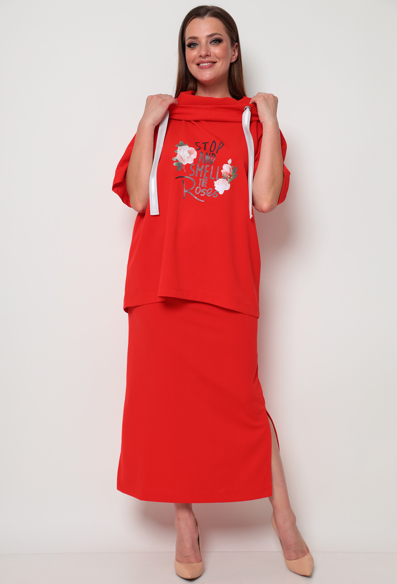 Модель: Мишель Шик 1248 красный Р..показатьост: 164 см (девушка на фото ростом 170см) Сезон: Весна-Лето Тип ткани: 98% полиэстер, 2% спандексУдобный комплект с юбкой прекрасно вольется в повседневный гардероб благодаря своей универсальности. Выполнен из трикотажа, хорошо садится по фигуре, лёгок в обслуживании. Джемпер свободного прилегания с цельнокроеным коротким рукавом, имеет объёмный воротник капюшон, с декоративной лентой, также по переду украшен цветочным принтом. Юбка с боковыми карманами и разрезами, пояс на резинке, отлично сочетается с любой по стилю обувью, а так же прекрасно будет смотреться с любым другим верхом. Длина джемпера по спинке 71 см, длина рукава 43 см. Длина юбки по боковому ходу 96см. Изделие подойдет на рост 170 см.ост: 164 см (девушка на фото ростом 170см)