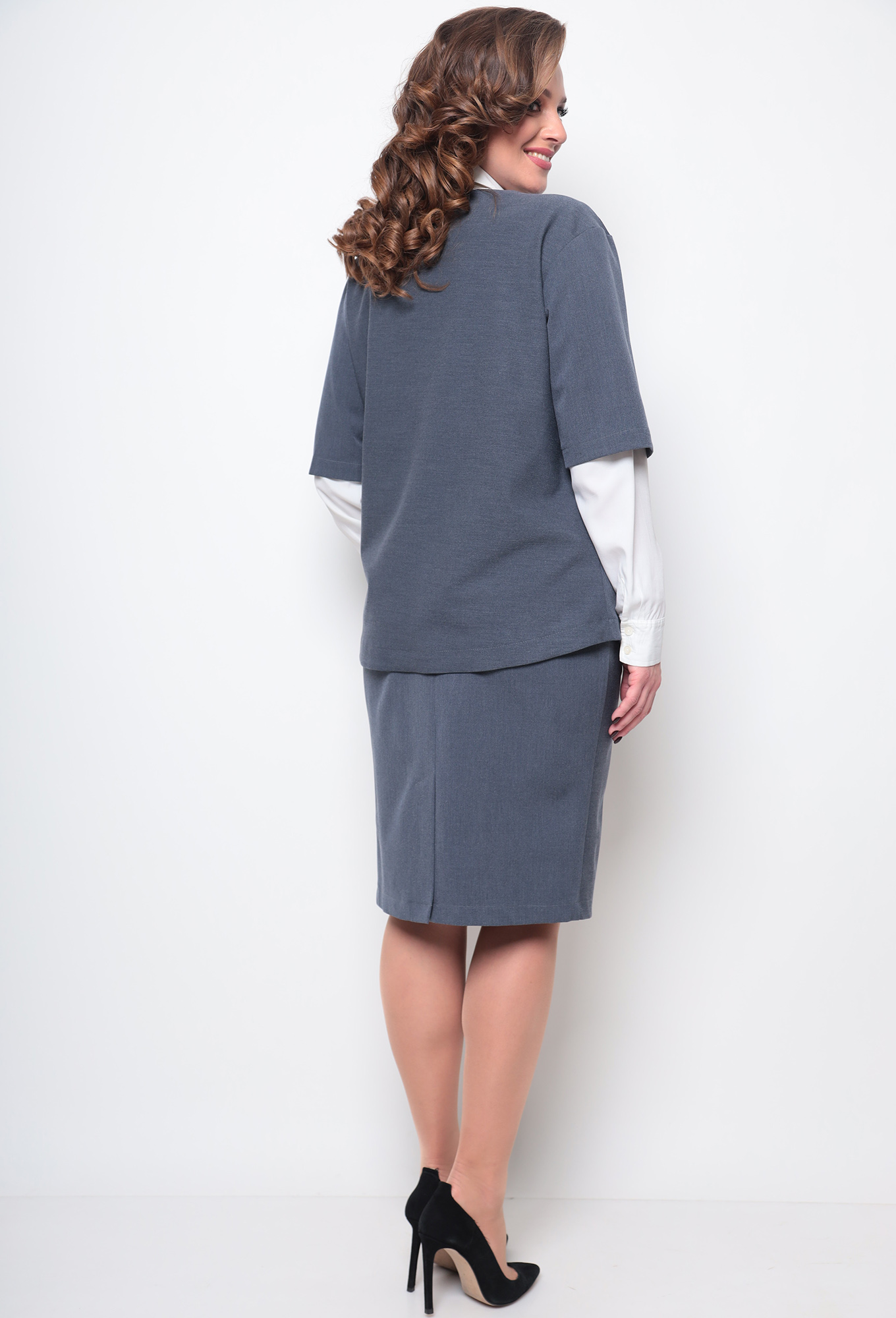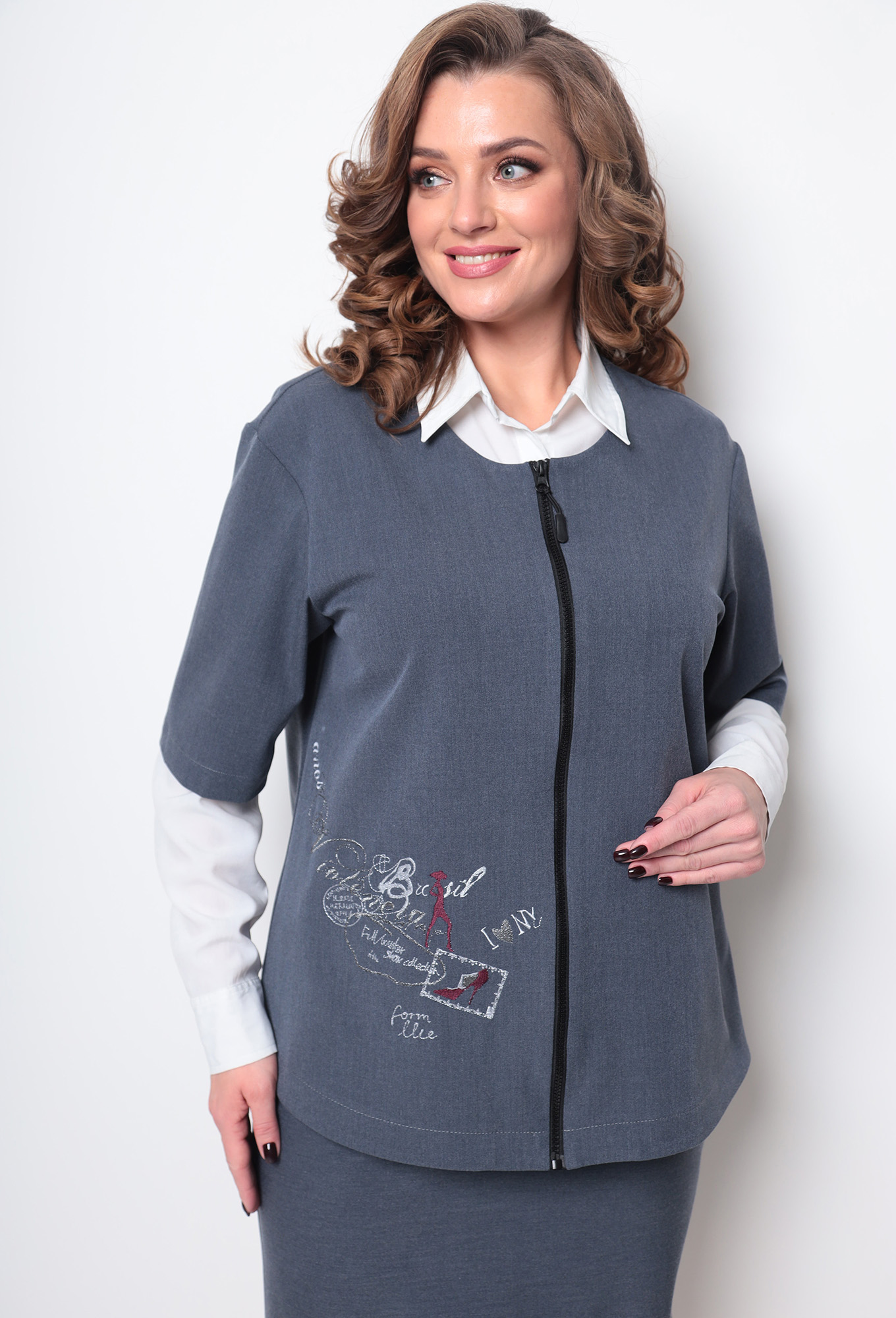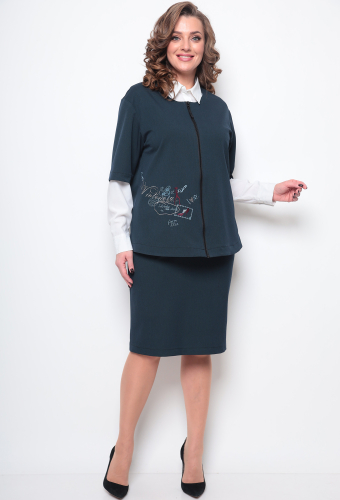 Модель: Мишель Шик 1268 графит Ро..показатьст: 164 см (девушка на фото ростом 170см) Сезон: осень-зима Тип ткани: полиэстер 67%, вискоза 29%, спандекс 4%Женственный комплект из трикотажного полотна дарит образу мягкость и элегантность, благодаря чему комплект подойдет и для праздничных образов, а также и для будней. Жакет свободного прилегания с центральной застежкой на молнии, рукав ¾. В качестве декора по переду изделия — вышивка. Юбка классического силуэта, с боковыми карманами, пояс на резинке, сзади юбки шлица и молния. Комплект будет отлично сочетаться с другими вещами вашего гардероба, и будет практичным и удобным в носке. Длина жакета по спинке — 66 см, длина рукава от горловины — 46см. Длина юбки 63см. Изделие подойдет на рост 170 см.ст: 164 см (девушка на фото ростом 170см)