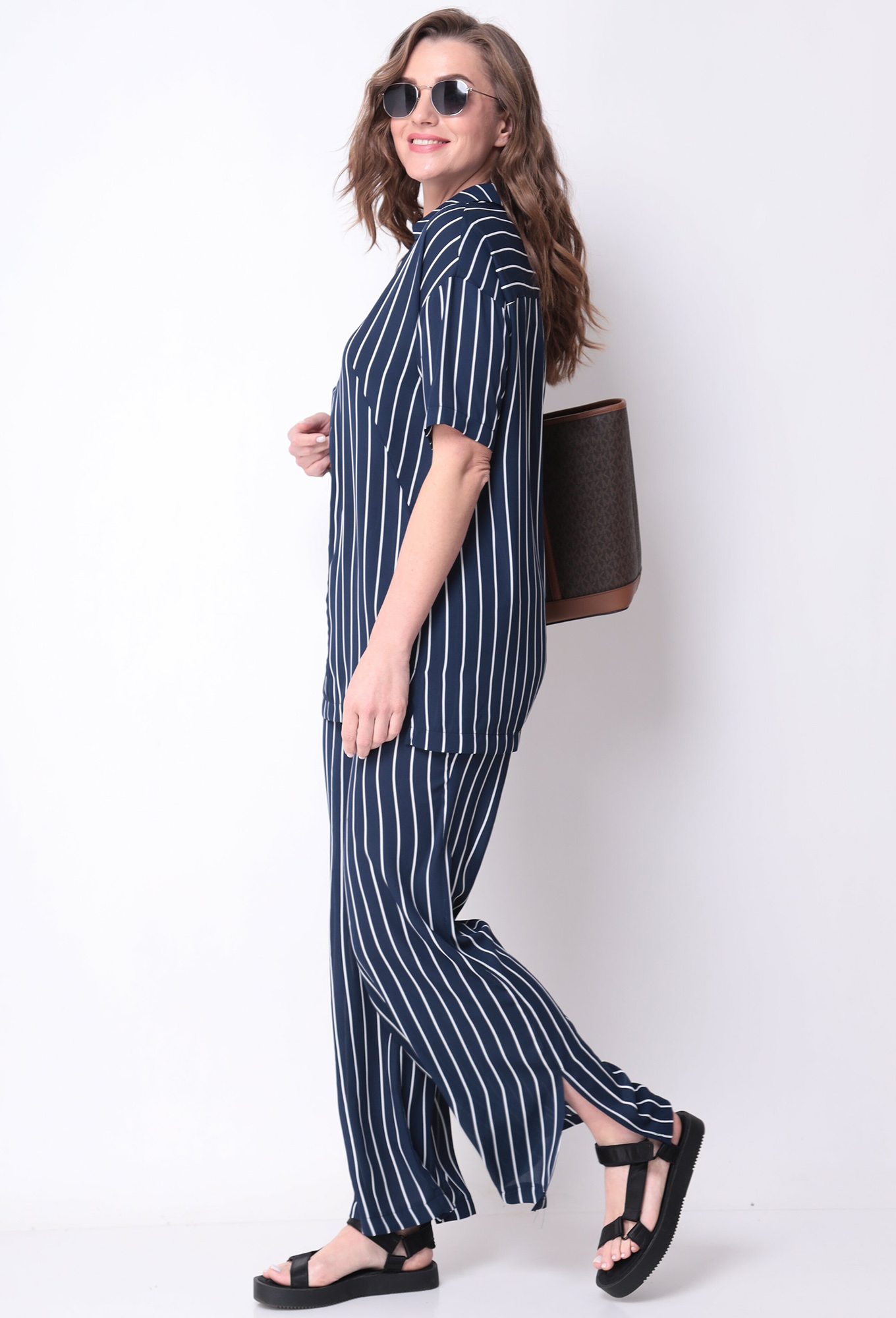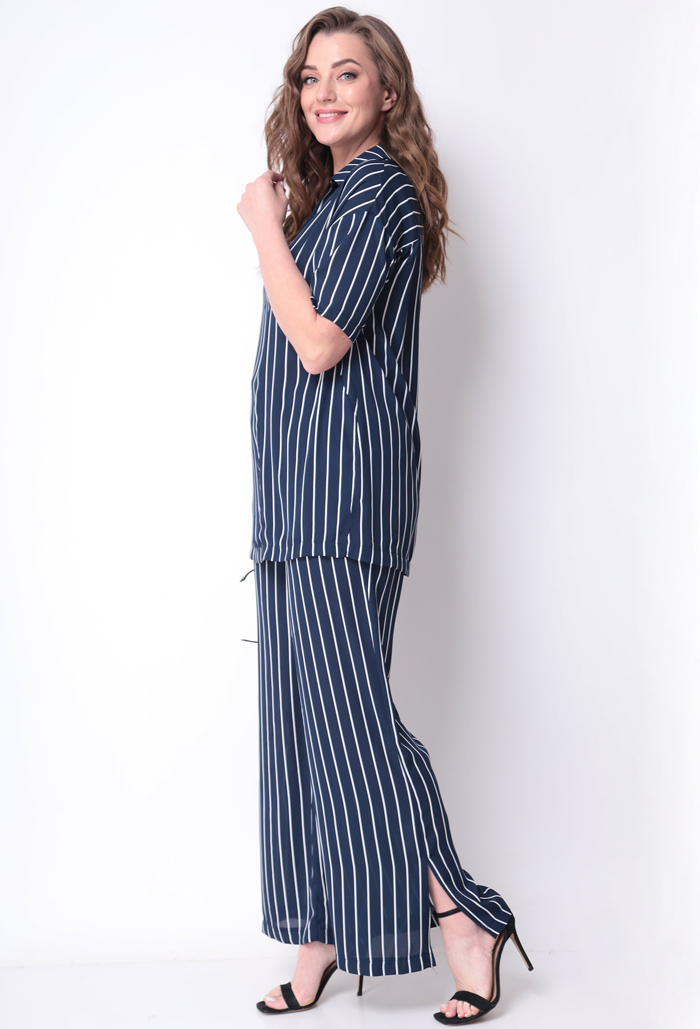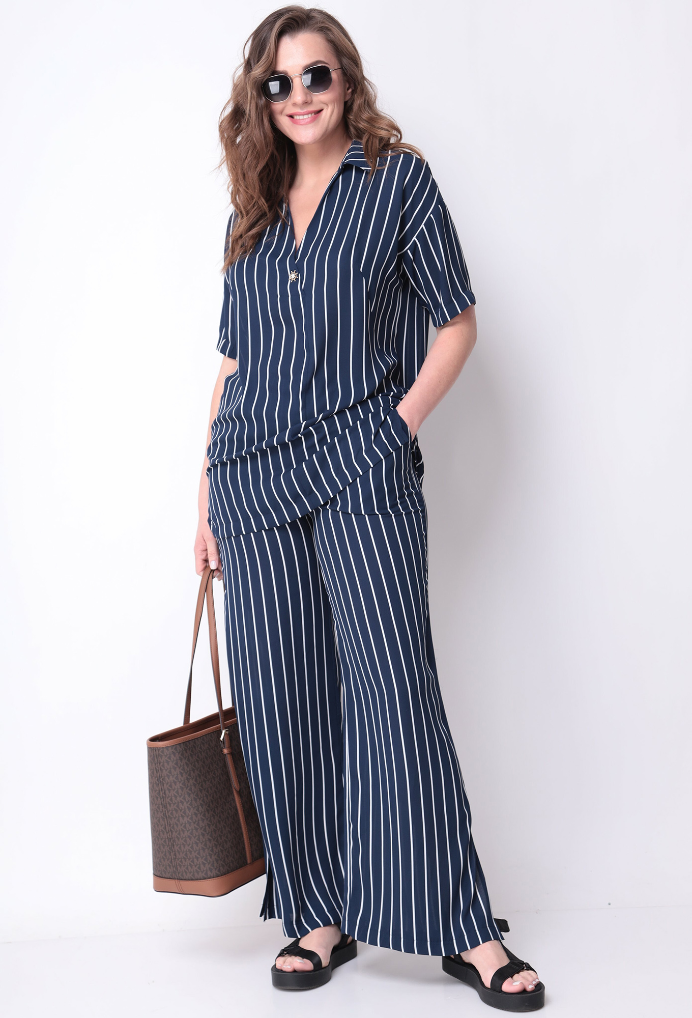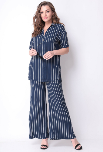 Модель: Мишель Шик 1299 синий Рос..показатьт: 164 см (девушка на фото ростом 170 см) Сезон: Весна-Лето Тип ткани: 100% полиэстерСтильный женский комплект из струящейся шифоновой ткани в полоску. Блуза с коротким рукавом, свободного прилегания, а V-образный вырез сделают блузу универсальной и модной. Съемная брошь идет в комплекте. Брюки палаццо с карманами, высокой посадки, пояс на резинке, по бокам снизу разрезы. Комплект отлично будет сочетаться с различной по стилю обувью, а универсальность кроя сделают его любимым изделием Вашего гардероба в наступающем сезоне.