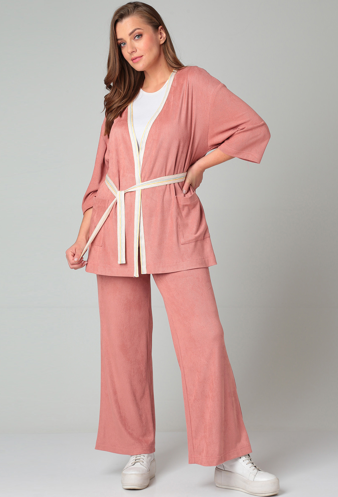 Модель: Мишель Шик 1314 пудра Рос..показатьт: 164 см (девушка на фото ростом 170см) Сезон: Круглогодичный Тип ткани: 94% полиэстер, 6% спандексКлассный комфортный костюм-кимоно в повседневном стиле, выполнен из струящегося трикотажа в рубчик с односторонним ворсом. Кардиган на запах с поясом свободного кроя, с широким спущенным рукавом и накладными карманами. Рукав три четверти. Брюки палаццо — свободного кроя, высокой посадки, имеют карманы. Оба изделия отличаются своей функциональностью, их можно с легкостью комбинировать с другими вещами Вашего гардероба. Длина джемпера по спинке 75 (+/-1) см, длина рукава от горловины 57 см. Длина брюк по боковому шву 105 см, по шаговому 76 см.т: 164 см (девушка на фото ростом 170см)