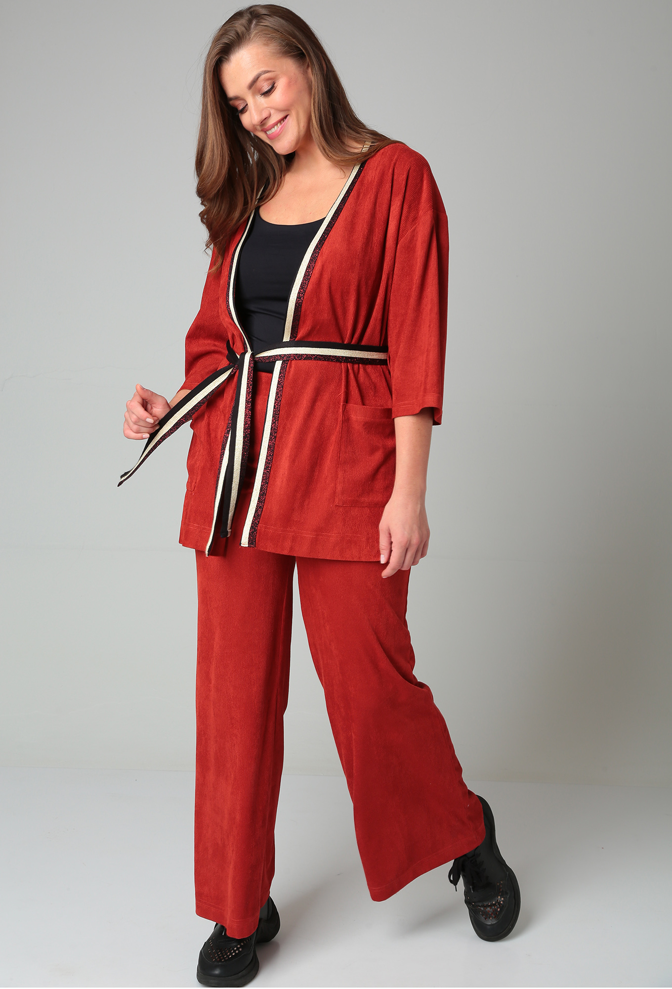 Модель: Мишель Шик 1314 терракот ..показатьРост: 164 см (девушка на фото ростом 170см) Сезон: Круглогодичный Тип ткани: 94% полиэстер, 6% спандексКлассный комфортный костюм-кимоно в повседневном стиле, выполнен из струящегося трикотажа в рубчик с односторонним ворсом. Кардиган на запах с поясом свободного кроя, с широким спущенным рукавом и накладными карманами. Рукав три четверти. Брюки палаццо — свободного кроя, высокой посадки, имеют карманы. Оба изделия отличаются своей функциональностью, их можно с легкостью комбинировать с другими вещами Вашего гардероба. Длина джемпера по спинке 75 (+/-1) см, длина рукава от горловины 57 см. Длина брюк по боковому шву 105 см, по шаговому 76 см.Рост: 164 см (девушка на фото ростом 170см)