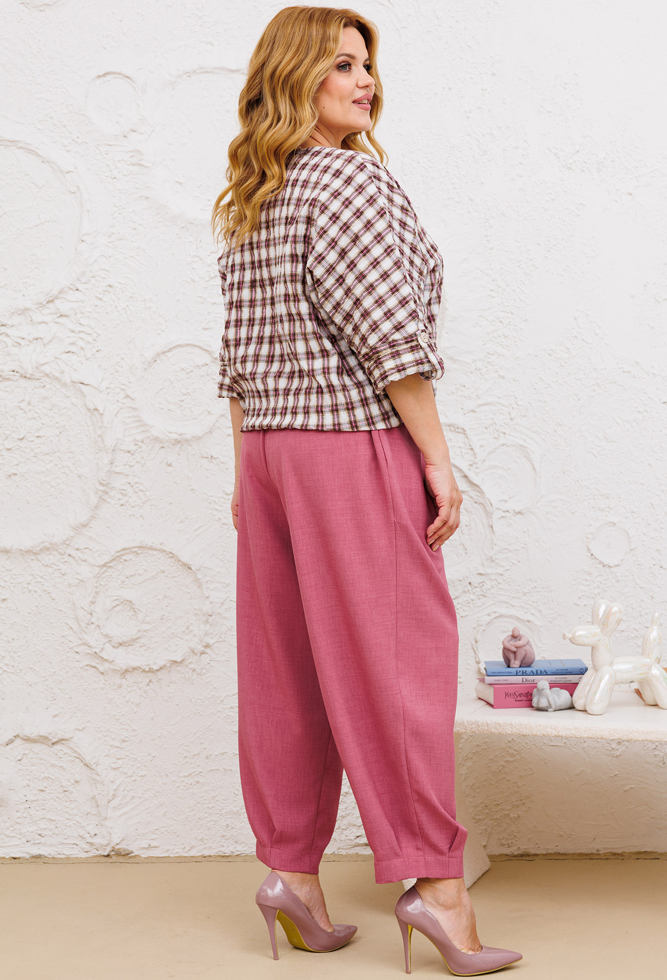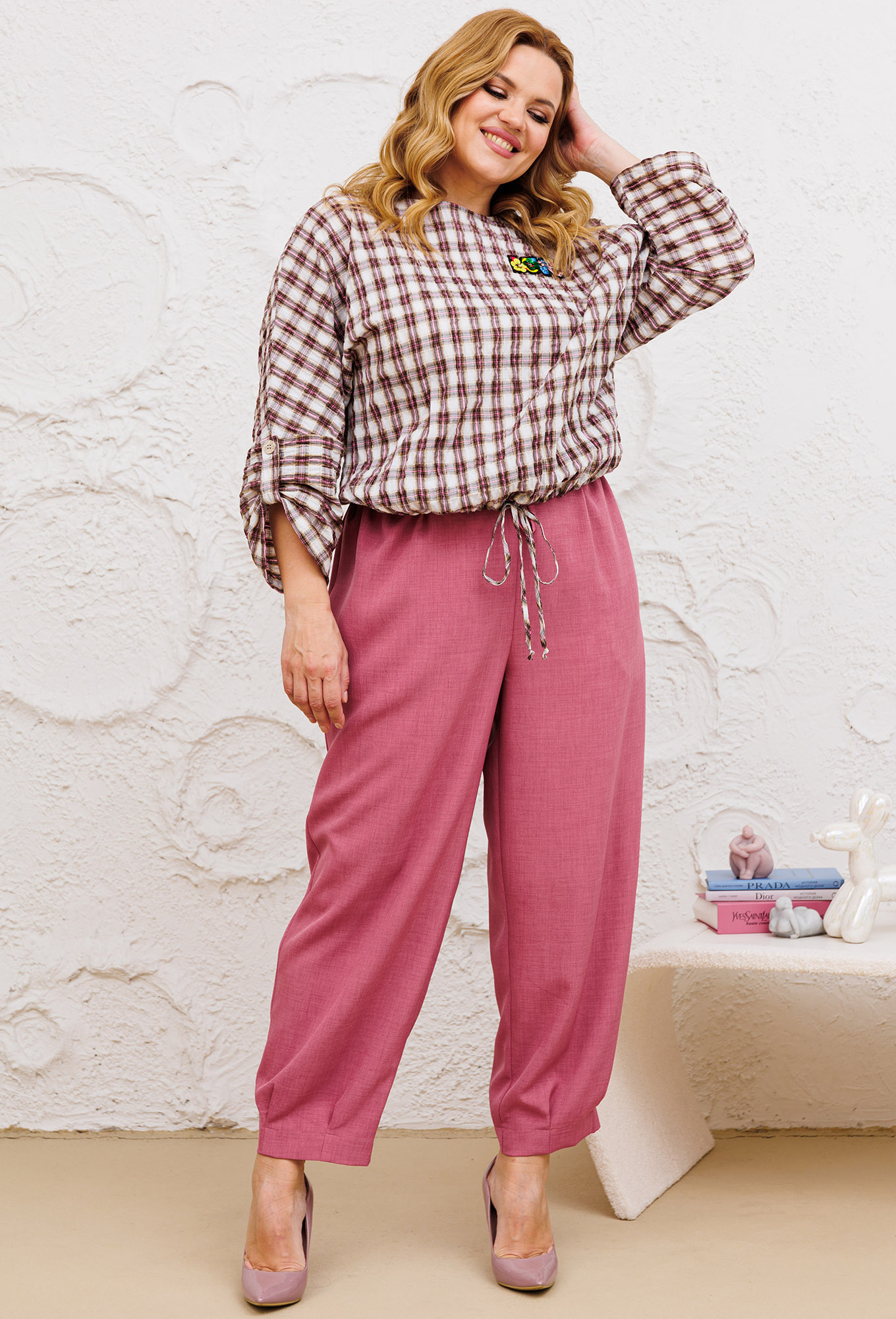 Модель: Мишель Шик 1342 лиловый клетка..показать> Рост: 164 см (девушка на фото ростом 170 см) Сезон: Весна-Лето Тип ткани: Блуза - 55% хлопок, 45% вискоза,Брюки - 100% полиэстерКомплект женский брючный повседневный, свободного кроя будет актуальным, как и для рабочих будней, также и прогулок. Блуза выполнена из хлопчатобумажного материала, крой оверсайз, длиной до бедра , перед и спинка цельные, плечо спущенное, рукав втачной одношовный, 3/4 с патой и пуговицей, горловина круглая на окантовке, по переду в качестве декора используется нашивка из пайеток, перед блузы по низу может стягиваться шнуровкой. Брюки-шаровары , длиной 7/8 , на притачном поясе с резинкой до центральной вставки со шнуровкой, имеются два кармана в боковых швах, по низу брюк застрочены складки и широкая подгибка. Длина блузы по спинке 59+-1 см, длина рукава 62+-1см, длина брюк по боковому шву 96+-1 см, длина брюк по шаговому шву 67 +-1 см.>