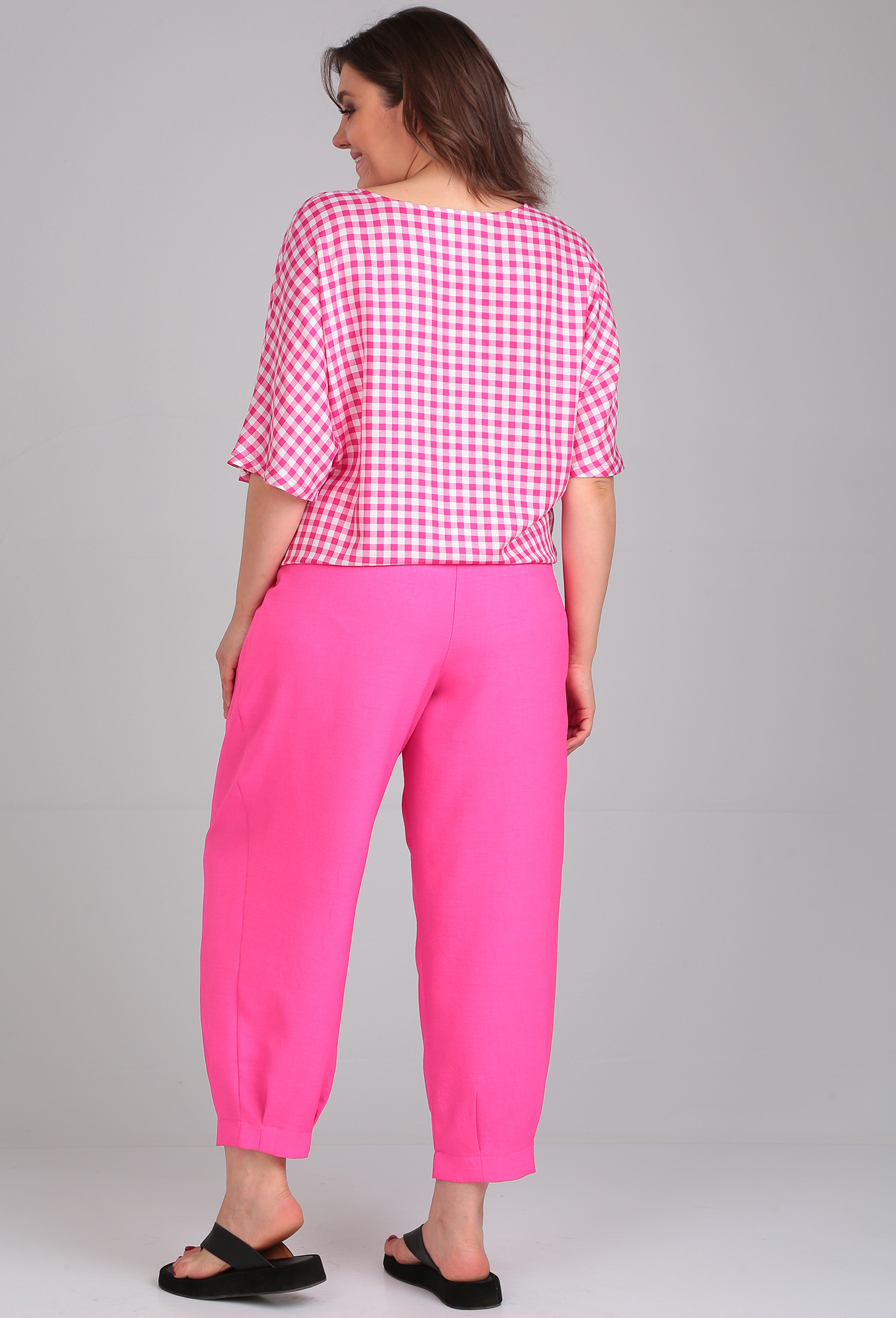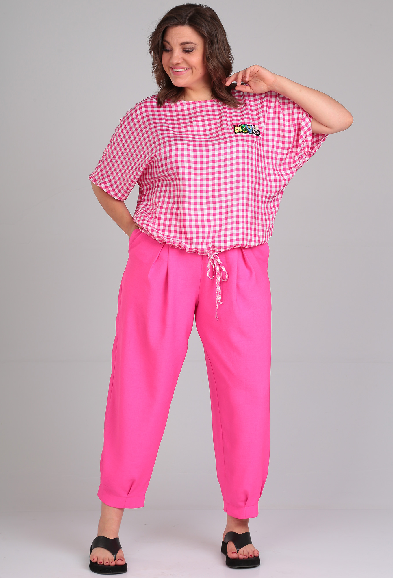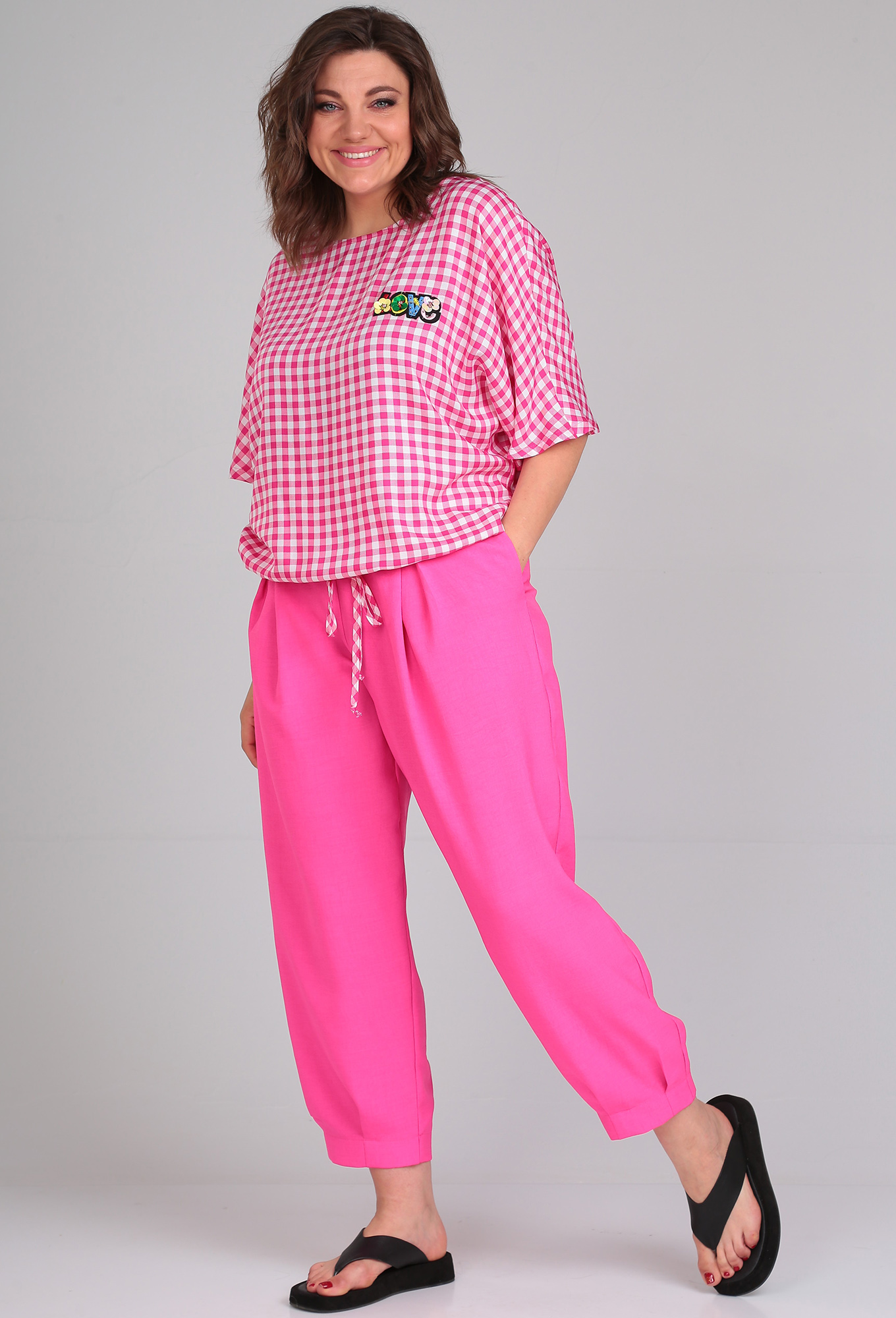 Модель: Мишель Шик 1342 розовый клетка..показать> Рост: 164 см (девушка на фото ростом 170 см) Сезон: Весна-Лето Тип ткани: Блуза — 100% вискозаБрюки — 96% пэ, 4% спандексКомфортный летний брючный комплект для повседневной носки. Брюки-шаровары из легкой ткани — лен-вишер, которая хорошо держит форму, длиной 7/8, с поясом на резинке и боковыми карманами. Укороченный блузон свободного кроя из натуральной приятной на ощупь вискозы, имеет кулиску по низу изделия, которой можно регулировать плотность прилегания. Цельнокроеный рукав, округлая горловина. По переду блузона в качестве декора аппликация «love». Комплект отлично сочетается с любой по стилю обувью, он прекрасно вольется в Ваш гардероб, благодаря своей универсальности.