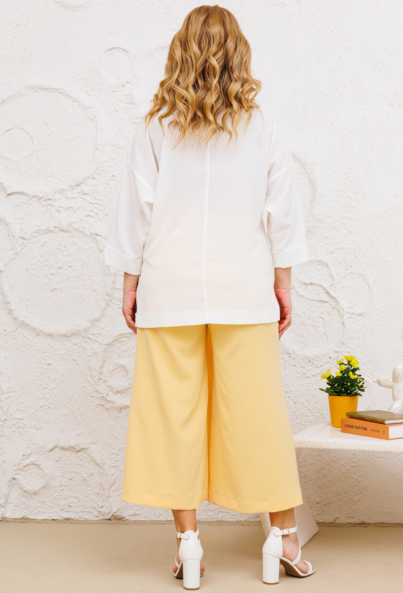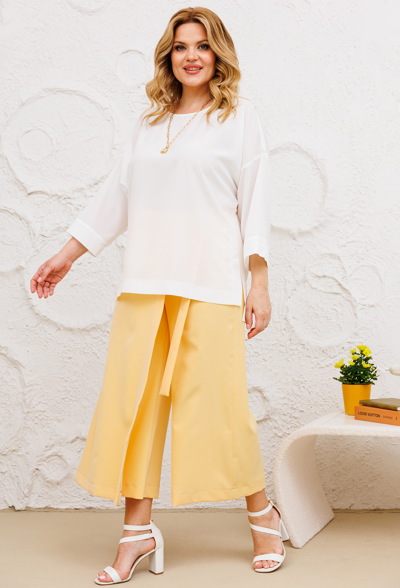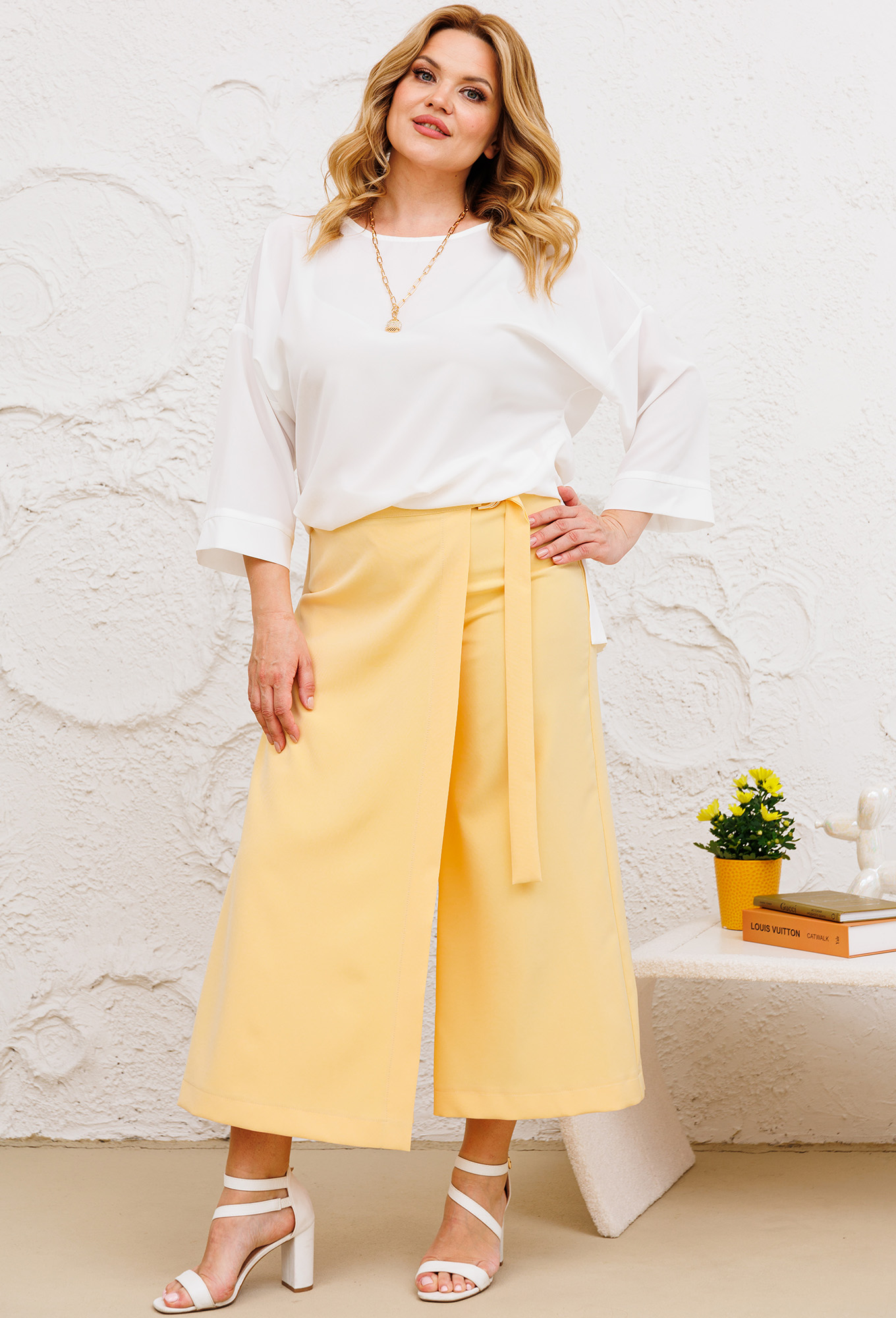 Модель: Мишель Шик 1350 св.желтый ..показать>Рост: 164 см (девушка на фото ростом 170 см) Сезон: Весна-Лето Тип ткани: Блуза — 100% полиэстер, Брюки-кюлоты — 91% полиэстер, 9% спандексМодный и актуальный комплект из приятной ткани. Брюки-кюлоты с элегантным запахом, свободной посадки, брючины широкие укороченные, чуть выше щиколотки. Притачной пояс с резинкой поверху, запах фиксируется поясом на карабин. Блуза свободного кроя, рукав спущен, по бокам разрезы, благодаря чему ее с легкостью можно носить как навыпуск, так и заправленной. Такой комплект станет любимым в Вашем гардеробе, потому что это воплощение стиля и комфорта. Оба изделия прекрасно сочетаются между собой и могут смело создавать дополнительные стильные комбинации с другими вещами.