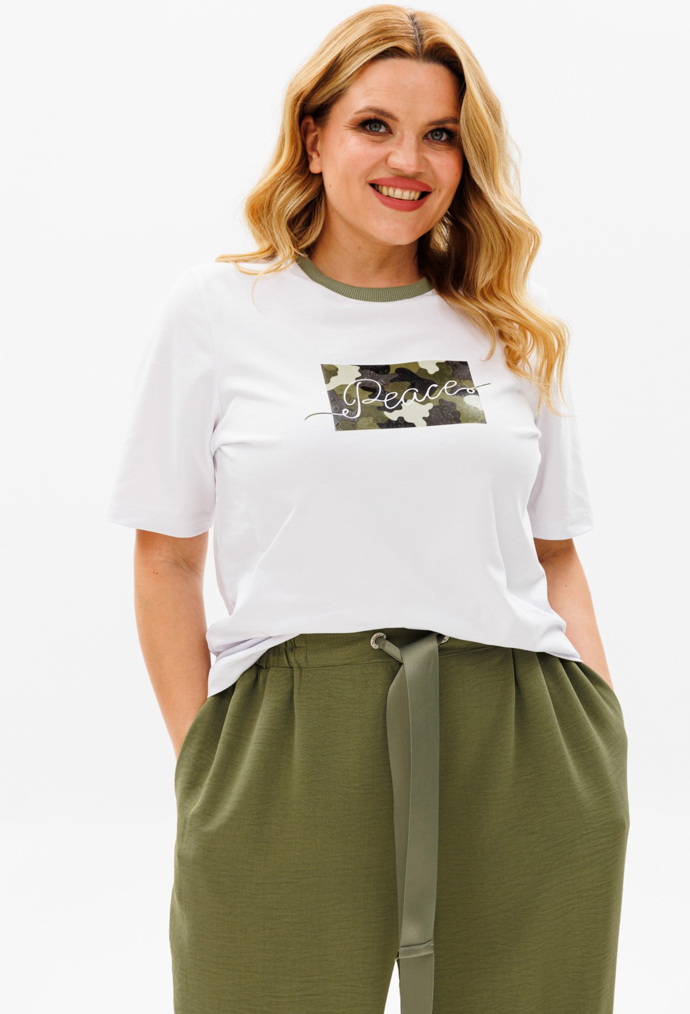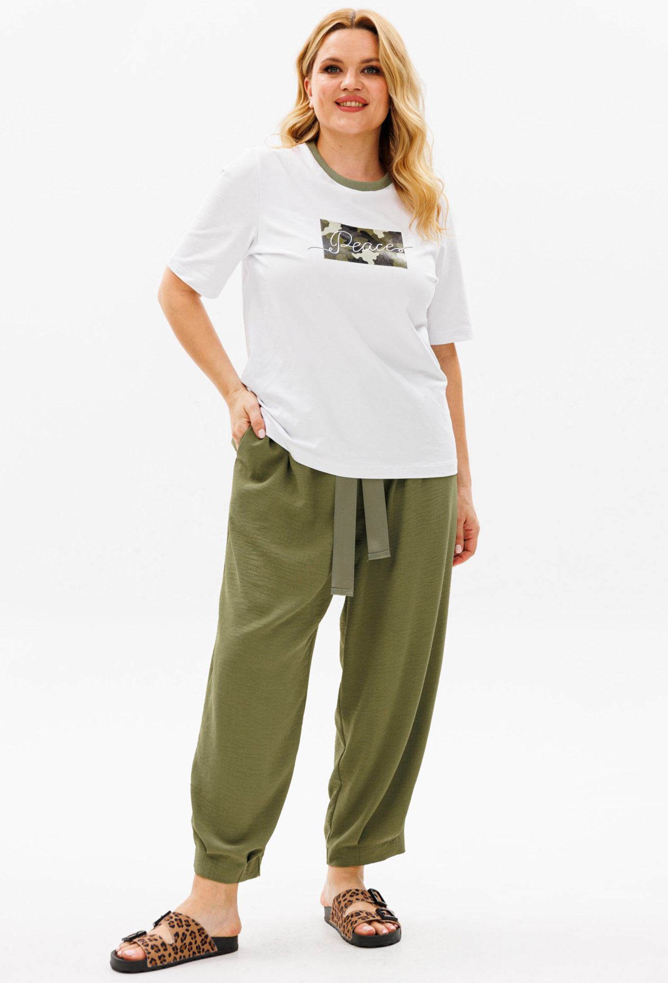 Модель: Мишель Шик 1377 хаки Рост..показать: 164 см (девушка на фото ростом 170 см) Сезон: Весна-Лето Тип ткани: футболка — 95% хлопок, 5% эластан; брюки — 100% полиэстерУниверсальный и удобный женский брючный комплект. Данный комплект отличный вариант для повседневной носки. Изделие состоит из футболки и брюк-шароваров. Футболка свободного кроя выполнена из хлопковой ткани. Рукав укороченный, круглая горловина — кашкорсе, перед и спинка прямые. По переду изделие украшено принтом. Футболку с легкостью можно носить как навыпуск, так и заправленной. Брюки-шаровары с поясом на резинке и декоративными лентами. Имеются боковые карманы в швах. Также по низу передних и задних половинок односторонние складки, придающие пышность брюкам. С данным комплектом можно смело создавать стильные образы как вместе, так и по отдельности, а свободный силуэт не будет сковывать ваших движений и вы будете чувствовать себя комфортно при любой погоде.