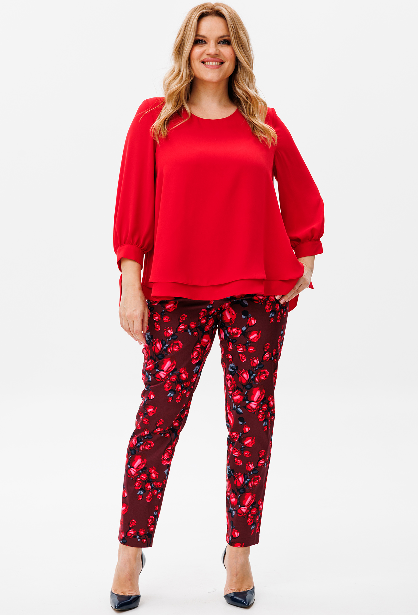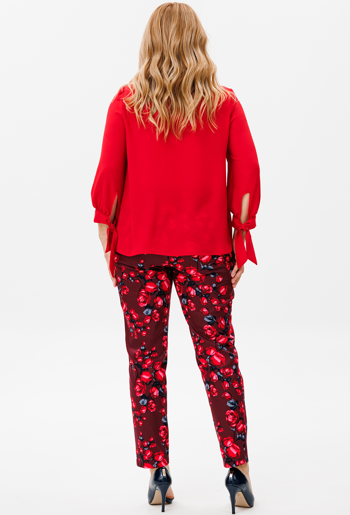 Модель: Мишель Шик 1390 красный розы ..показатьРост: 164 см (девушка на фото ростом 170см) Сезон: Весна-Лето Тип ткани: Блуза- 100% полиэстерБрюки- 100% хлопокНарядный женский комплект из шифоновой блузки и брюк идеально подойдёт для любых торжеств. Двухслойная блузка выполнена из струящегося шифона. Рукав ¾, низ рукава выполнен на завязках. Брюки выполнены из костюмной ткани в яркий рисунок, садятся по фигуре, к низу заужены, спереди на молнии с гульфиком, высокая посадка, в обтачку пояса вставлена резинка, длина 7/8, от пояса к боковым швам косые карманы. Благодаря расцветке и фасону изделие станет незаменимым в вашем гардеробе.