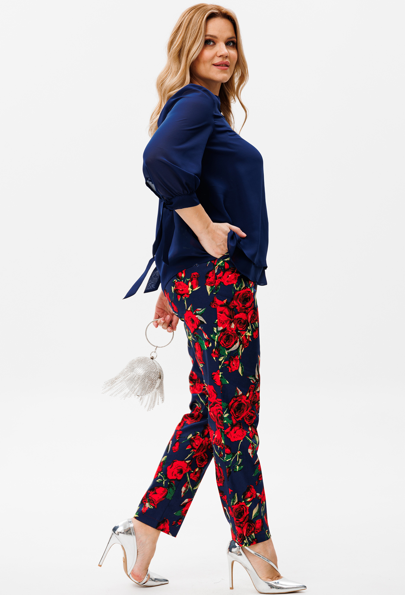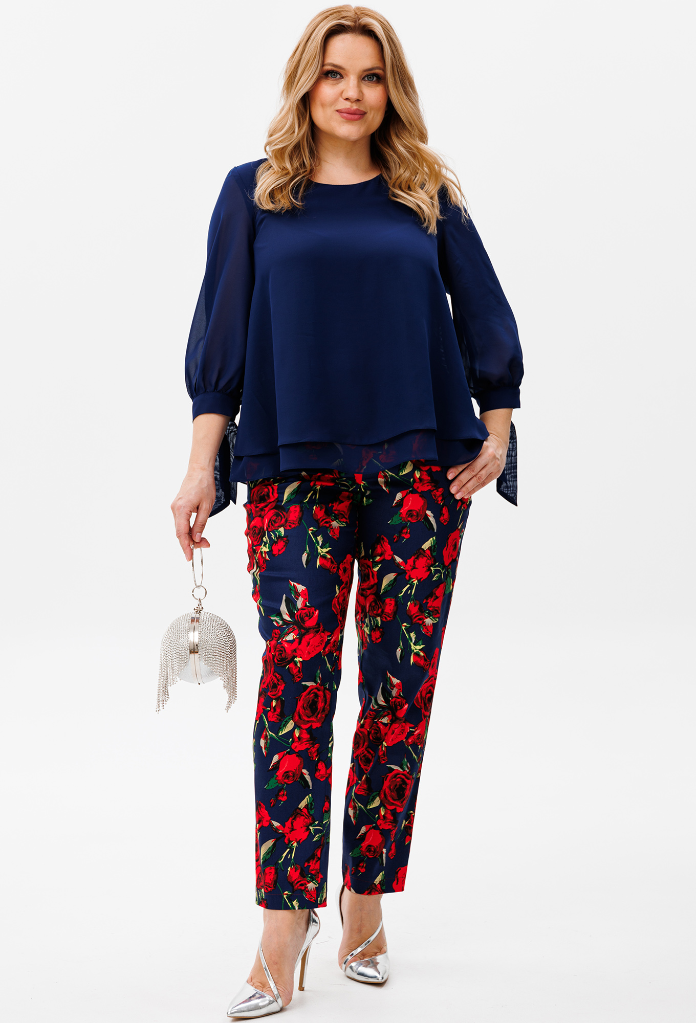 Модель: Мишель Шик 1390 синий розы ..показатьi>Рост: 164 см (девушка на фото ростом 170см) Сезон: Весна-Лето Тип ткани: Блуза- 100% полиэстерБрюки- 100% хлопокНарядный женский комплект из шифоновой блузки и брюк идеально подойдёт для любых торжеств. Двухслойная блузка выполнена из струящегося шифона. Рукав ¾, низ рукава выполнен на завязках. Брюки выполнены из костюмной ткани в яркий рисунок, садятся по фигуре, к низу заужены, спереди на молнии с гульфиком, высокая посадка, в обтачку пояса вставлена резинка, длина 7/8, от пояса к боковым швам косые карманы. Благодаря расцветке и фасону изделие станет незаменимым в вашем гардеробе.