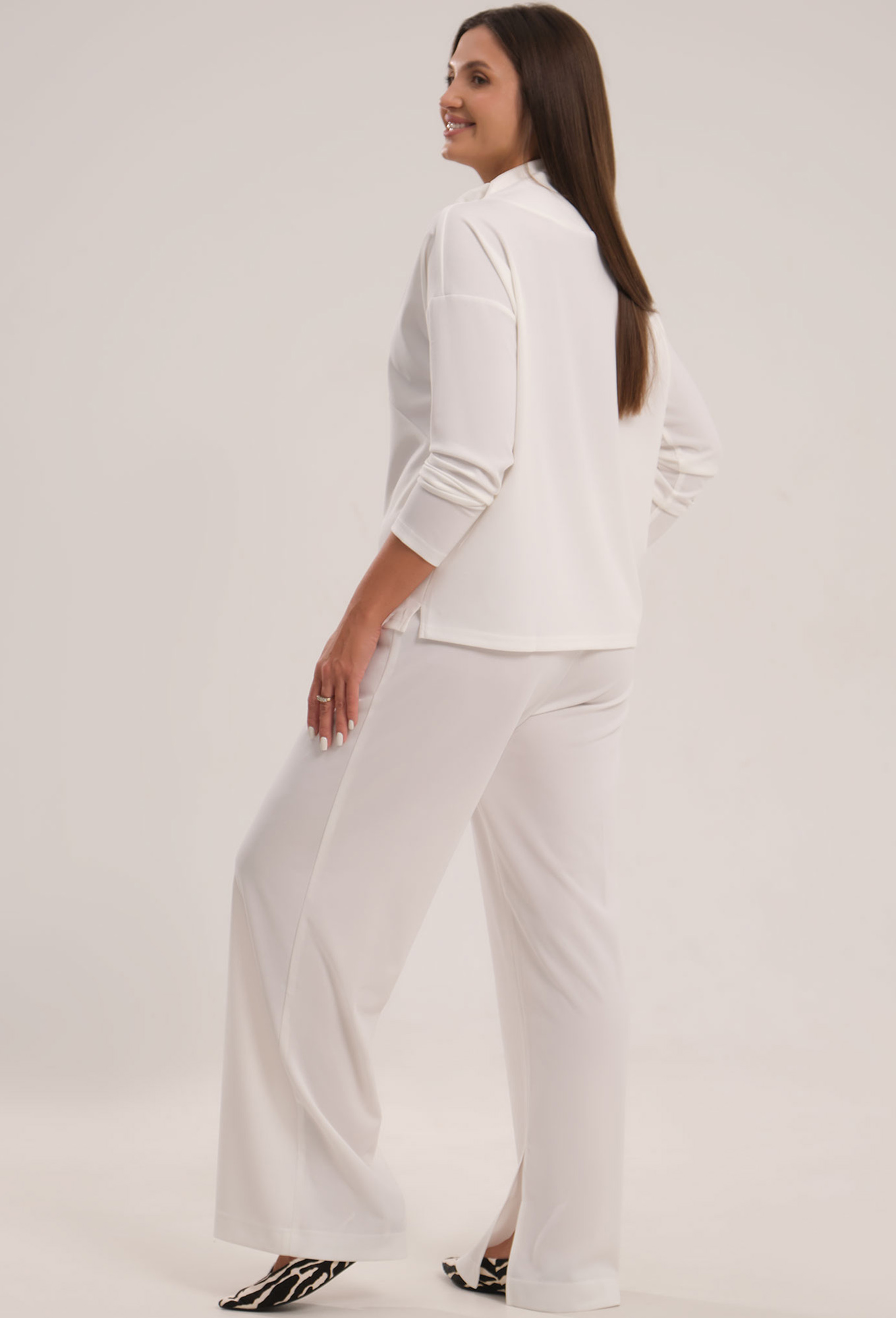 Модель: Панда 119420 молочный Рос..показатьт: 164 см (девушка на фото ростом 170см) Сезон: Круглогодичный Тип ткани: Полиэстер 95%, эластан 5%Комплект женский, состоящий из джемпера и брюк. Вы сможете носить трикотажный летний костюм как дома, так и во время прогулки. Джемпер с воротником-хомутом и длинным спущенным рукавом отлично сочетается с широкими брюками свободного кроя с разрезами по бокам. Благодаря струящейся ткани хорошо садится по фигуре.