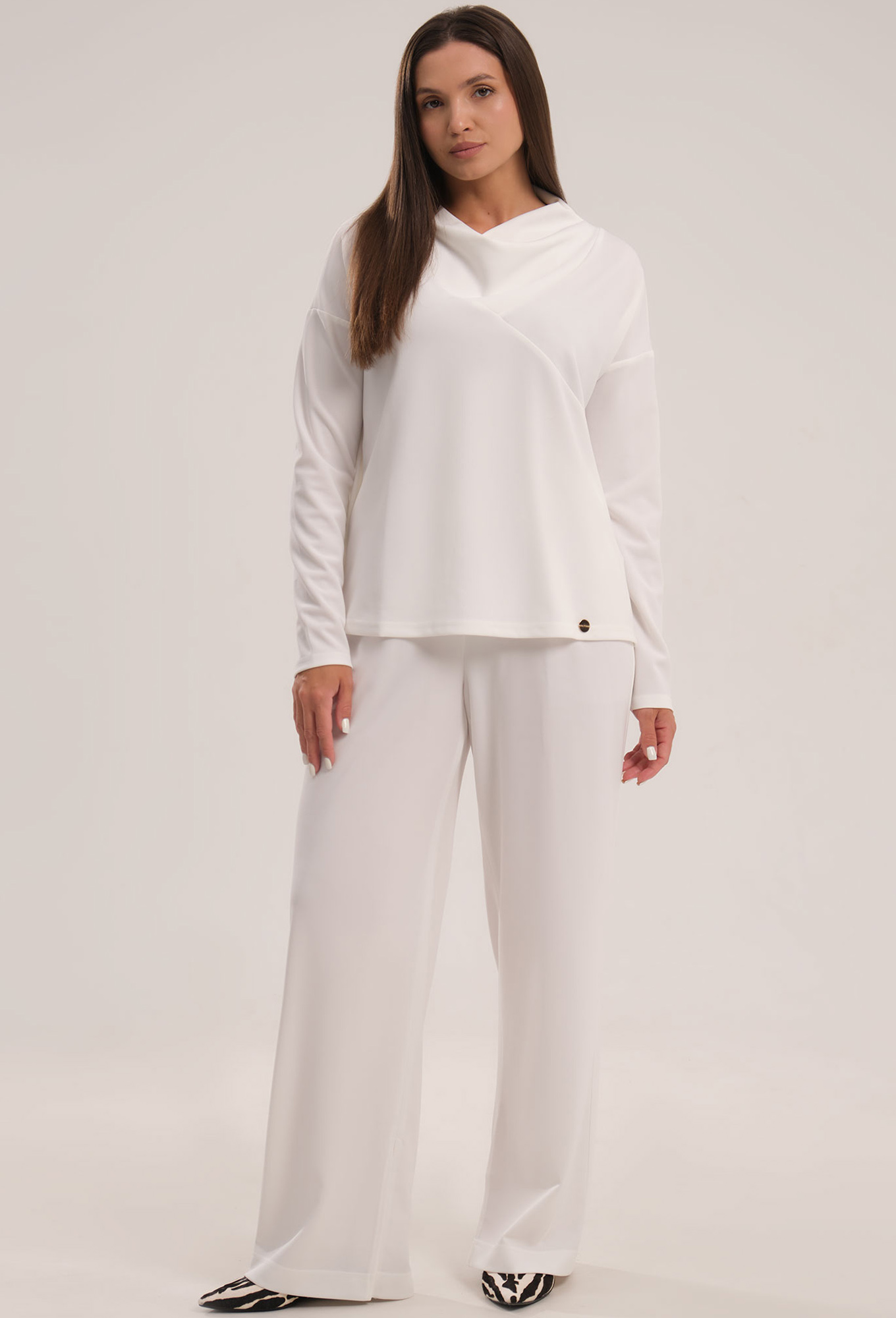 Модель: Панда 119420 молочный Рос..показатьт: 164 см (девушка на фото ростом 170см) Сезон: Круглогодичный Тип ткани: Полиэстер 95%, эластан 5%Комплект женский, состоящий из джемпера и брюк. Вы сможете носить трикотажный летний костюм как дома, так и во время прогулки. Джемпер с воротником-хомутом и длинным спущенным рукавом отлично сочетается с широкими брюками свободного кроя с разрезами по бокам. Благодаря струящейся ткани хорошо садится по фигуре.
