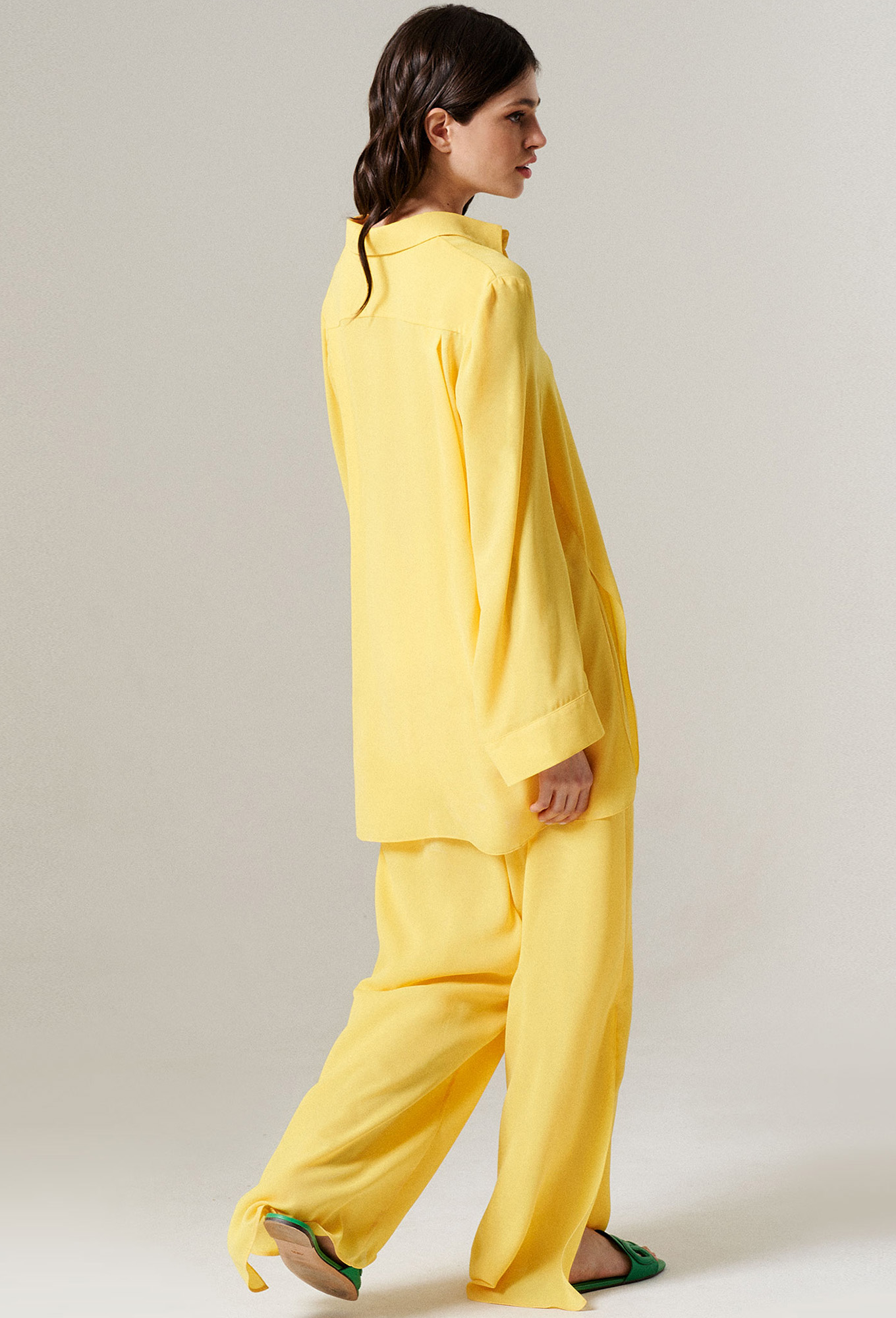 Модель: Панда 149244/149360 жёлтый ..показатьi>Рост: 164 см (девушка на фото ростом 170см) Сезон: Весна-Лето Тип ткани: Полиэстер 100%Комплект состоит из блузы и брюк. Удлиненная блузка-рубашка свободного кроя, на пуговицах. Широкие длинные брюки свободного кроя. С разрезом по бокам.