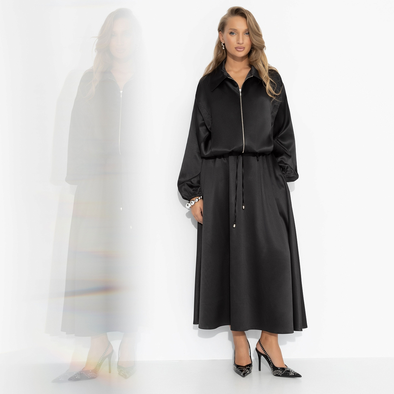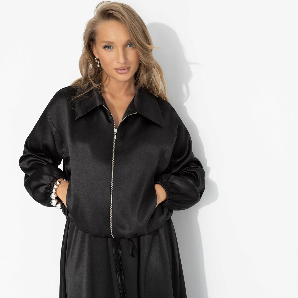 Поздний вечер, огни витрин мелькают в окне такси, и город кажется немного волшебным. Свободный бомбер на молнии, с кулиской по низу, и эффектная юбка с поясом-резинкой образуют стильный дуэт. Черный атлас красиво струится при движении. Носи вместе – или по отдельности, создавая каждый раз новую историю о себе. Комплект из бомбера и юбки. Оба изделия с карманами.