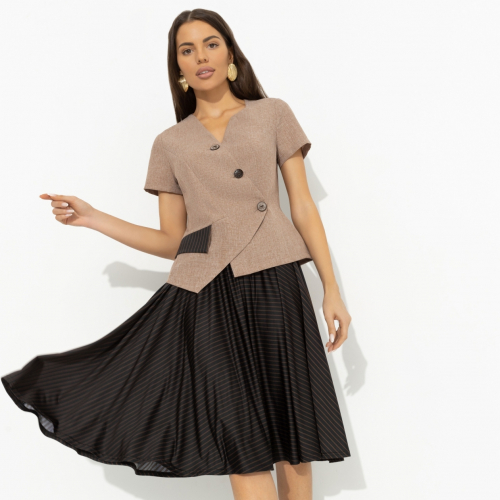 Представьте себе, как комплект с юбкой из «Великой коллекции» добавляет нотку элегантности и стиля в ваш гардероб. Этот дизайнерский комплект одежды с юбкой создан для тех, кто ценит сочетание уникальности и комфорта. Укороченный жакет асимметричного кроя и расклешенная юбка создают гармоничный ансамбль, который подчеркнет вашу индивидуальность. Пояс юбки на резинке обеспечивает дополнительное удобство и свободу движений, а пуговицы жакета в тон принту юбки добавляют завершенности образу. Если вы планируете покупку оптом, этот комплект станет отличным выбором для создания стильных и современных нарядов.