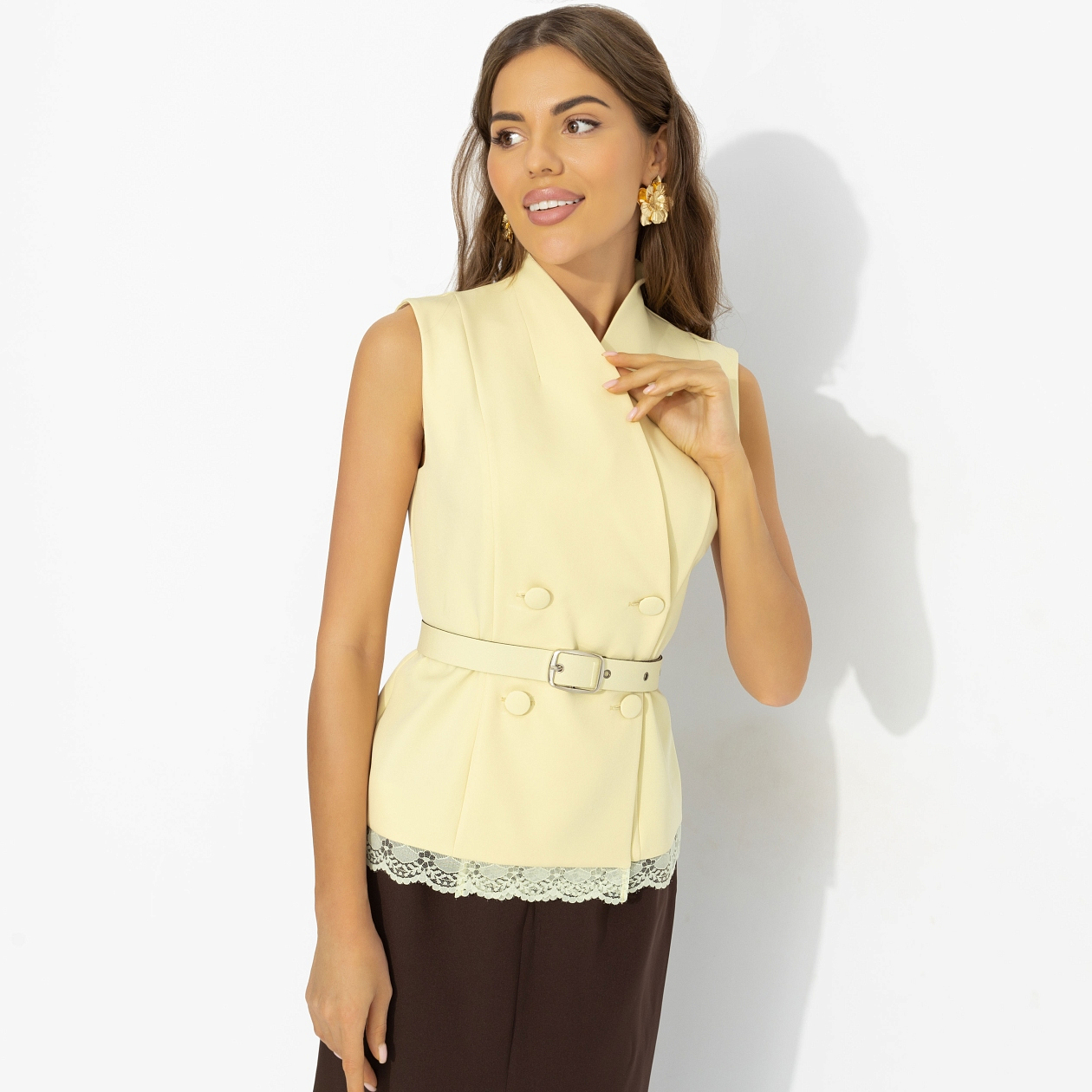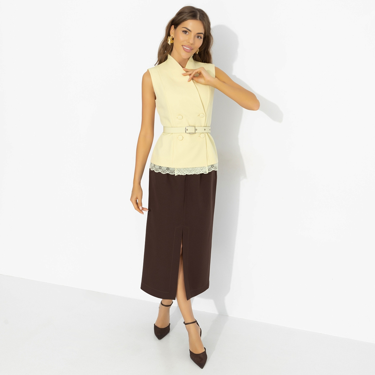 Необязательно нравиться всем. Достаточно тем, у кого есть вкус. Ты выбираешь оттенки не ради одобрения – ради ощущения, что это именно твоё. Мягкий сливочный звучит деликатно, глубокий шоколад добавляет характера. Баланс светлого верха и тёмной юбки работает как продуманный стильный ход. Чистые линии позволяют цвету играть главную роль.