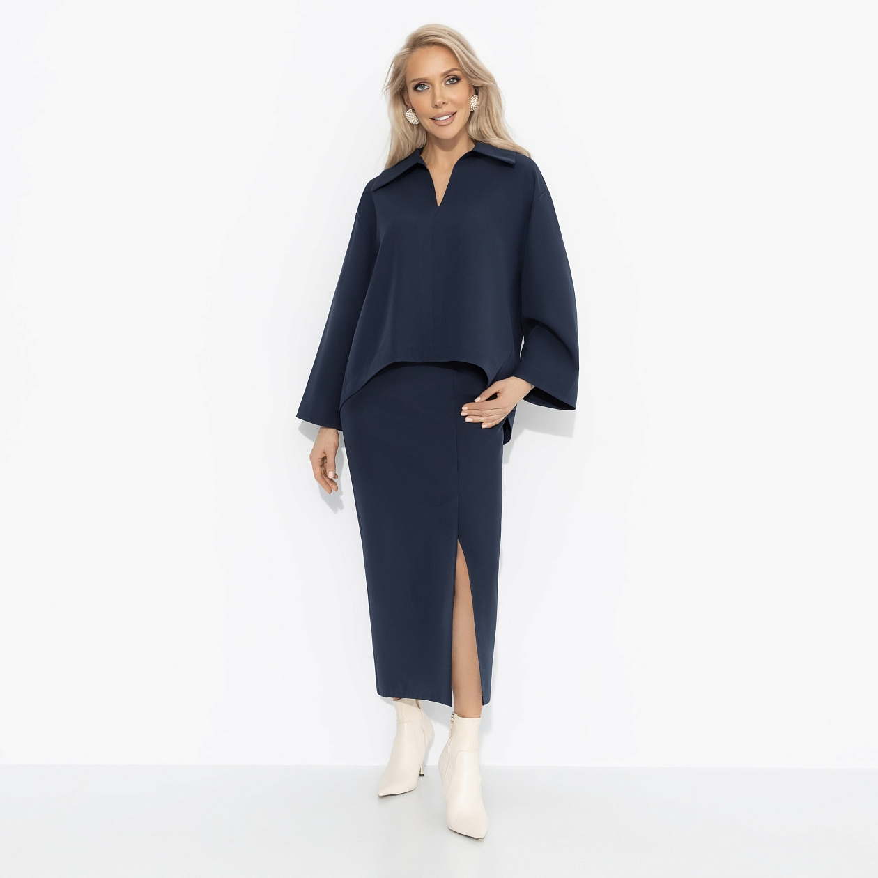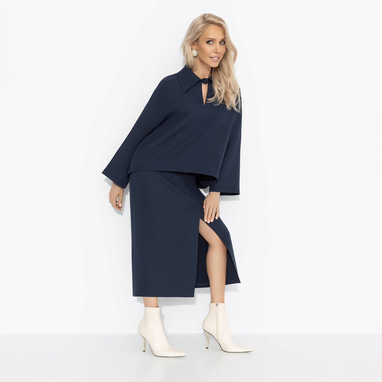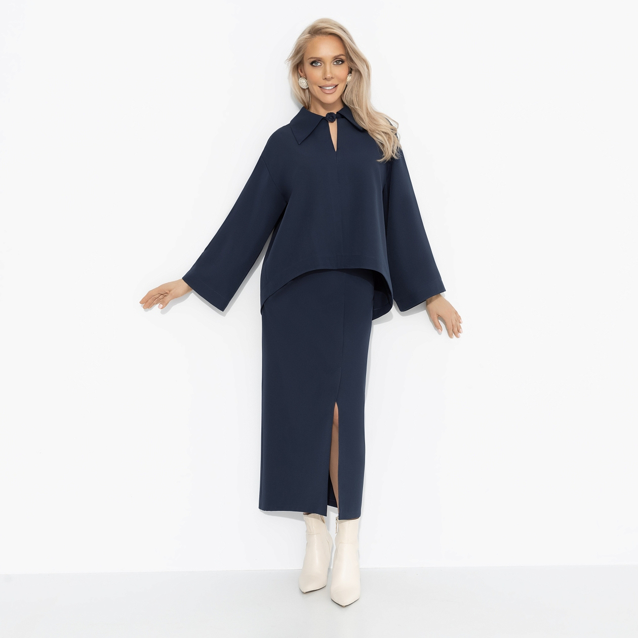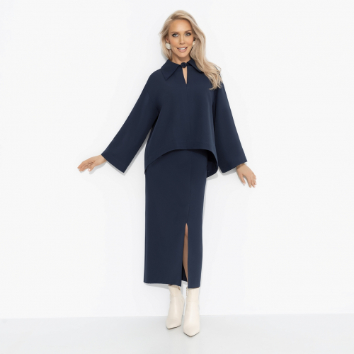 Оттенок темного индиго – для зимнего офиса, где важна уверенность в каждом движении. Костюм ЧАРУТТИ поможет легко привлекать внимание партнёров и инвесторов, вести важные переговоры и быть магнитом для деловых перспектив. Строгий крой и длина подчеркивают профессионализм, но пространство для индивидуальности и комплиментов остаётся.