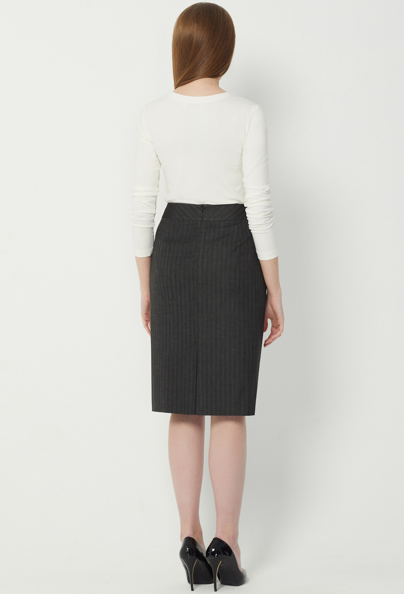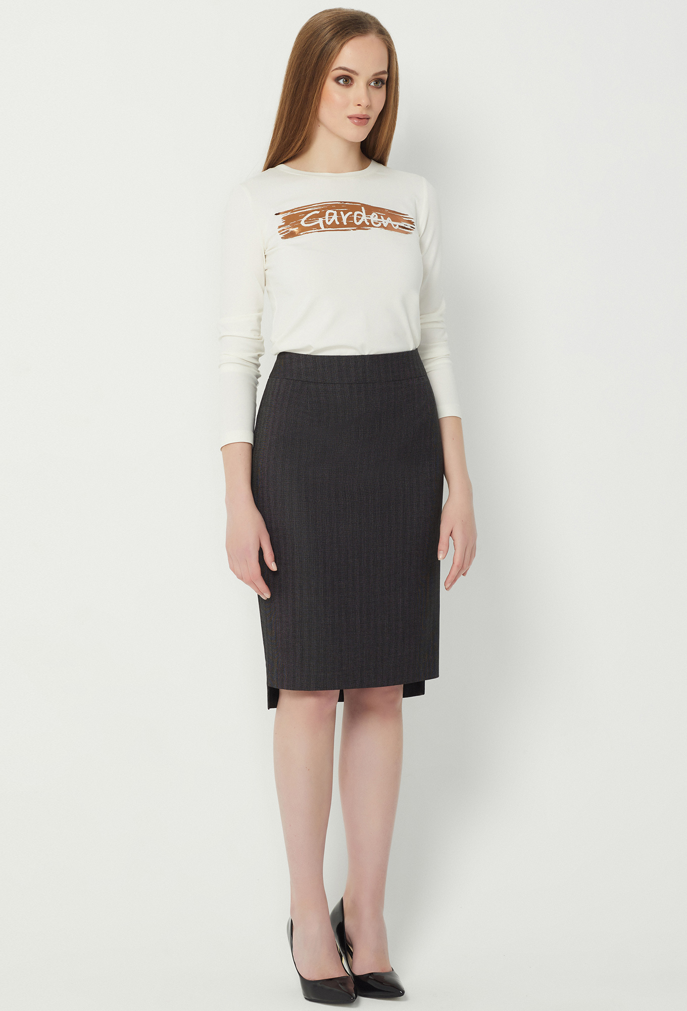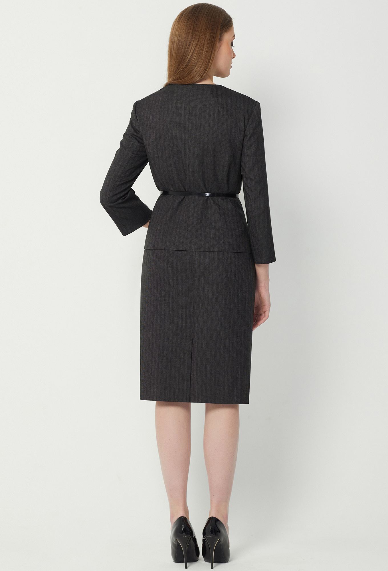 Модель: Солеи 3488/3489 т.серый Р..показатьост: 170 см (девушка на фото 170см) Сезон: Круглогодичный Тип ткани: 65% полиэстер, 32% вискоза, 3% эластанДвубортный жакет полуприлегающего силуэта с застежкой на две кнопки и две потайные петли и пуговицы. Без воротника, с двумя широкими лацканами. Перед со смещенными рельефами, нагрудными вытачками и горизонтальными карманами с рамкой. Спинка со средним швом, двумя рельефами и двумя вытачками. Рукава втачные двухшовные. Изделие на подкладке. В качестве декора предложен ремень.   Юбка-карандаш с притачным поясом, средний шов с застежкой на потайную молнию, заканчивается шлицей. Задняя половина юбки длиннее передней на 4,5 см.